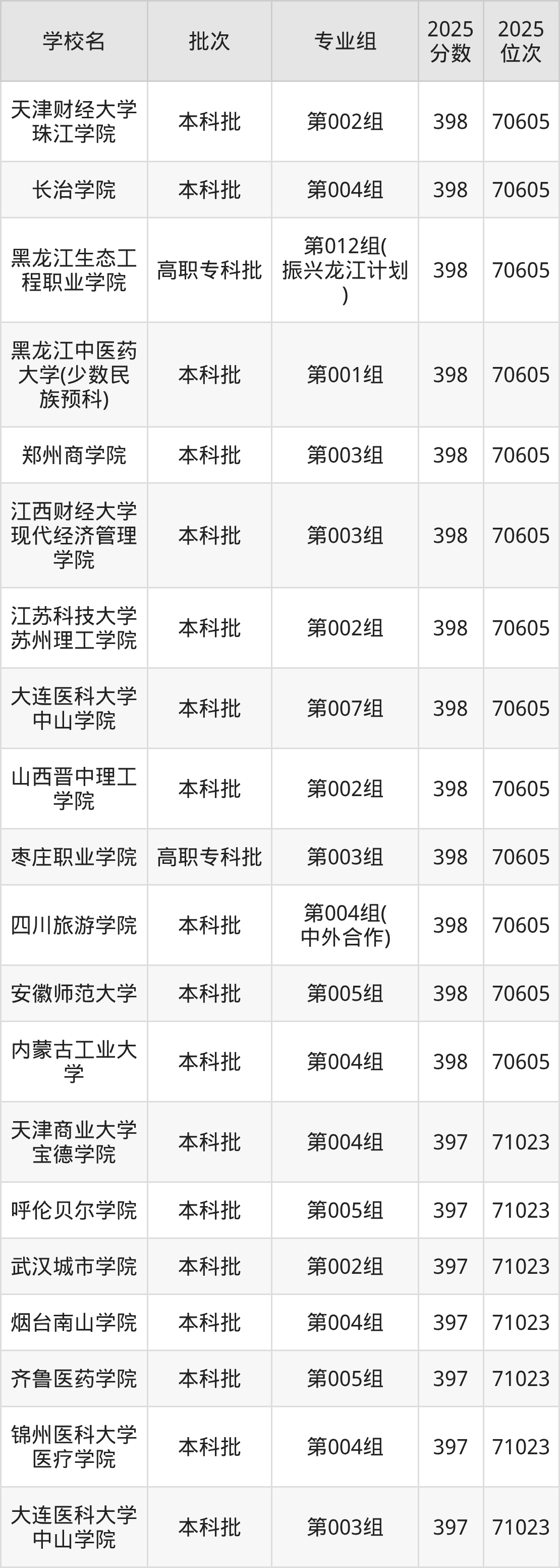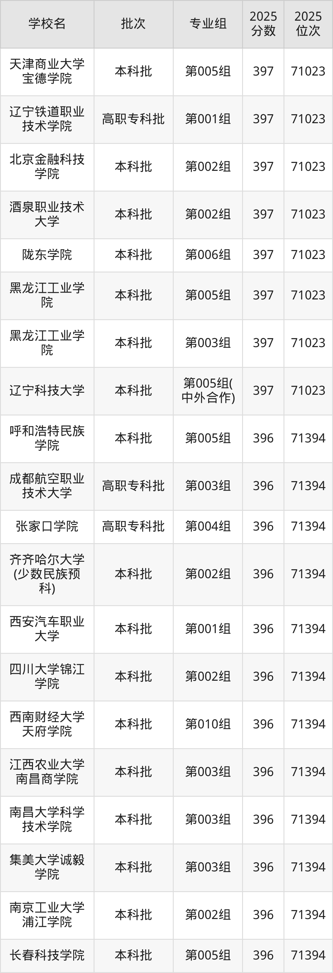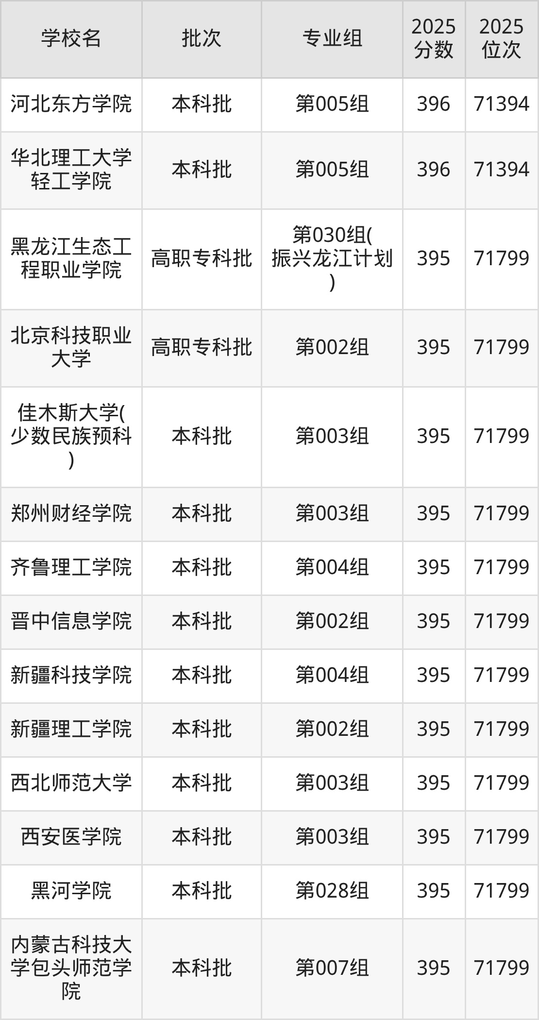 2025年黑龙江高考物理类396分(71024名~71394名)能上的大学有呼和浩特民族学院第005组、华北理工大学轻工学院第005组、河北东方学院第005组、长春科技学院第005组等。