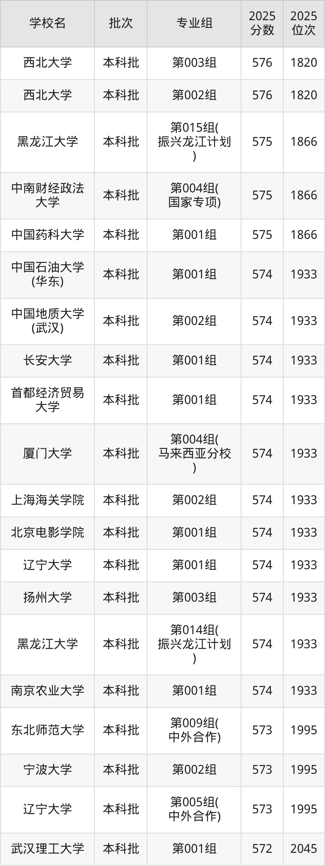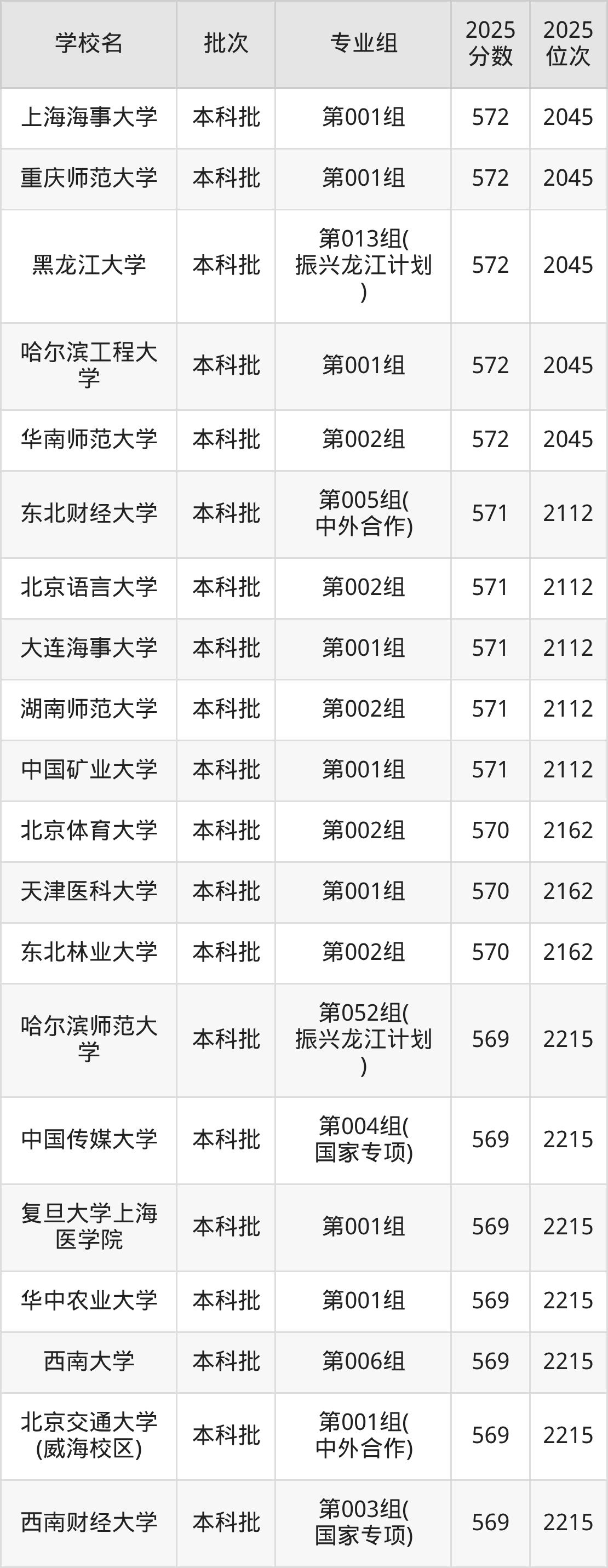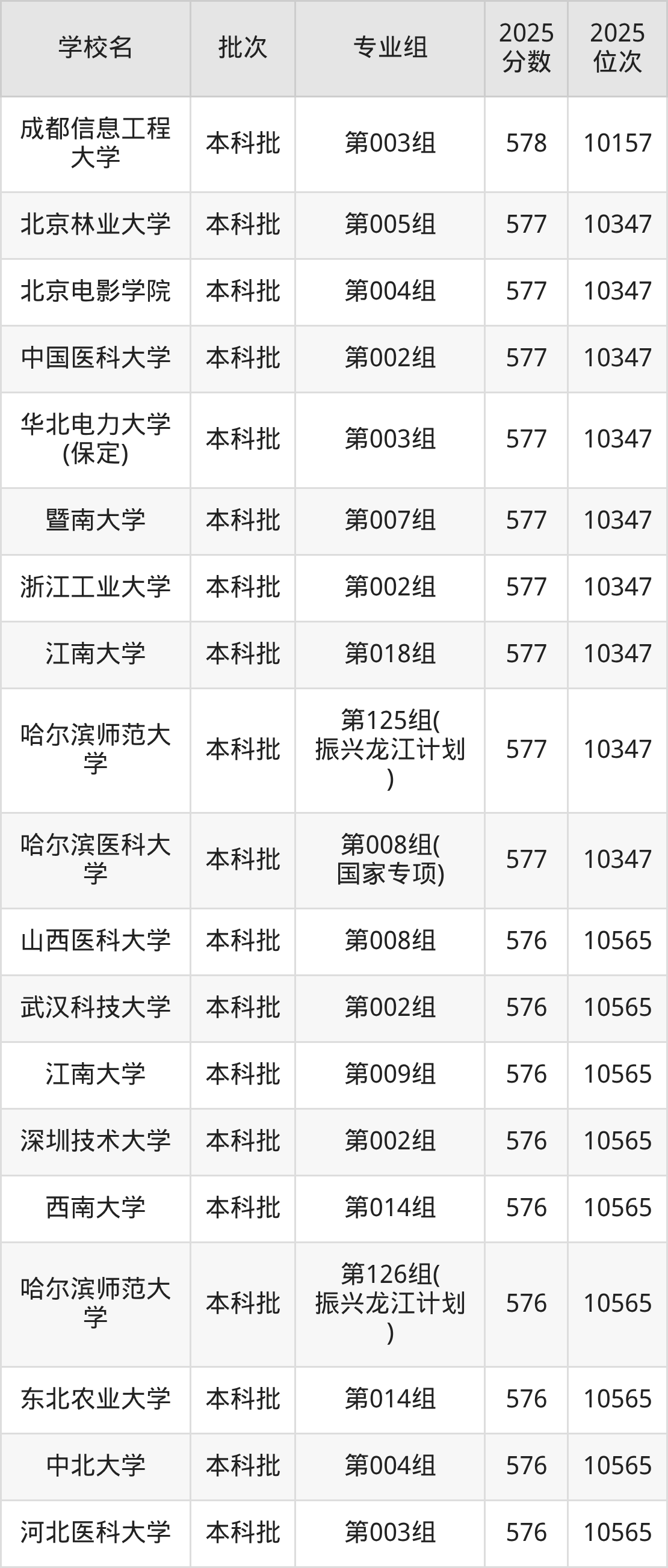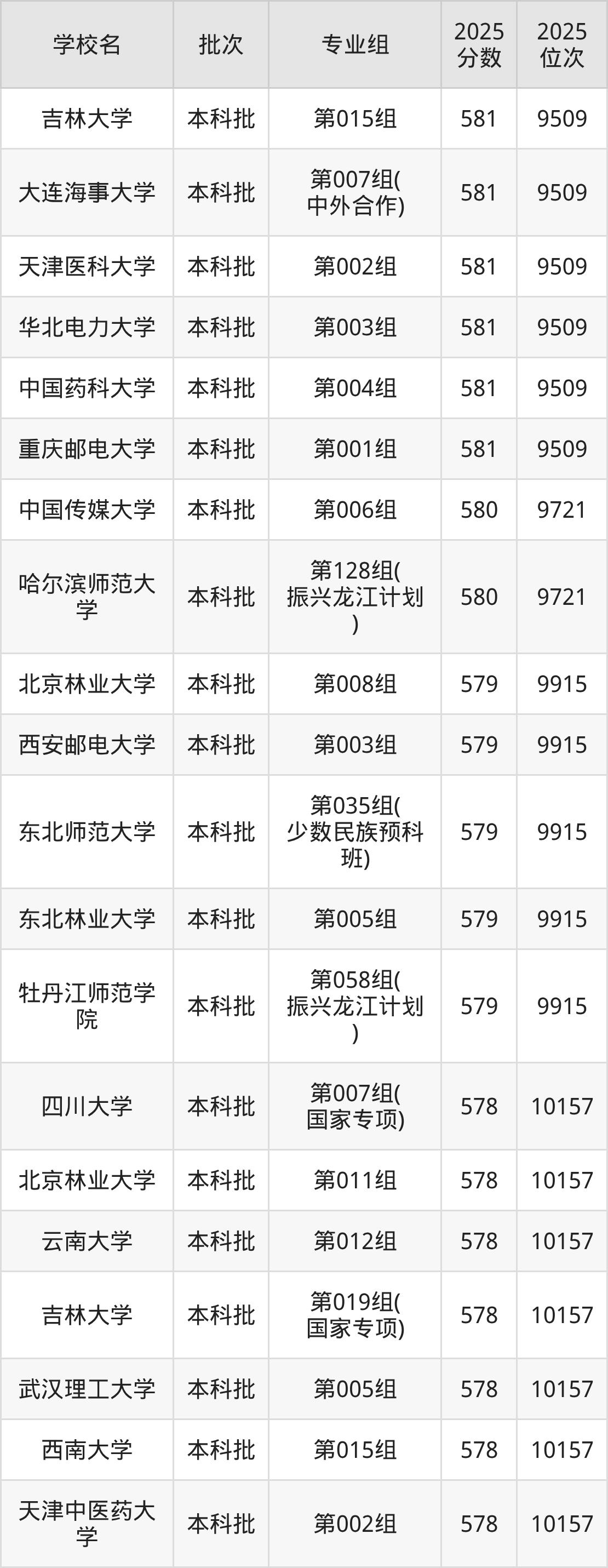 2025年黑龙江高考物理类578分(9916名~10157名)能上的大学有北京林业大学第011组、天津中医药大学第002组、吉林大学第019组(国家专项)、武汉理工大学第005组等。