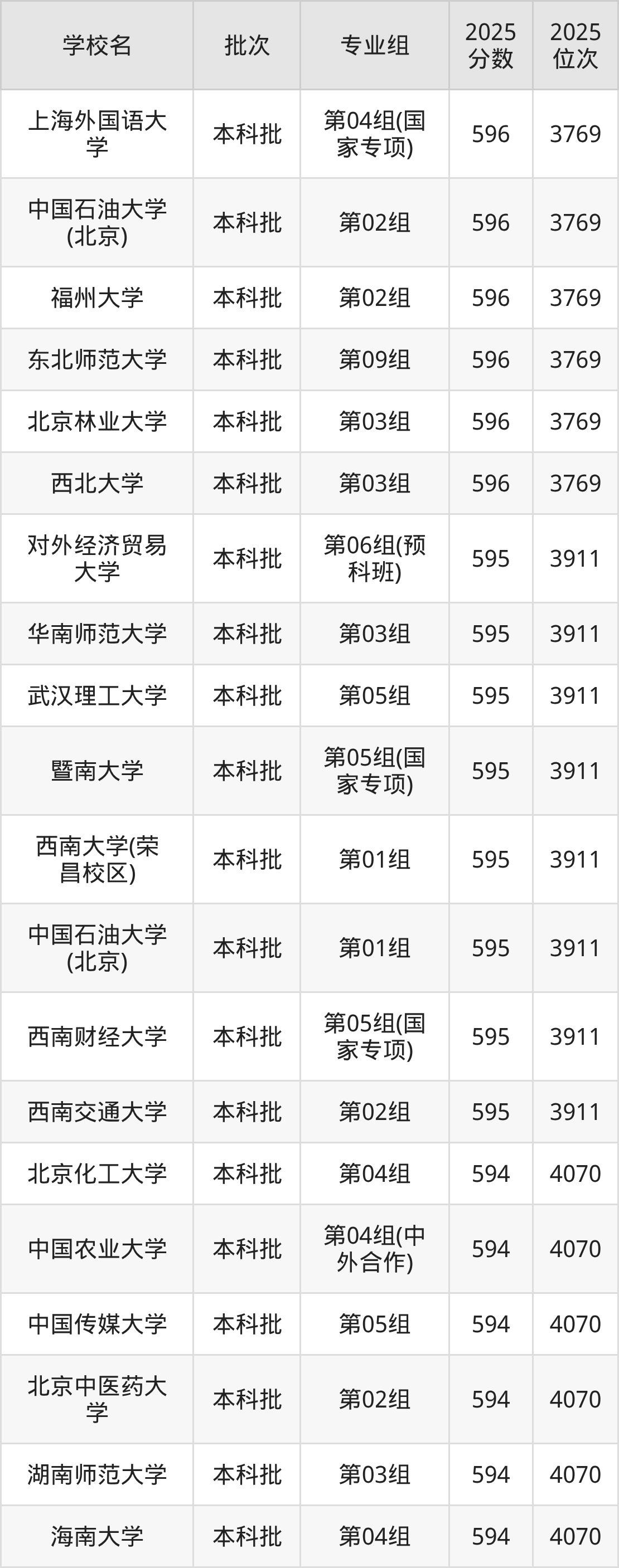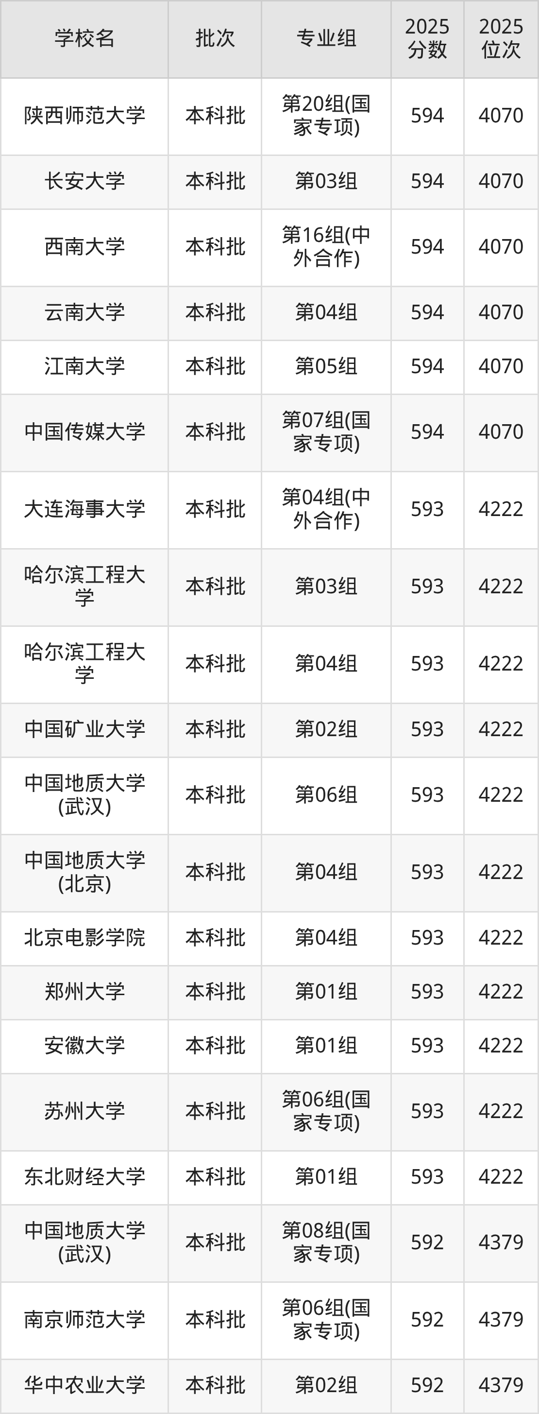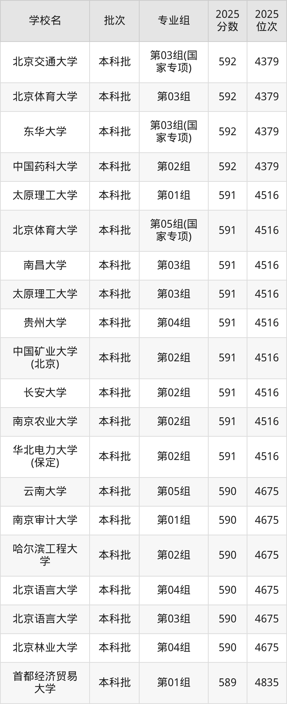 2025年湖北高考历史类592分(4223名~4379名)能上的大学有北京交通大学第03组(国家专项)、北京体育大学第03组、东华大学第03组(国家专项)、中国药科大学第02组等。
