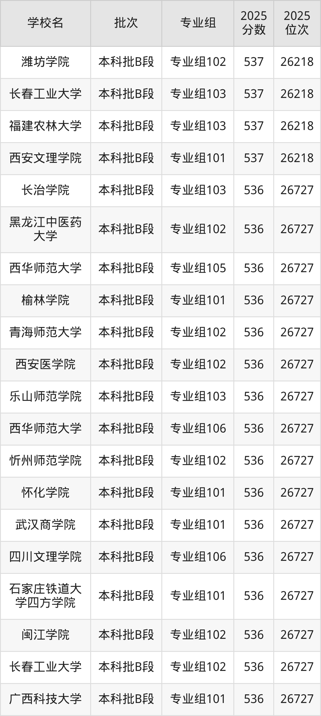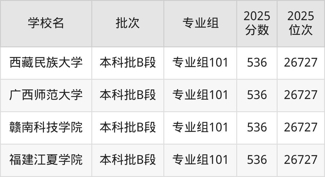2025年四川高考历史类536分(26219名~26727名)能上的大学有青海师范大学专业组102、黑龙江中医药大学专业组102、广西科技大学专业组101、西藏民族大学专业组101等。