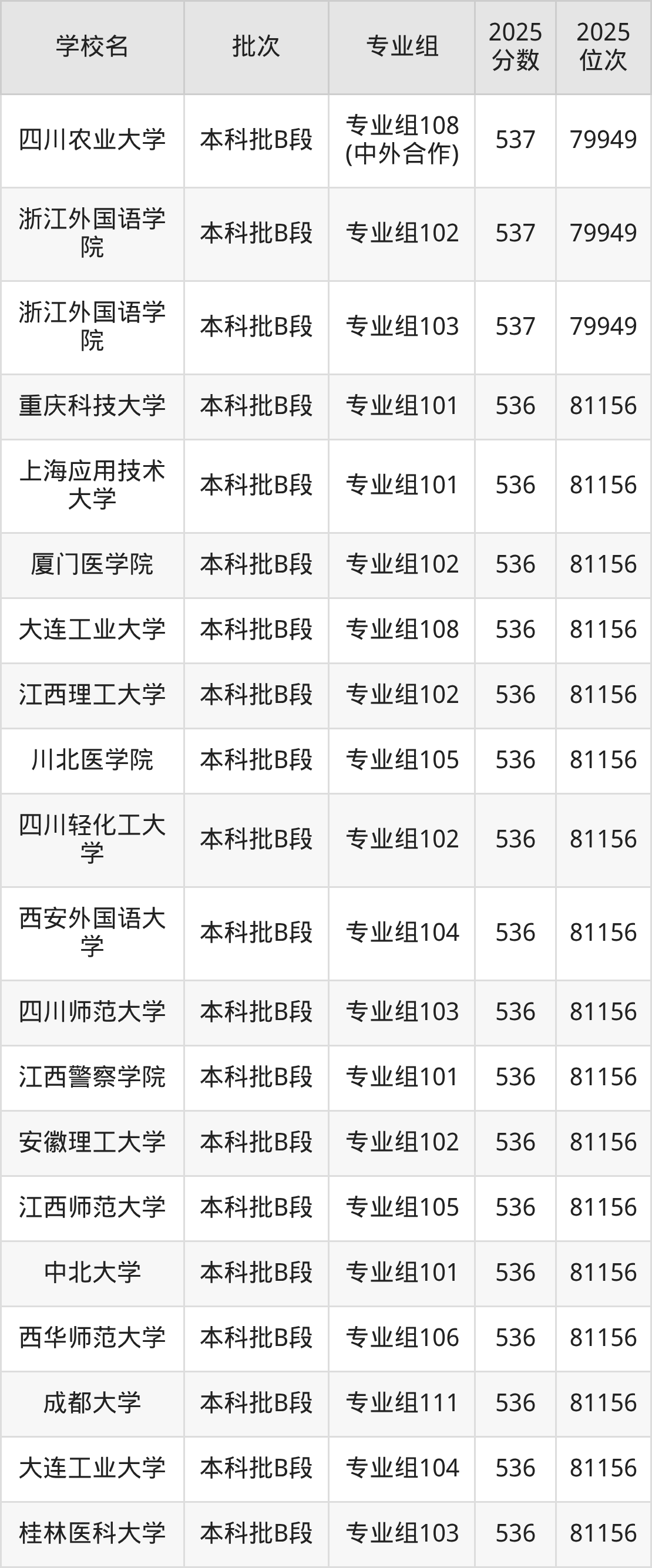 2025年四川高考物理类536分(79950名~81156名)能上的大学有厦门医学院专业组102、江西师范大学专业组105、重庆科技大学专业组101、川北医学院专业组105等。