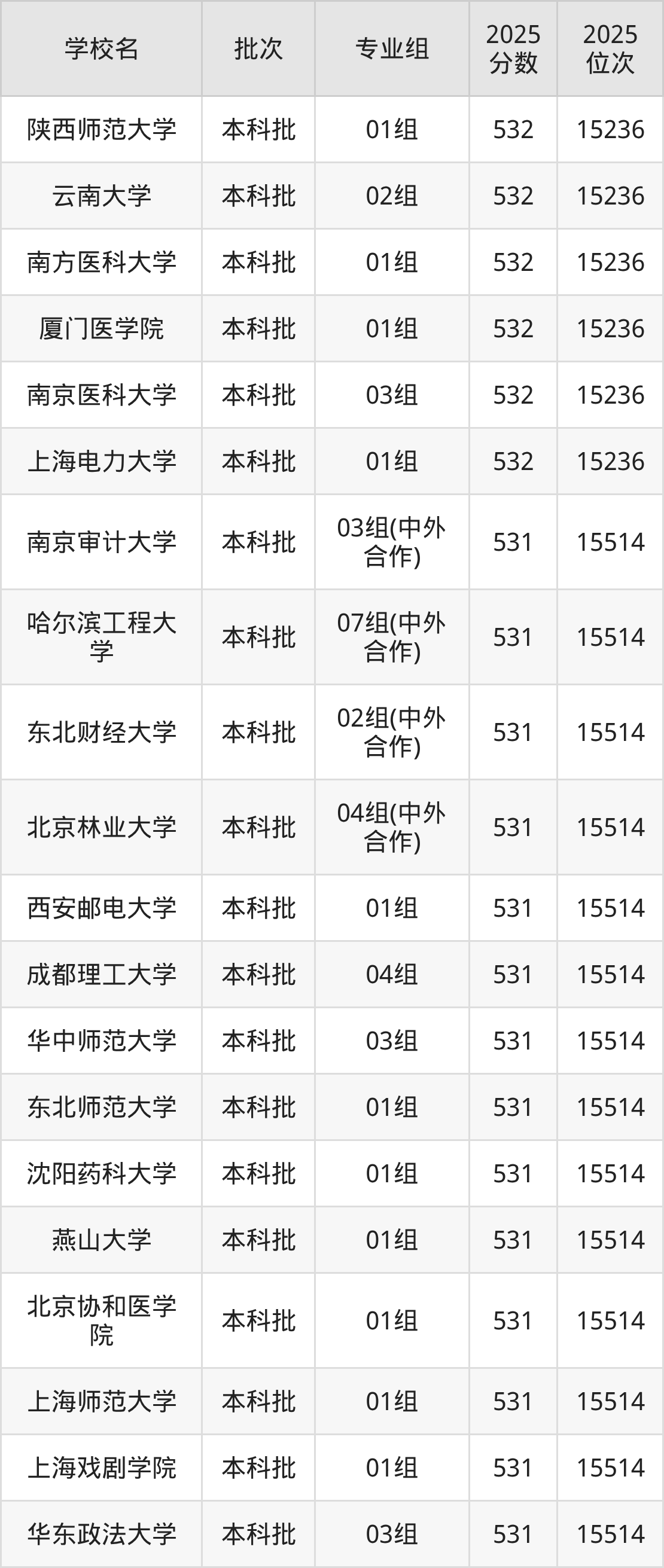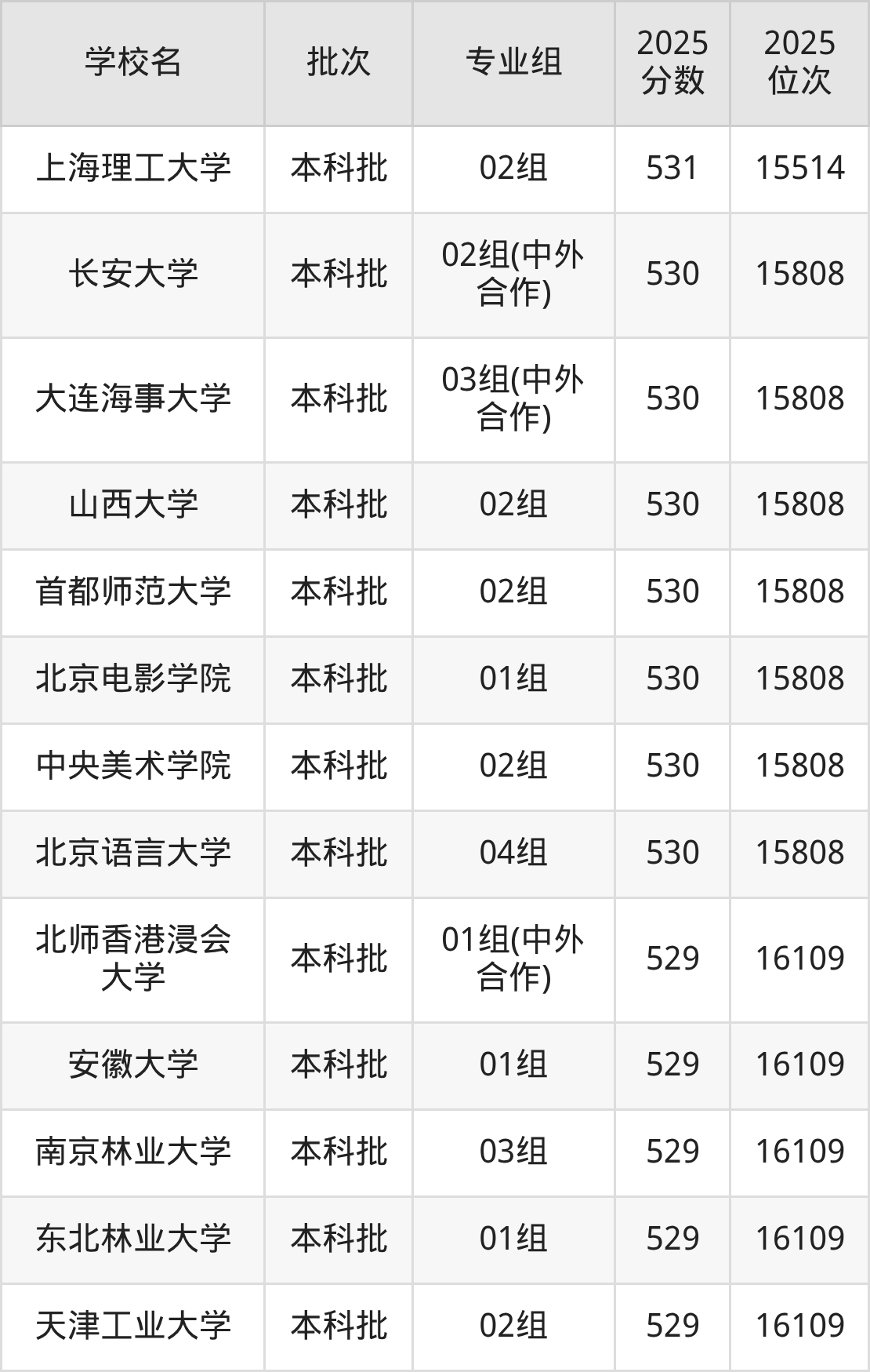 2025年上海高考530分(15515名~15808名)能上的大学有北京语言大学04组、中央美术学院02组、北京电影学院01组、首都师范大学02组等。