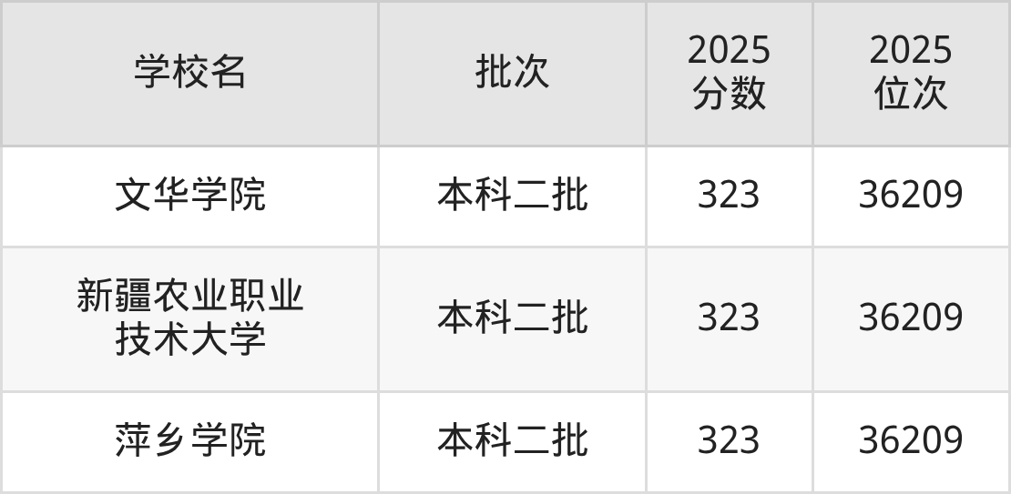 新疆高考325分:文科排名14935位、理科排名35826位。该分数位次对应能上的大学文科有桂林理工大学;理科有绥化学院、山东电力高等专科学校,更多名单如下文所示,2026届考生可参考。