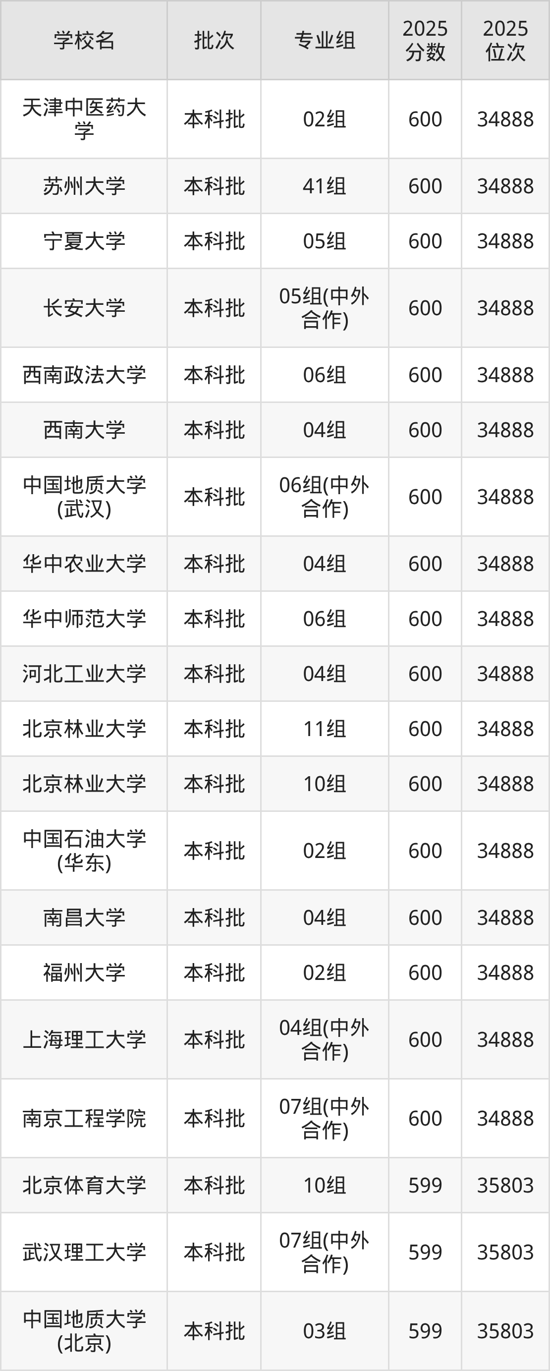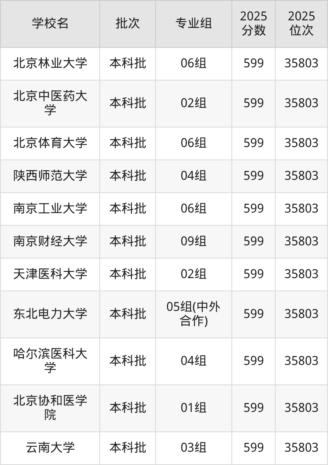2025年江苏高考物理类599分(34889名~35803名)能上的大学有南京工业大学06组、南京财经大学09组、中国地质大学(北京)03组、北京林业大学06组等。