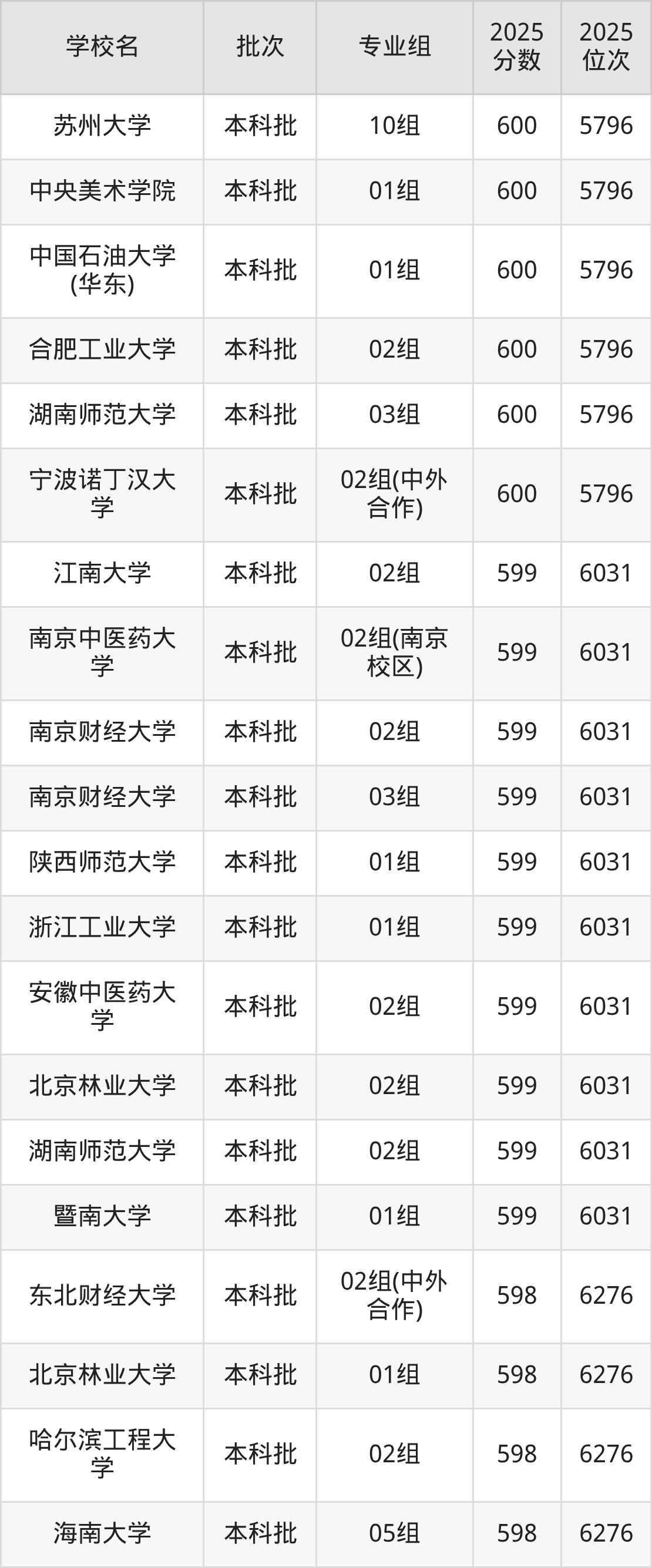 2025年江苏高考历史类599分(5797名~6031名)能上的大学有南京中医药大学02组(南京校区)、南京财经大学02组、南京财经大学03组、江南大学02组等。