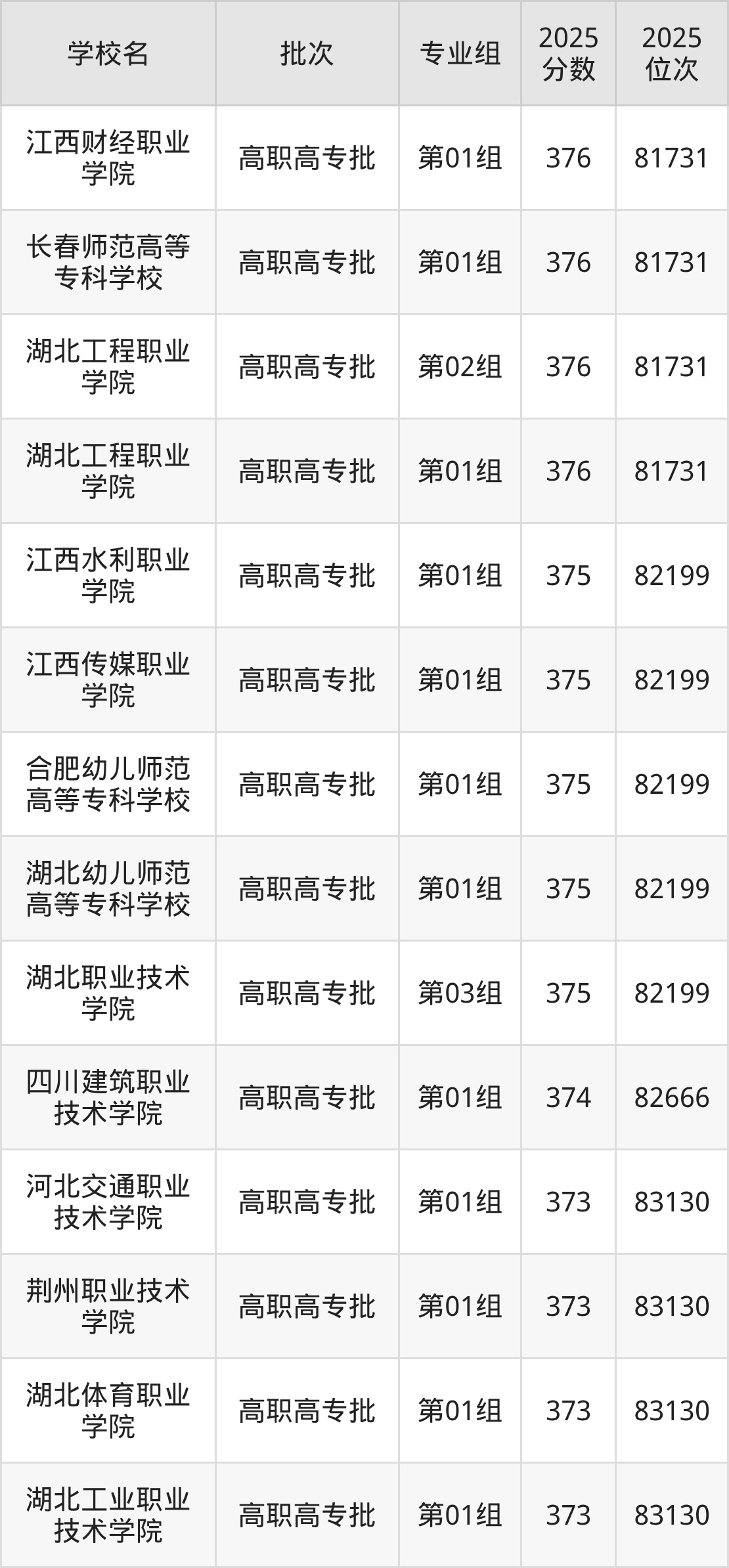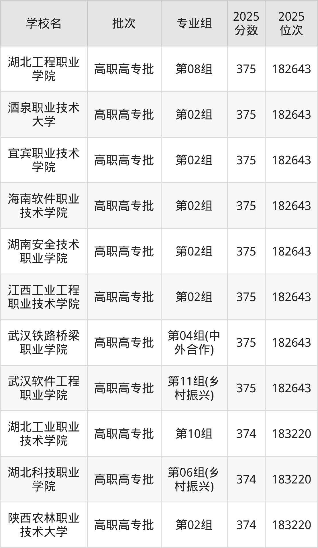 2025年湖北高考物理类374分(182644名~183220名)能上的大学有湖北科技职业学院第06组(乡村振兴)、湖北工业职业技术学院第10组、陕西农林职业技术大学第02组。