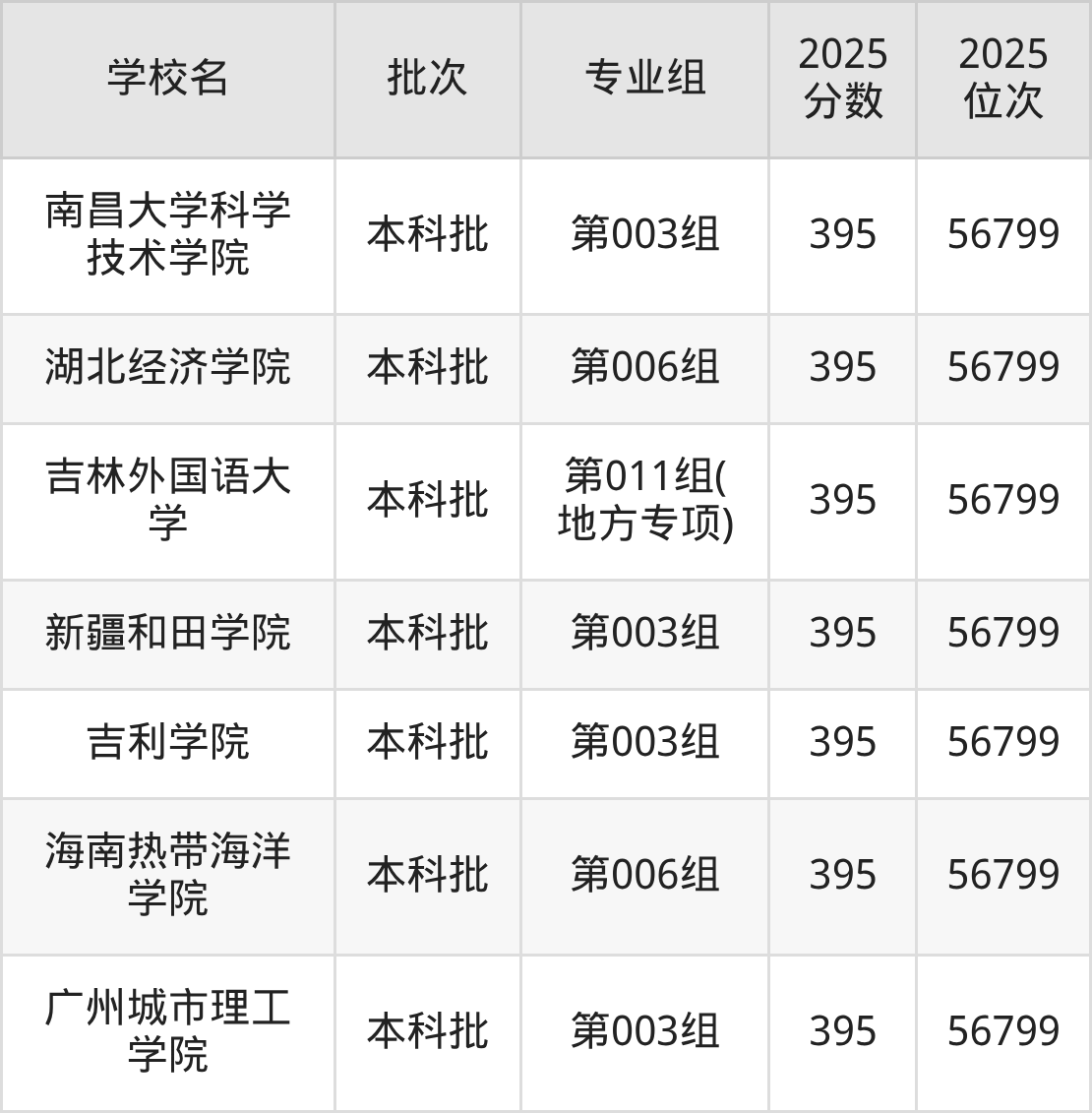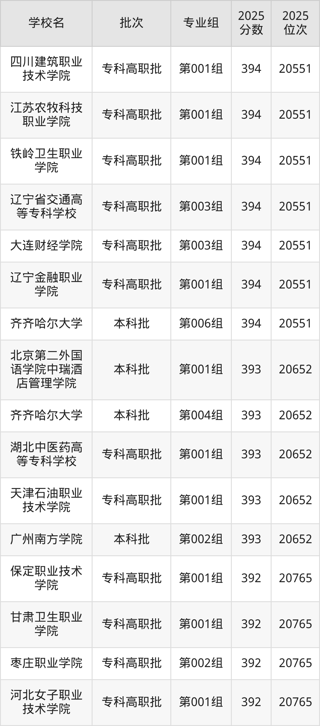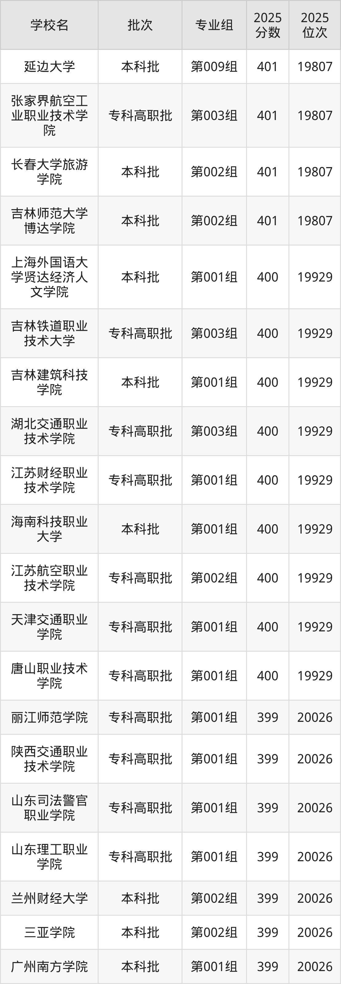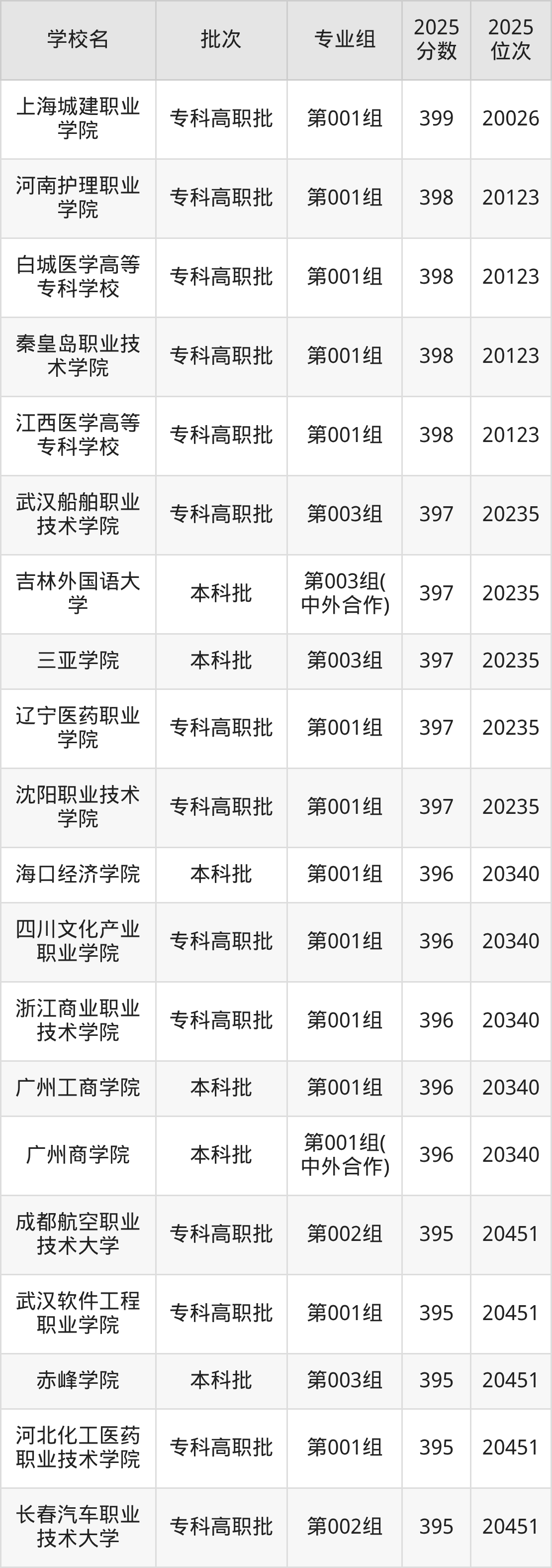 2025年吉林高考历史类396分(20236名~20340名)能上的大学有广州工商学院第001组、广州商学院第001组(中外合作)、海口经济学院第001组、浙江商业职业技术学院第001组等。