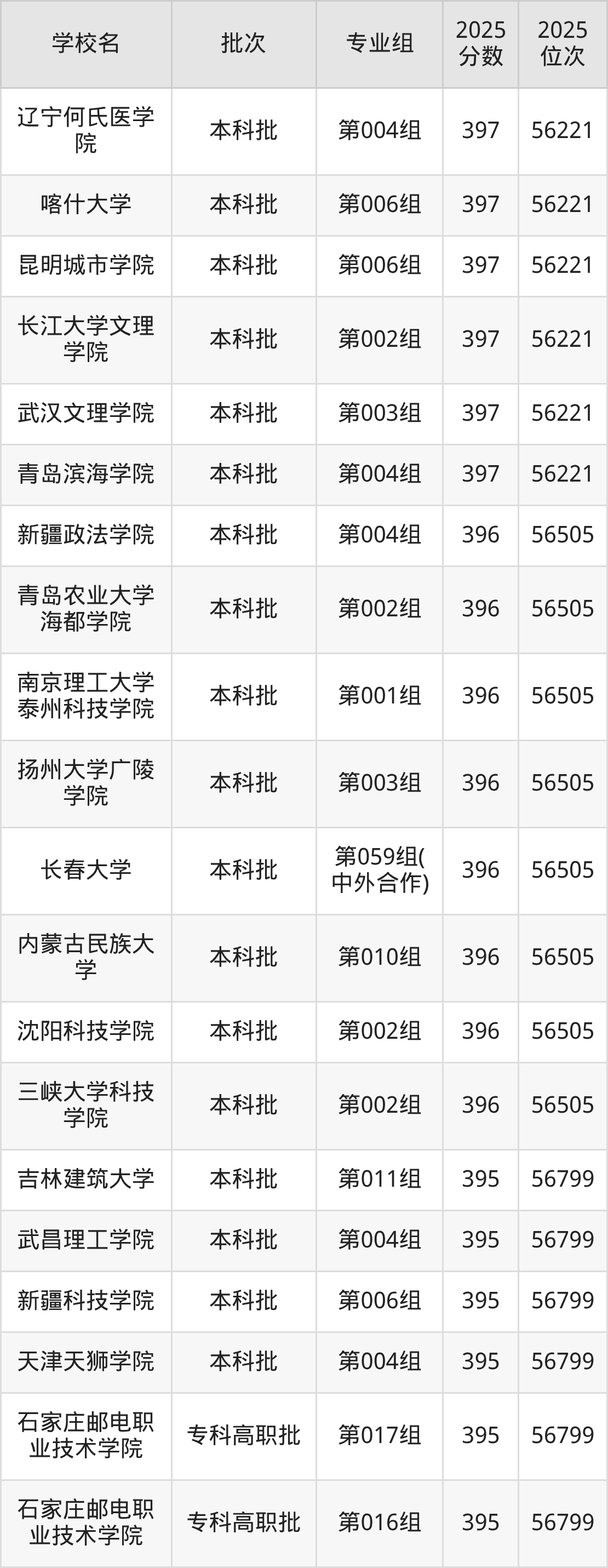2025年吉林高考物理类396分(56222名~56505名)能上的大学有内蒙古民族大学第010组、沈阳科技学院第002组、长春大学第059组(中外合作)、扬州大学广陵学院第003组等。