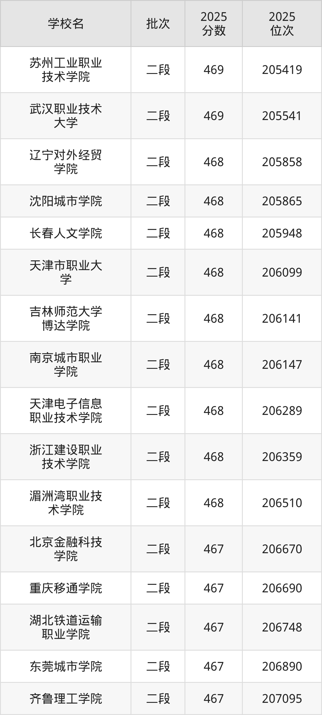 2025年浙江高考468分(205726名~206643名)能上的大学有沈阳城市学院、浙江建设职业技术学院、辽宁对外经贸学院、天津市职业大学等。