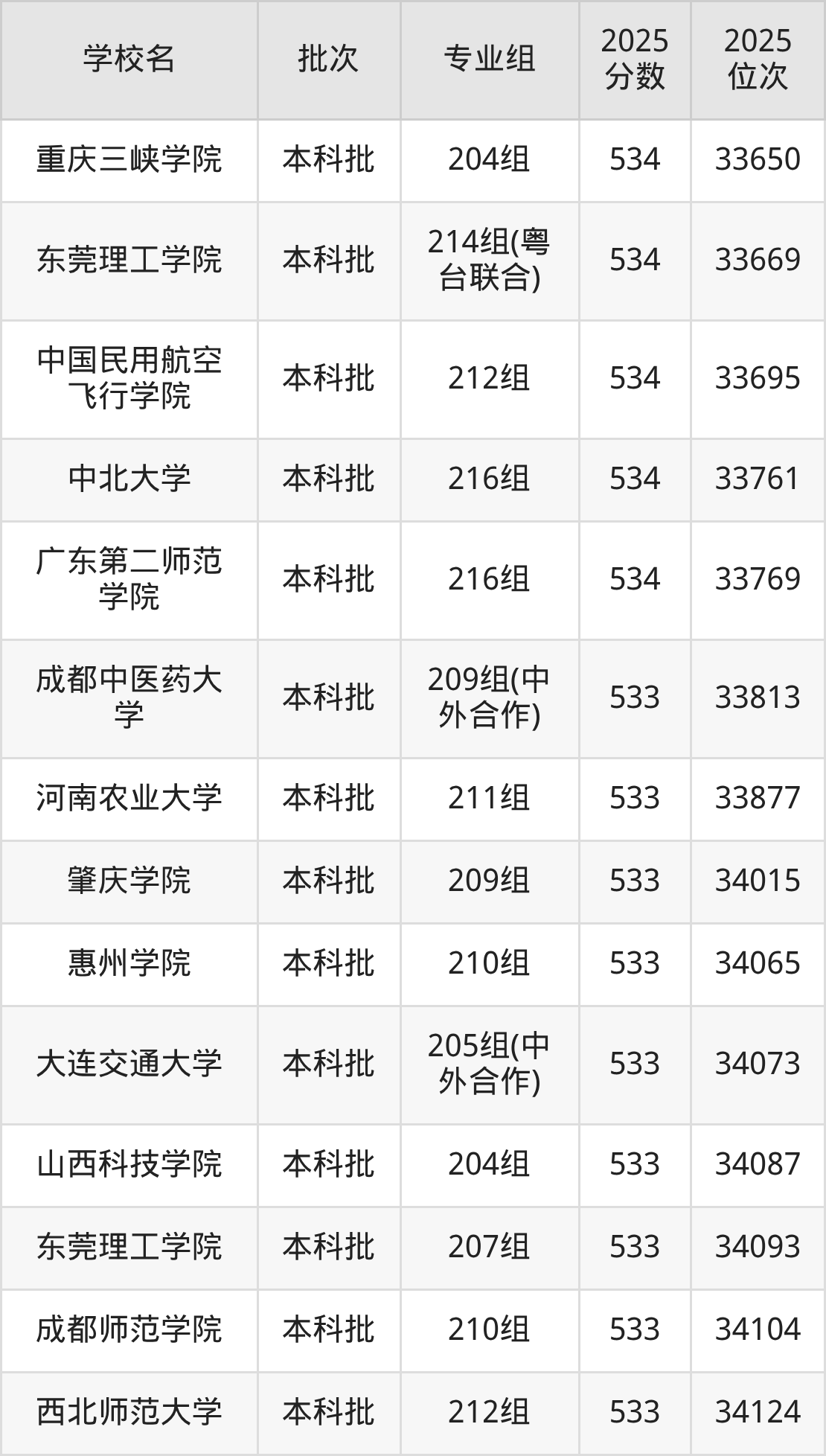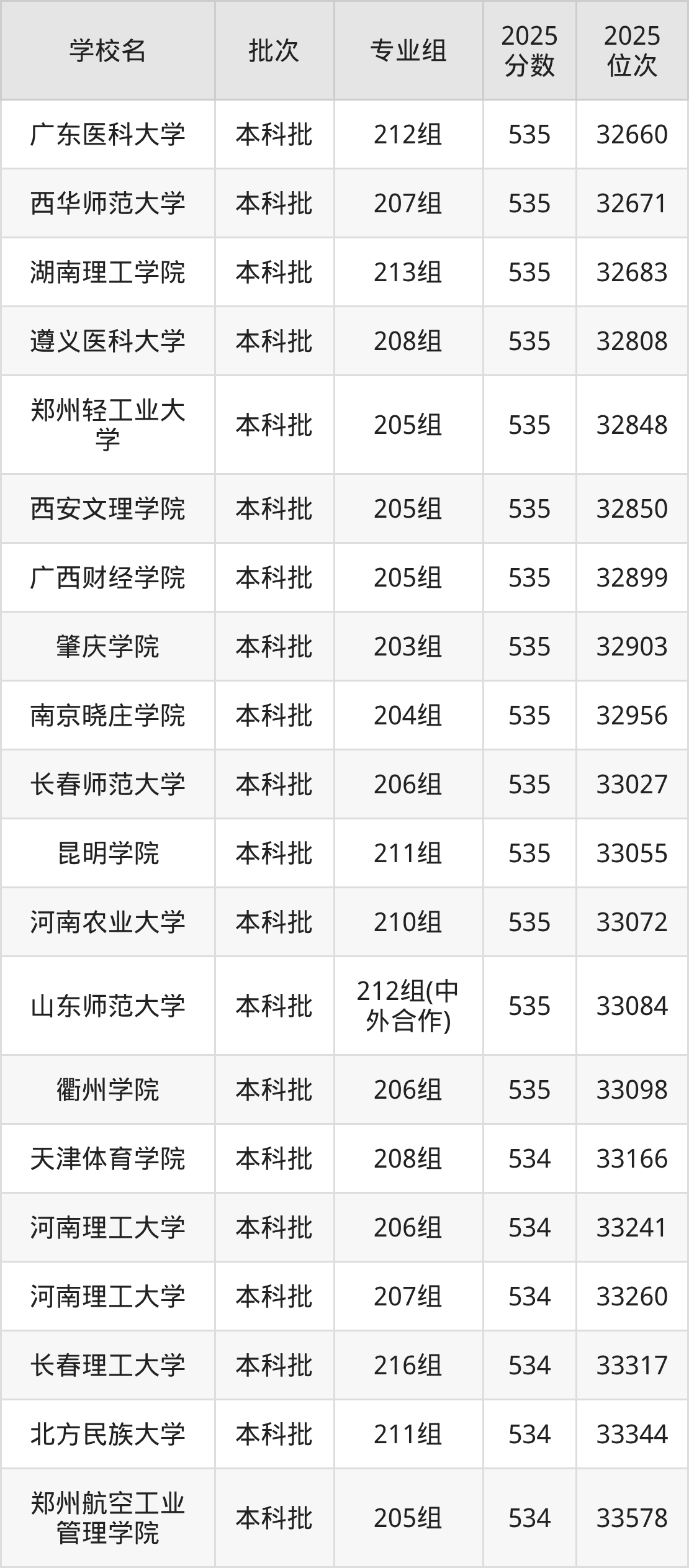 2025年广东高考历史类534分(33135名~33782名)能上的大学有天津体育学院208组、中北大学216组、长春理工大学216组、河南理工大学206组等。