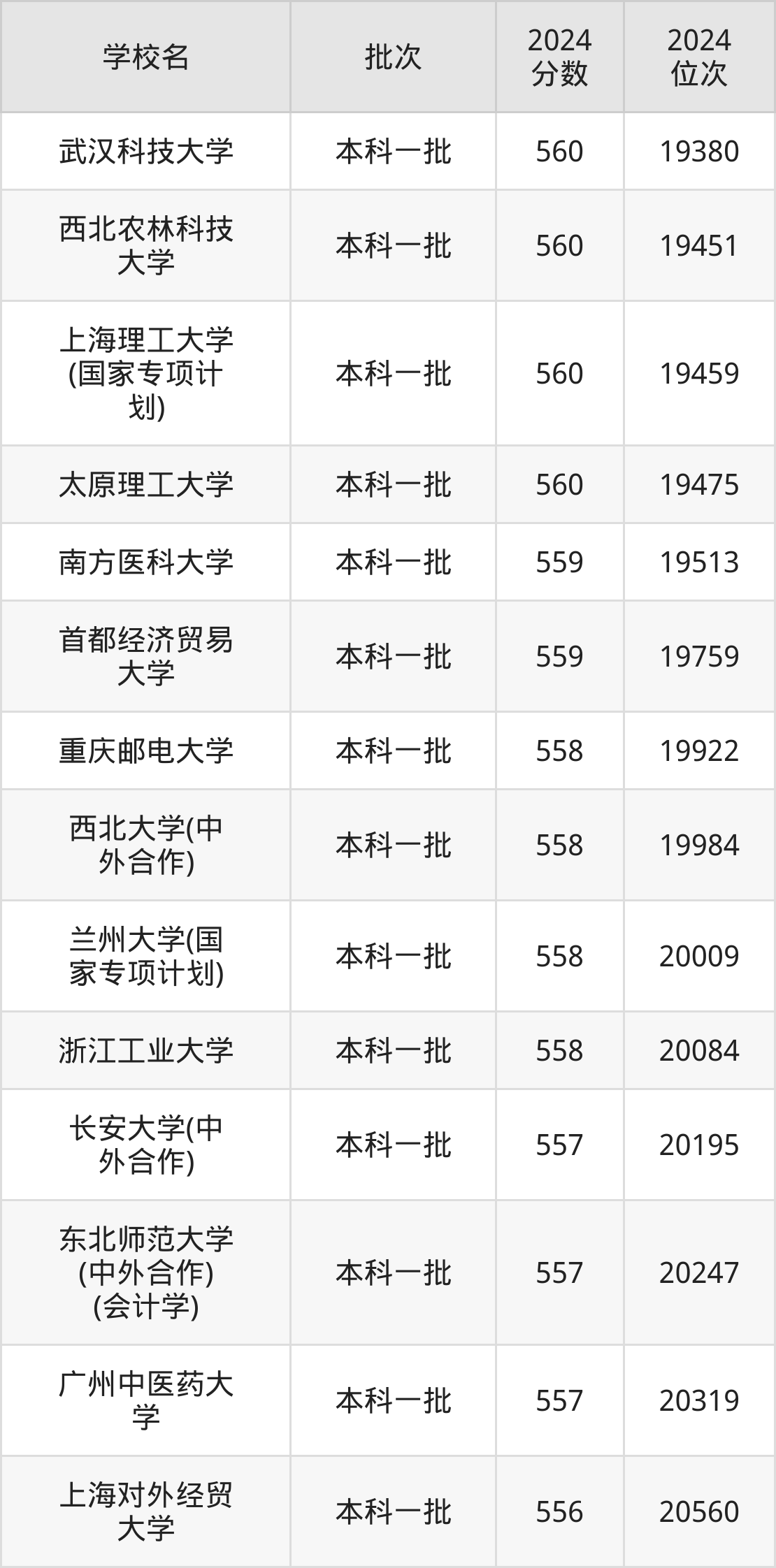 陕西高考558分:文科排名2578位、理科排名20165位。该分数位次对应能上的大学文科有中国石油大学(北京)、东北师范大学(国家专项计划);理科有浙江工业大学、重庆邮电大学,更多名单如下文所示,2025届考生可参考。