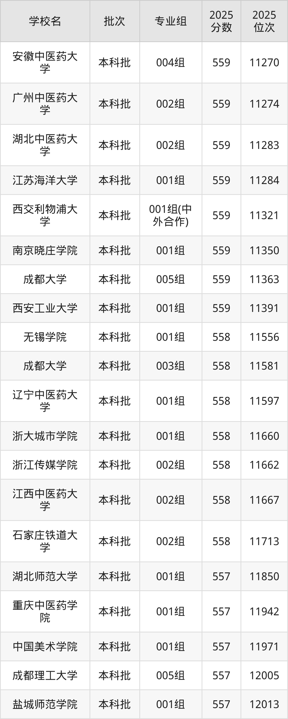 2025年安徽高考历史类557分(11739名~12014名)能上的大学有成都理工大学005组、重庆中医药学院001组、湖北师范大学001组、盐城师范学院001组等。