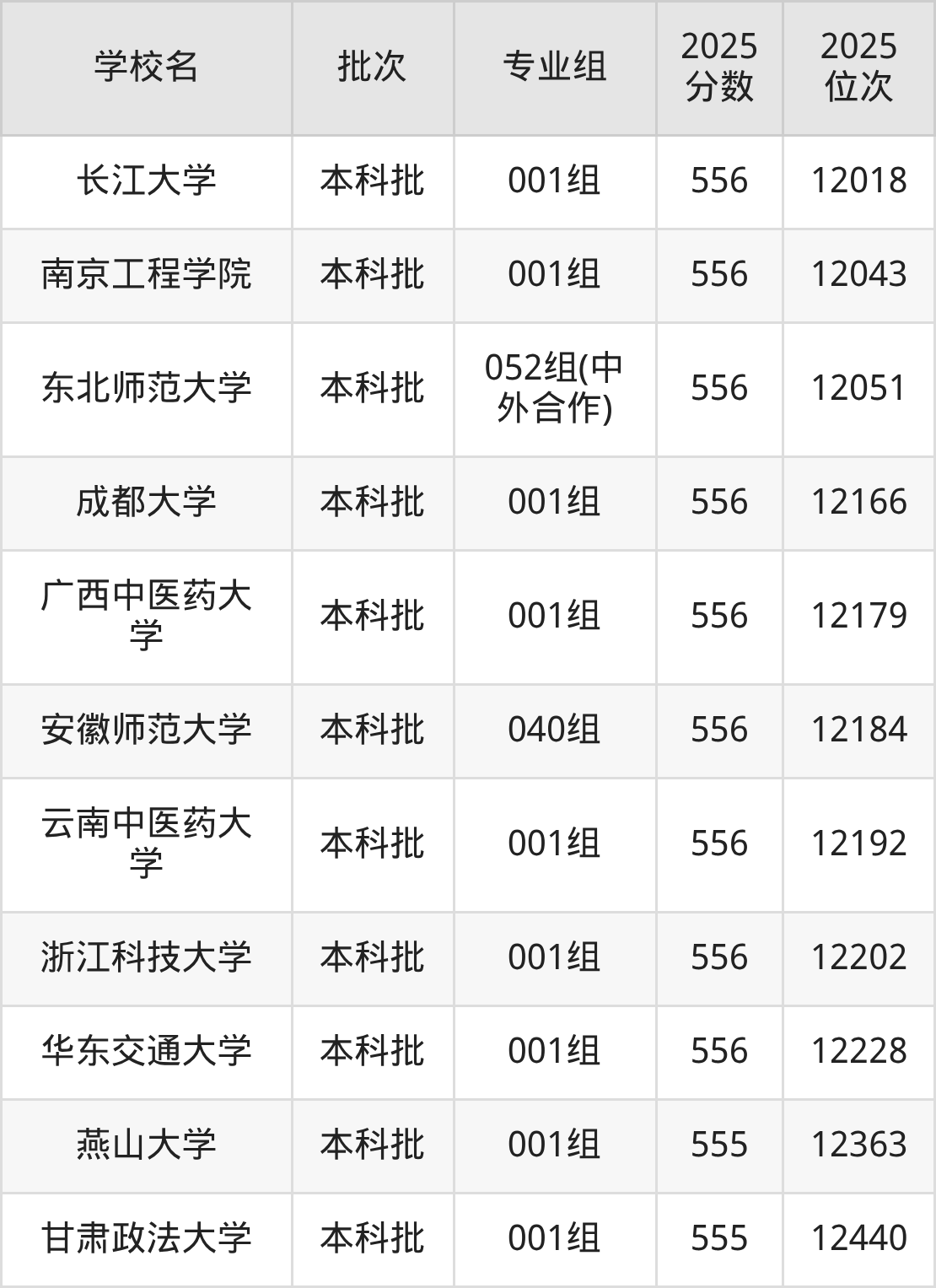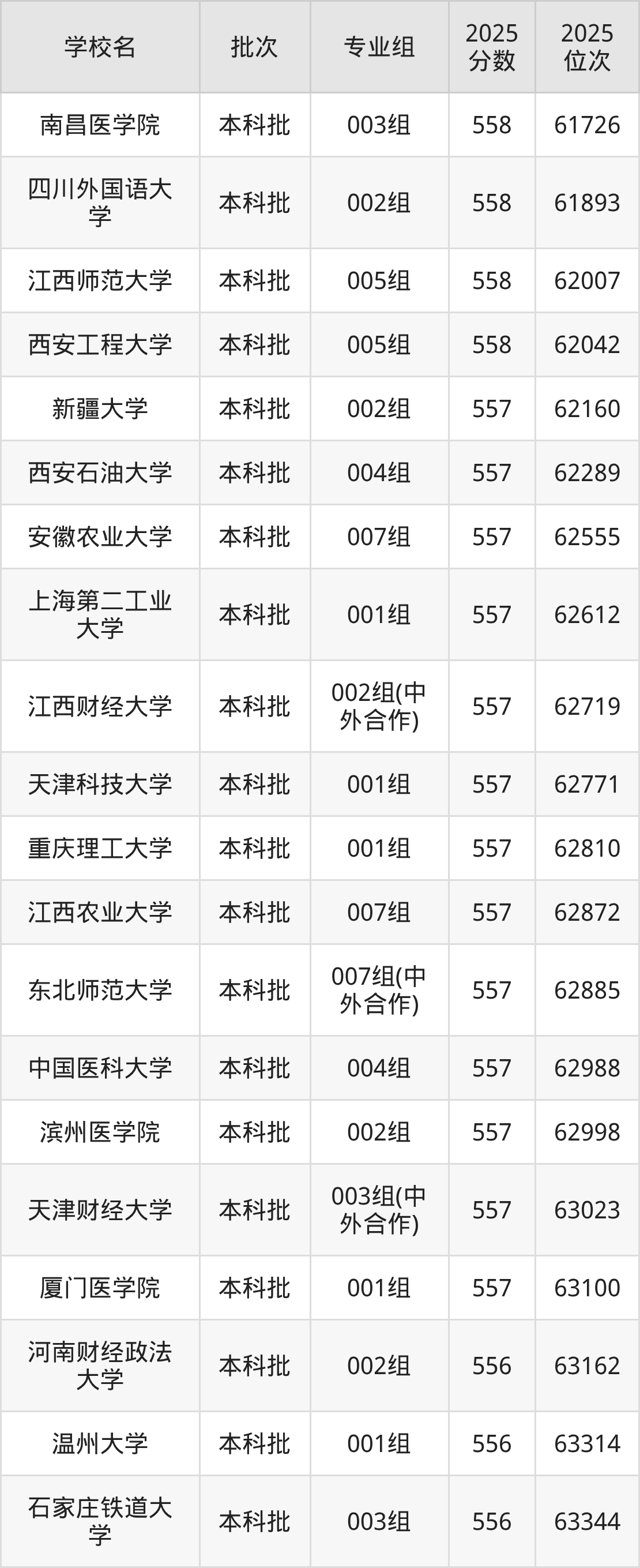 2025年安徽高考物理类557分(62126名~63155名)能上的大学有滨州医学院002组、重庆理工大学001组、东北师范大学007组(中外合作)、江西财经大学002组(中外合作)等。