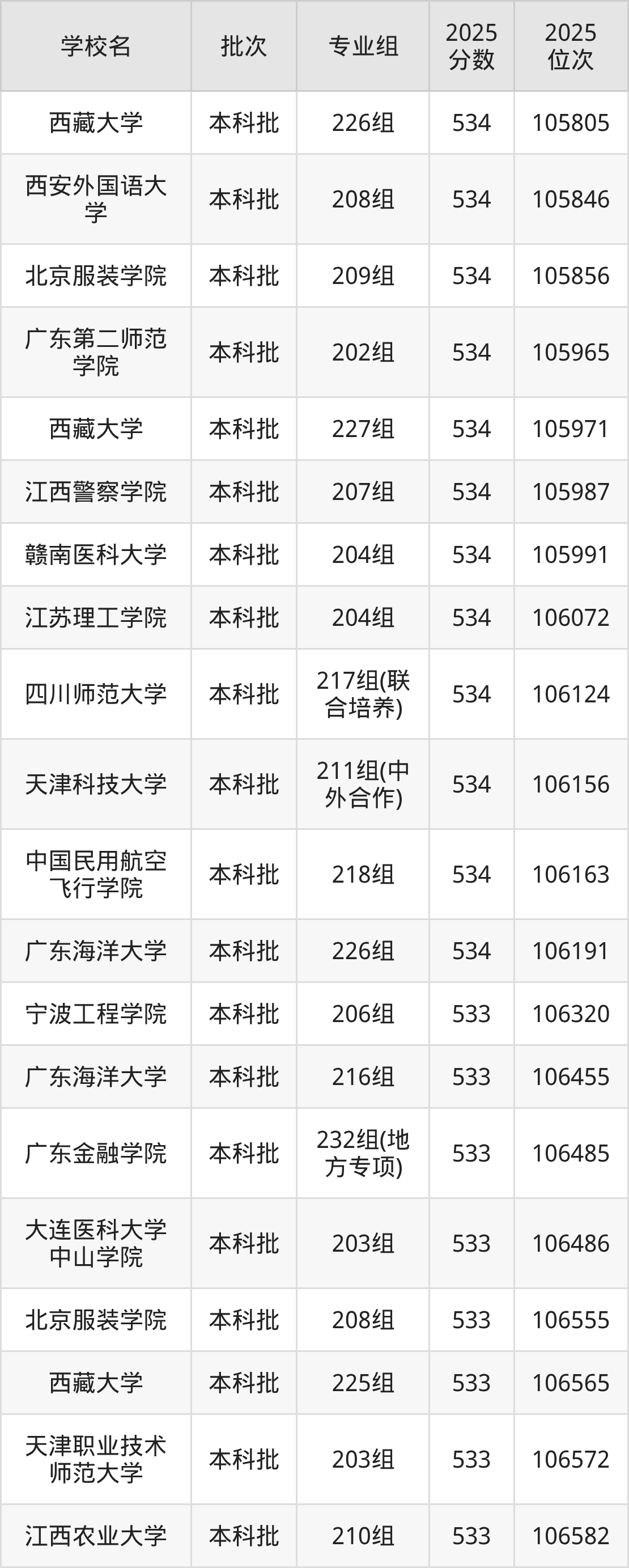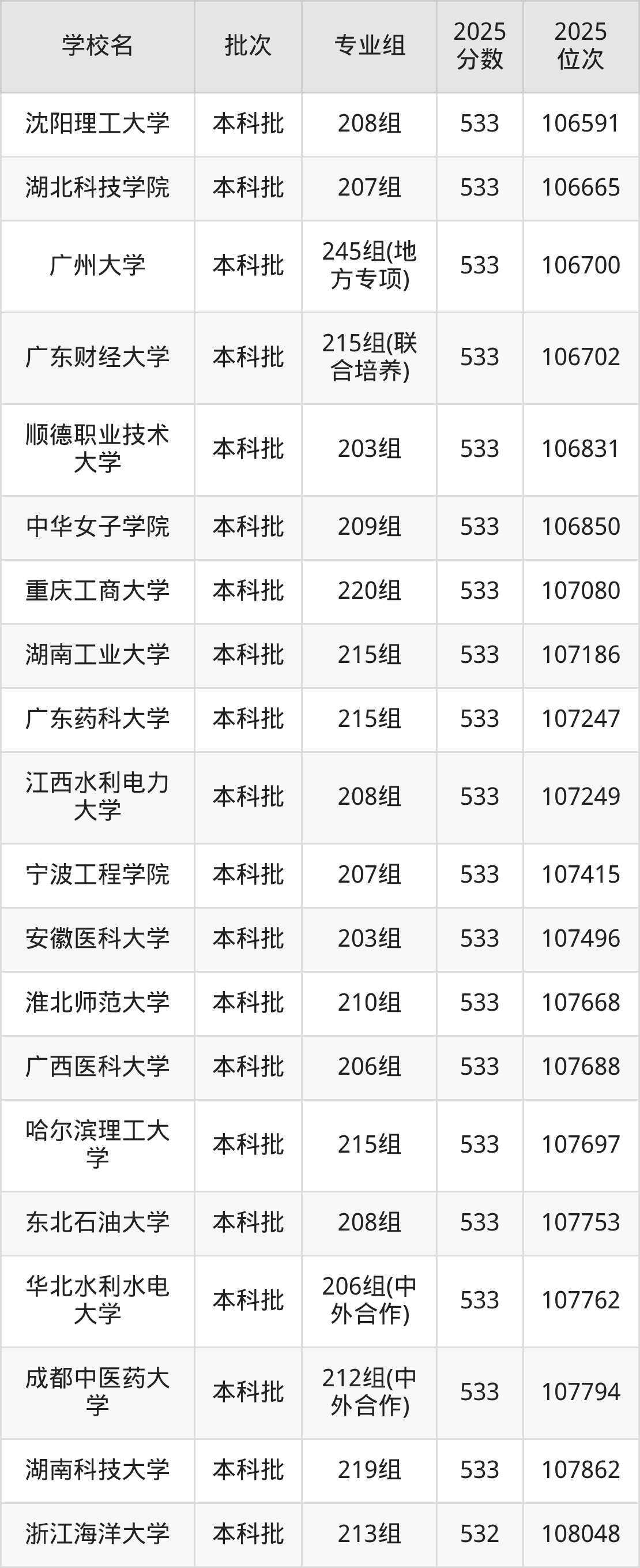 2025年广东高考物理类533分(106294名~107881名)能上的大学有北京服装学院208组、天津职业技术师范大学203组、华北水利水电大学206组(中外合作)、沈阳理工大学208组等。