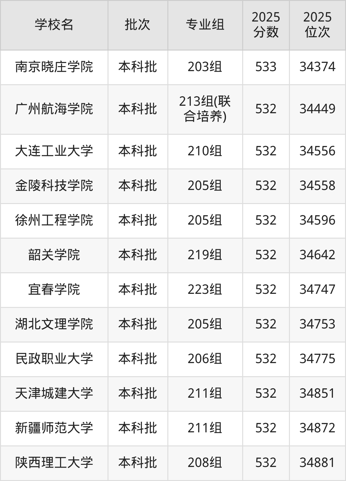 2025年广东高考历史类533分(33783名~34382名)能上的大学有河北地质大学204组、大连交通大学205组(中外合作)、河南农业大学211组、惠州学院210组等。