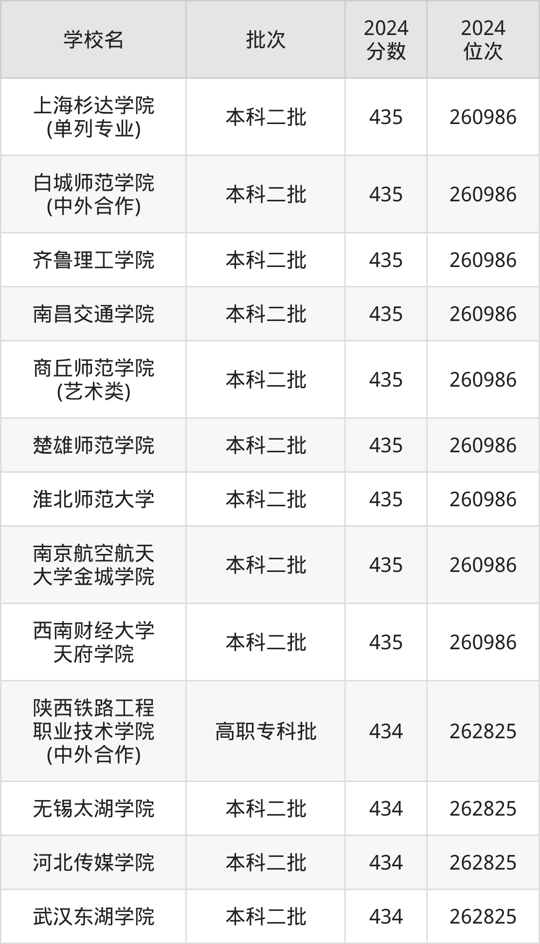 2024年河南高考理科434分(260987名~262825名)能上的大学有武汉东湖学院、河北传媒学院、无锡太湖学院、陕西铁路工程职业技术学院(中外合作)。