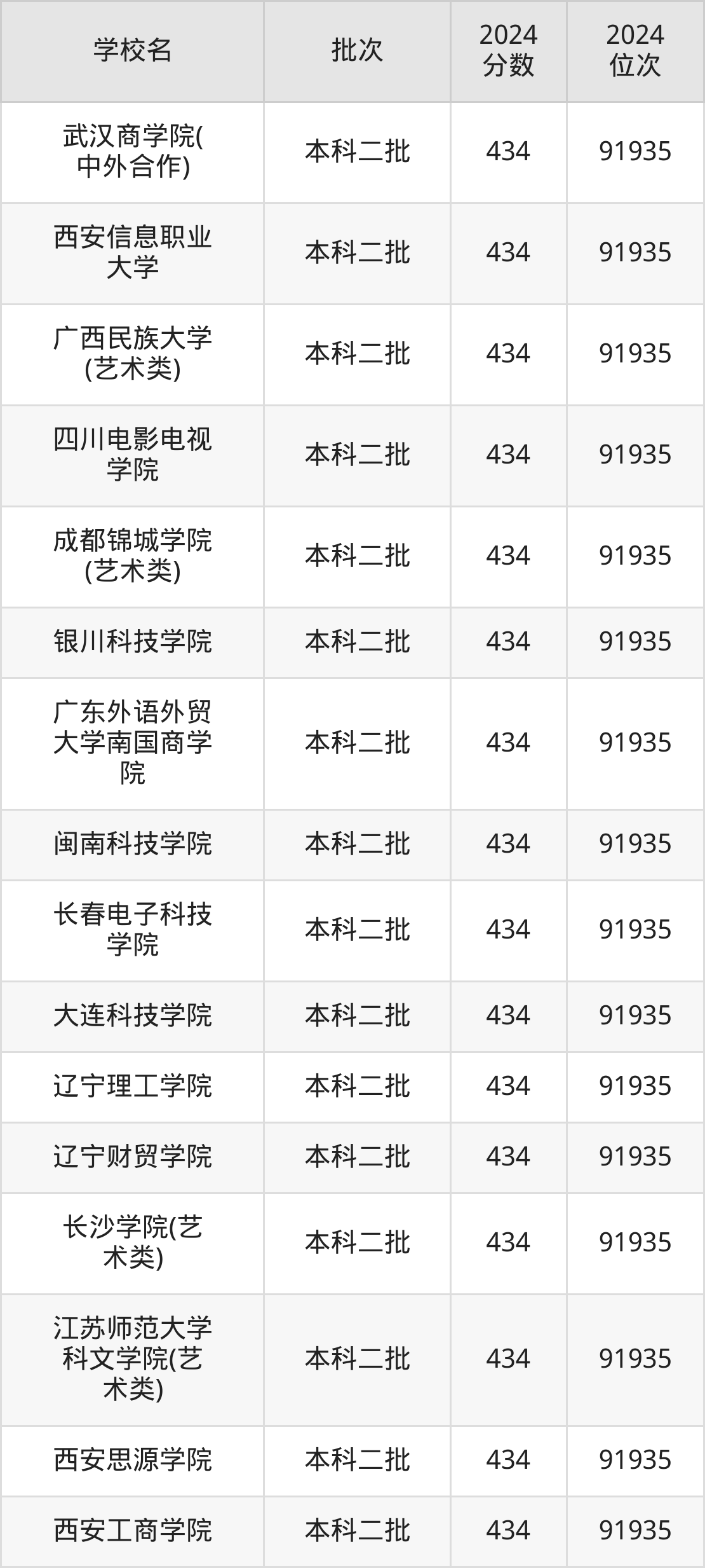 2024年河南高考文科434分(90951名~91935名)能上的大学有吉林艺术学院、广东外语外贸大学南国商学院、大连科技学院、西安工商学院等。