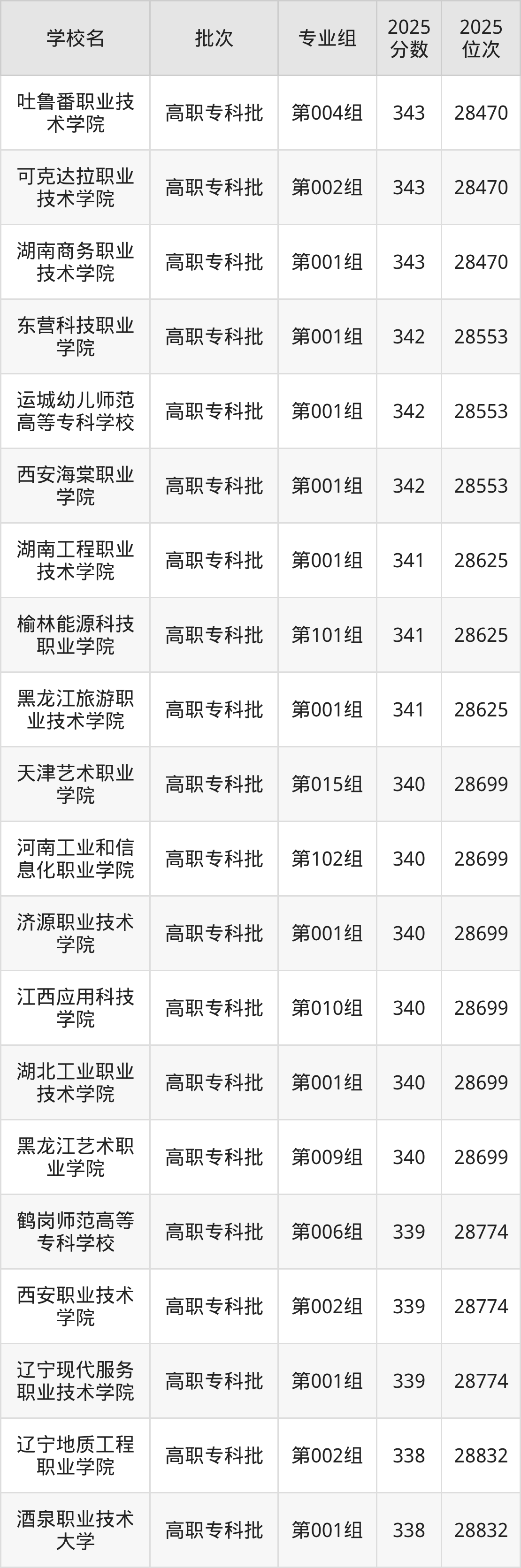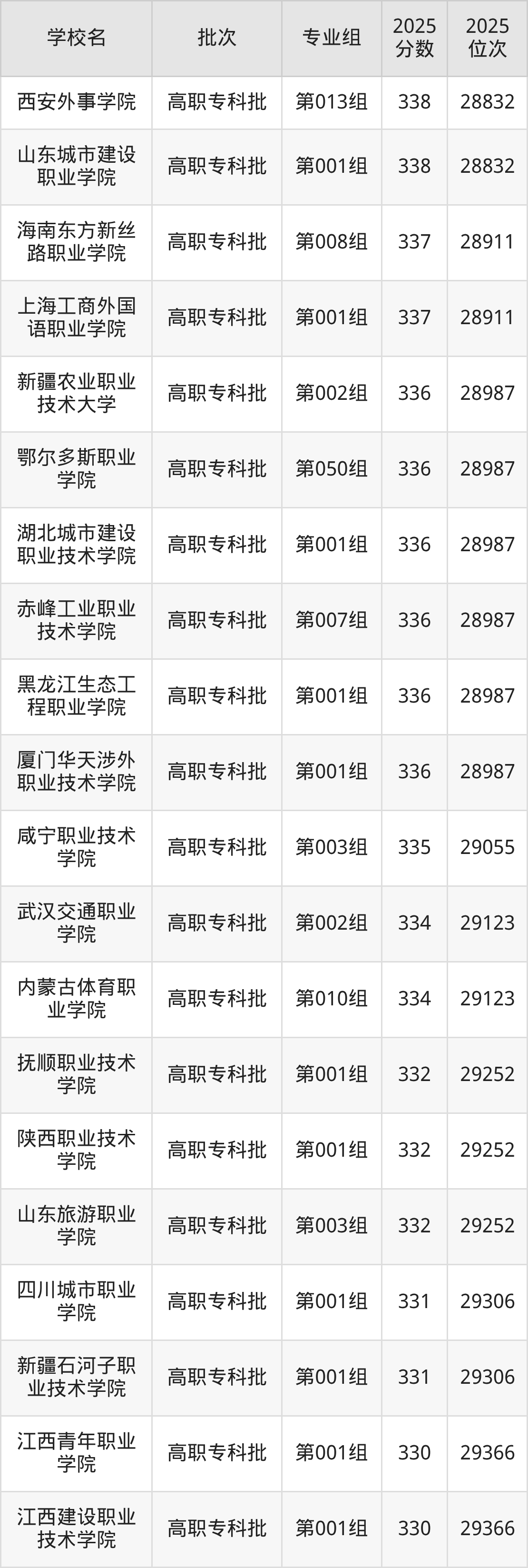 2025年内蒙古高考历史类336分(28912名~28987名)能上的大学有赤峰工业职业技术学院第007组、湖北城市建设职业技术学院第001组、鄂尔多斯职业学院第050组、新疆农业职业技术大学第002组等。