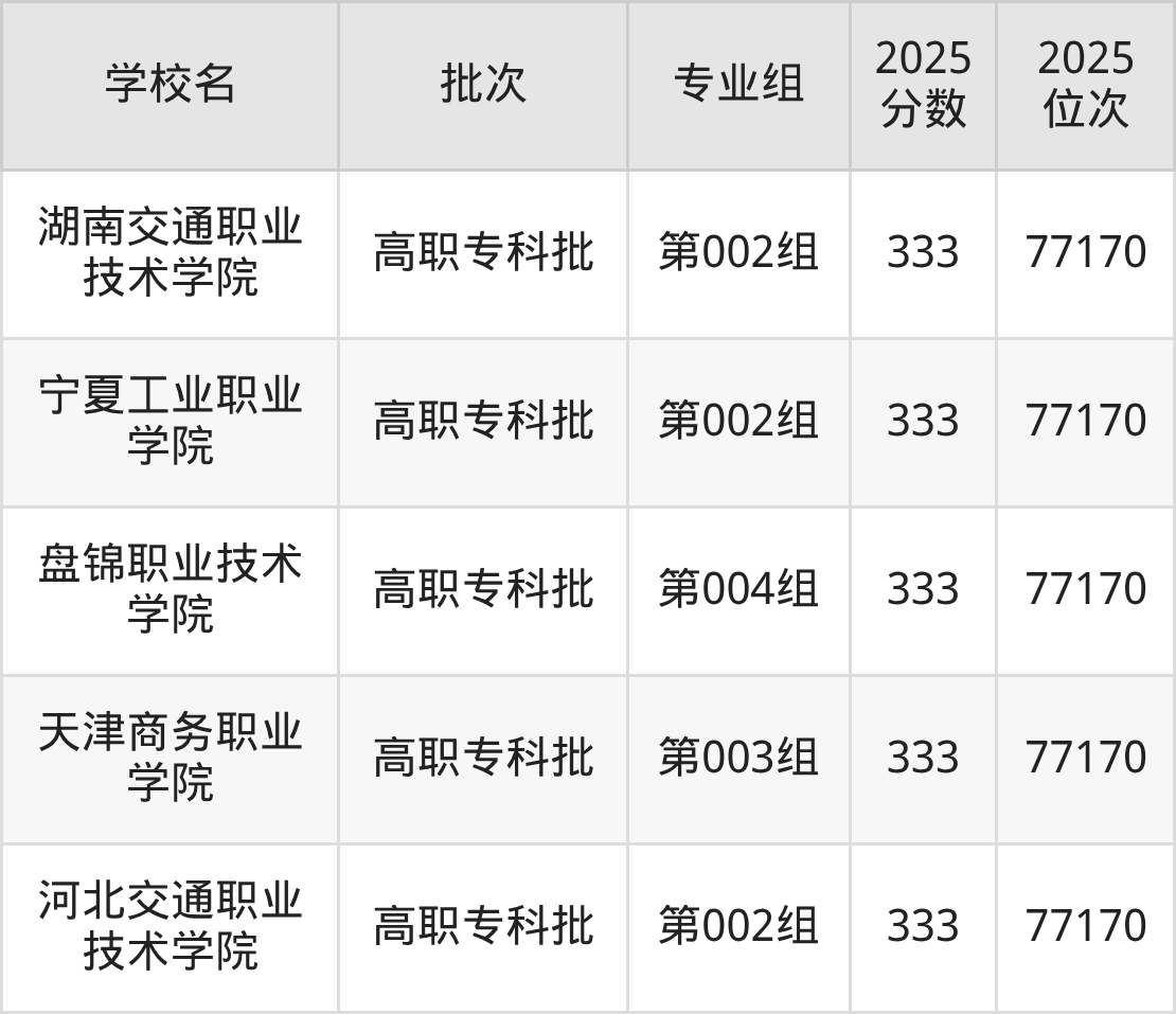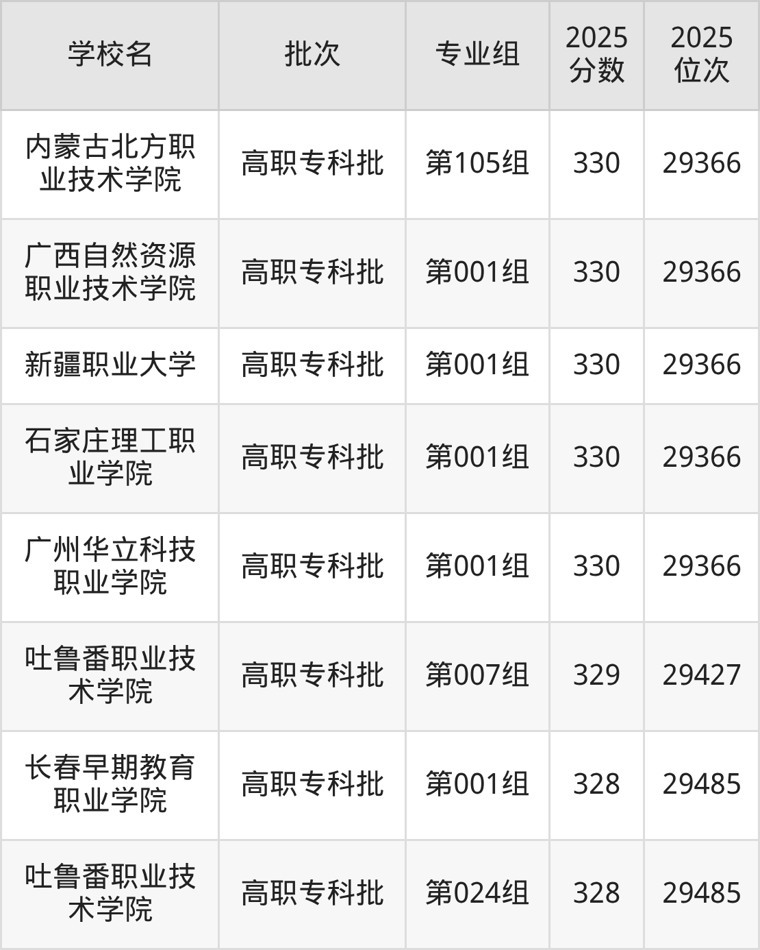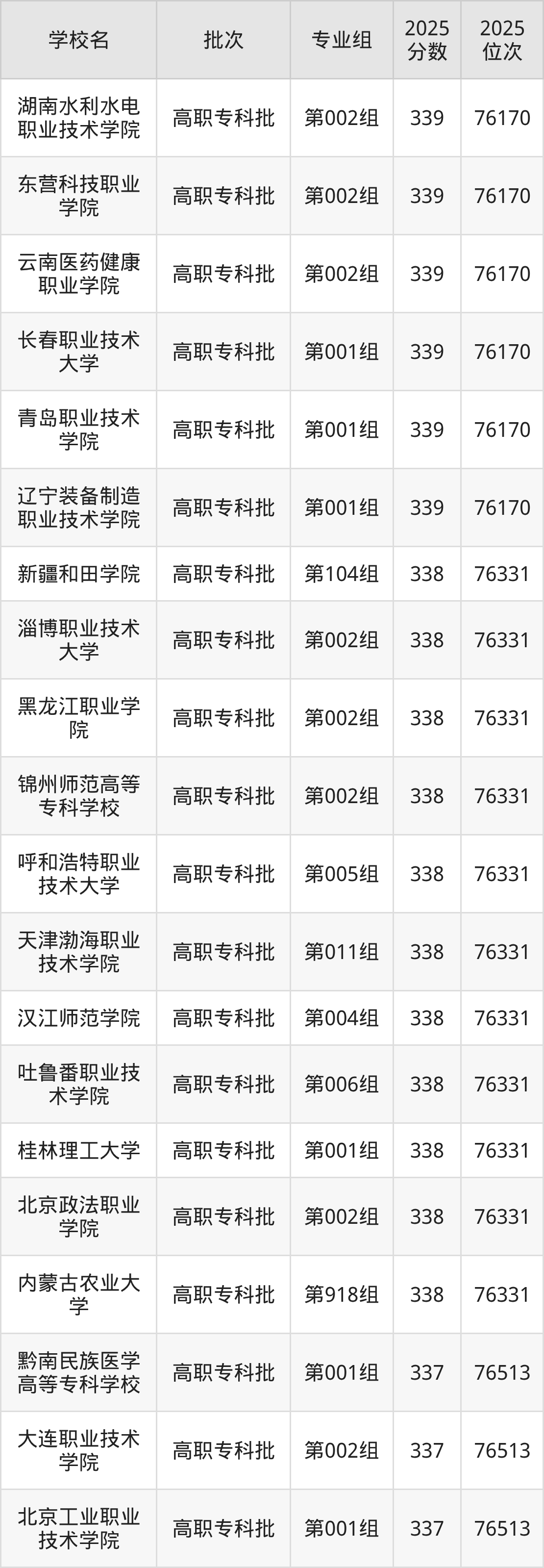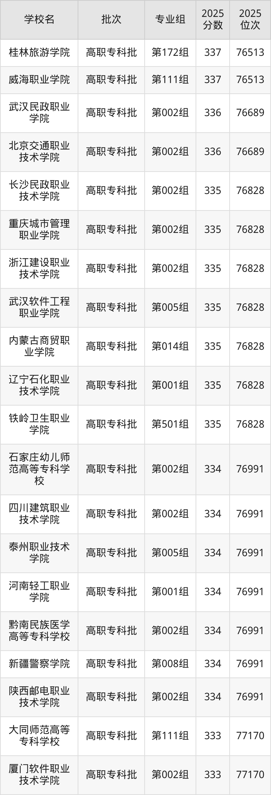 2025年内蒙古高考物理类336分(76514名~76689名)能上的大学有武汉民政职业学院第002组、北京交通职业技术学院第002组。