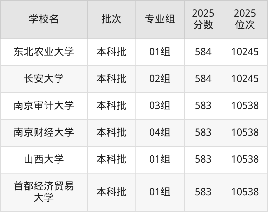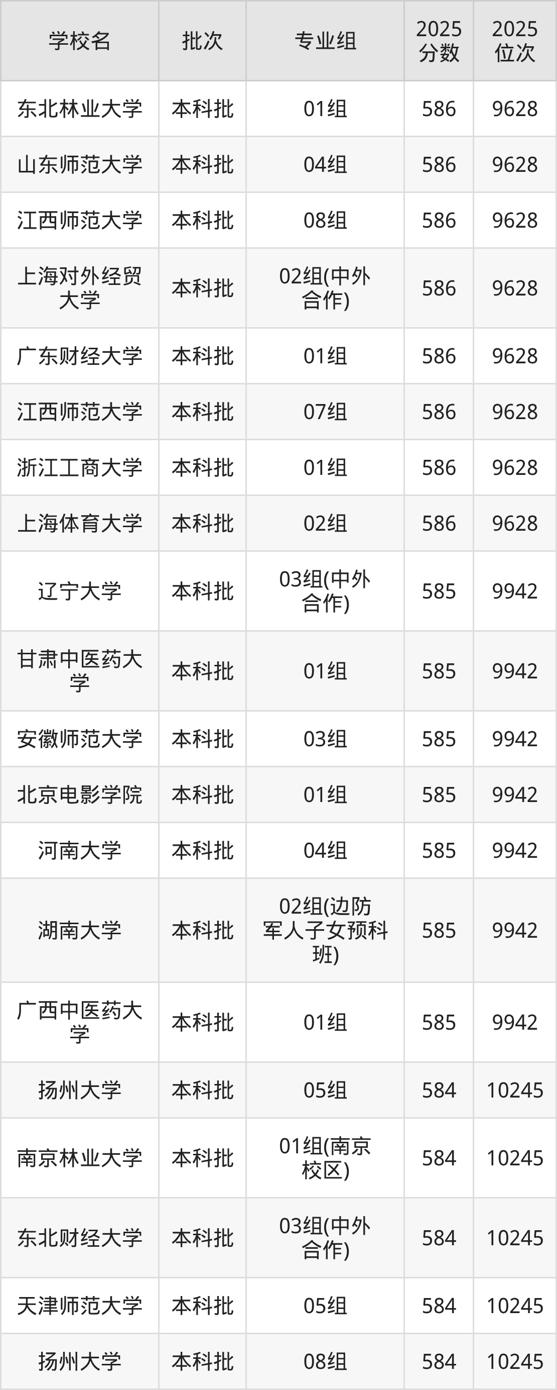 2025年江苏高考历史类584分(9943名~10245名)能上的大学有南京林业大学01组(南京校区)、扬州大学05组、扬州大学08组、天津师范大学05组等。