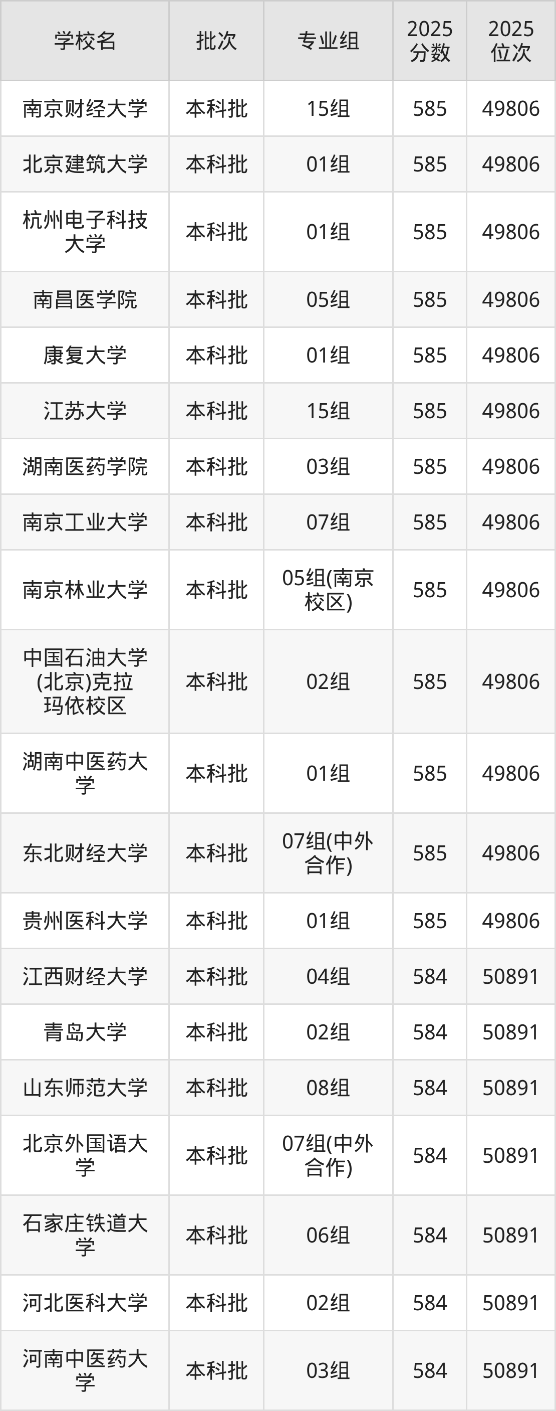 江苏高考584分:历史类排名10245位、物理类排名50891位。该分数位次对应能上的大学历史类有南京林业大学01组(南京校区)、扬州大学05组;物理类有江西财经大学04组、青岛大学02组,更多名单如下文所示,2026届考生可参考。