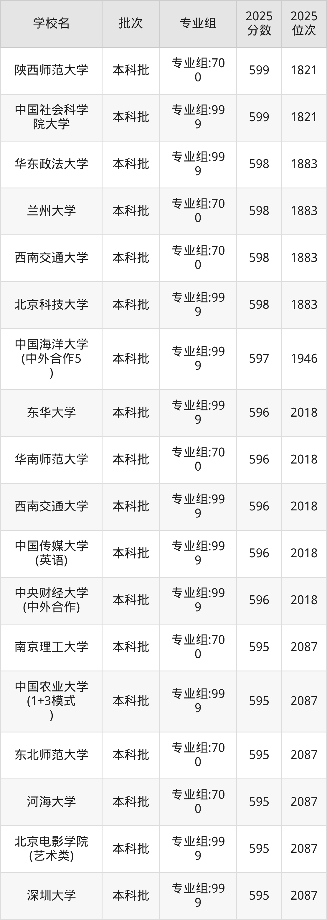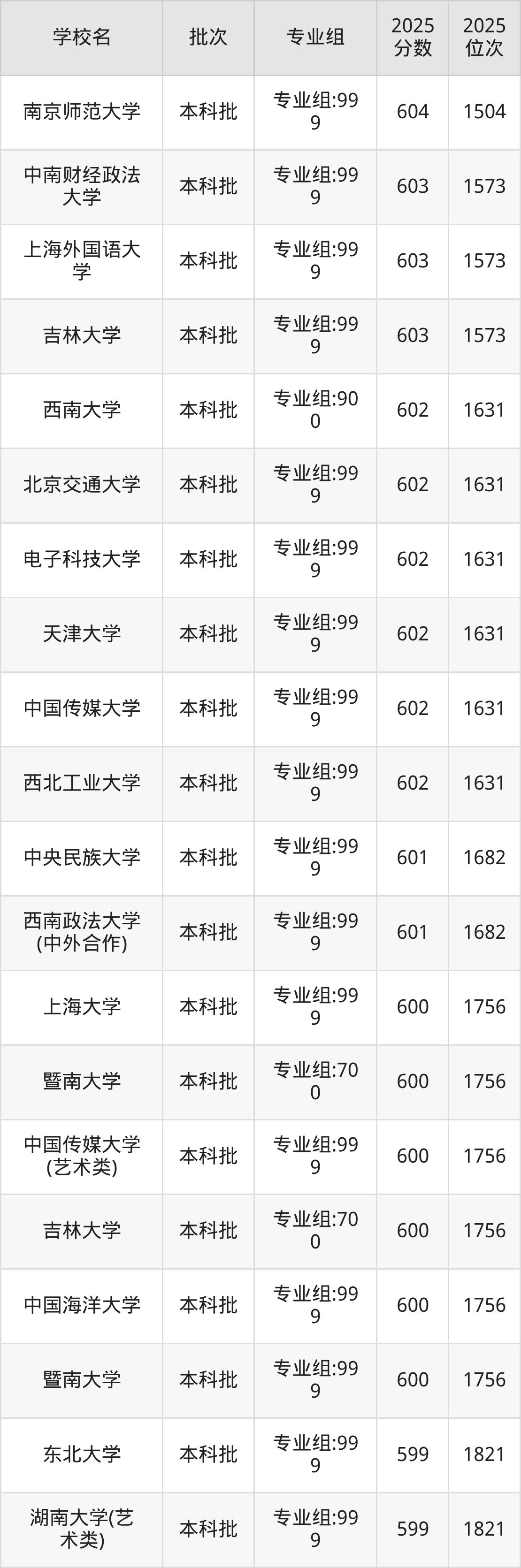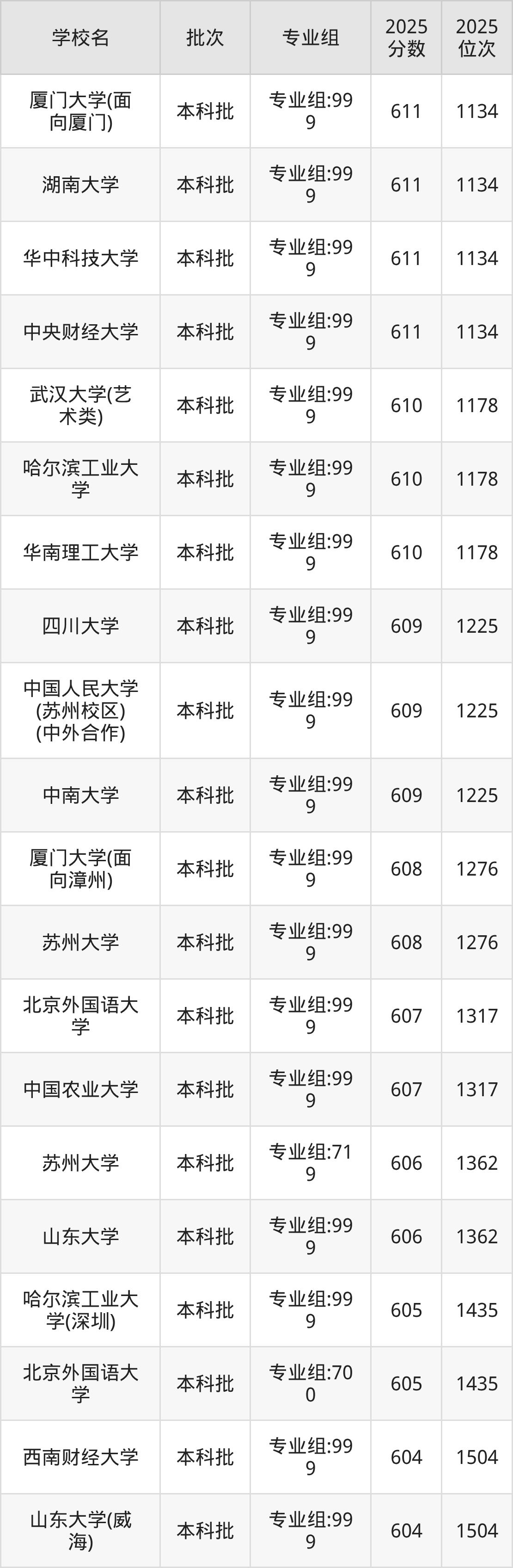 2025年福建高考历史类601分(1632名~1682名)能上的大学有西南政法大学(中外合作)专业组:999、中央民族大学专业组:999。