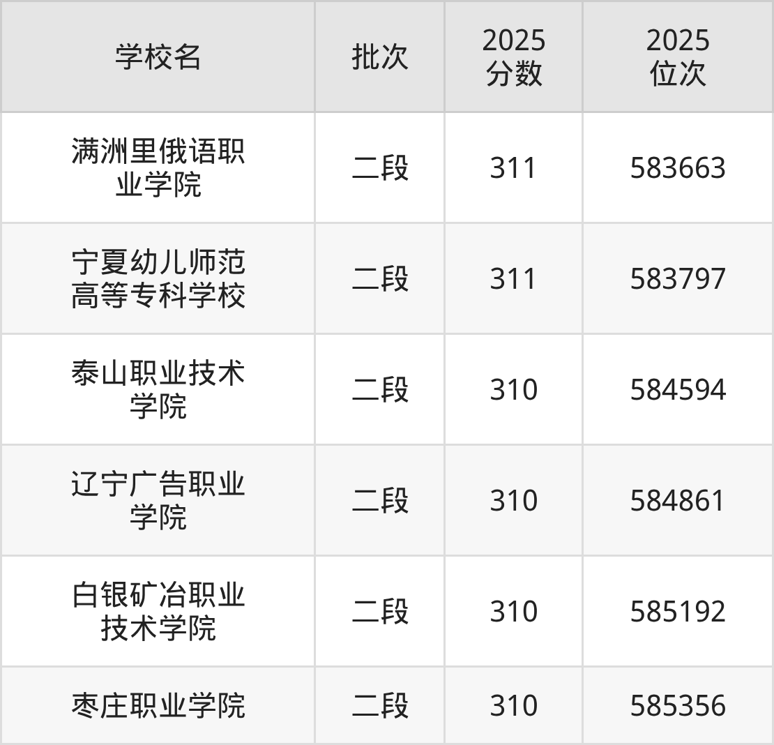 2025年山东高考310分(584051名~585440名)能上的大学有泰山职业技术学院、辽宁广告职业学院、白银矿冶职业技术学院、枣庄职业学院。