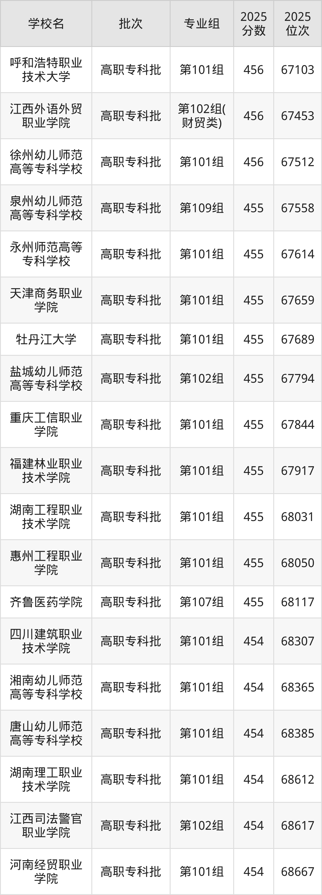 2025年江西高考历史类455分(67529名~68191名)能上的大学有牡丹江大学第101组、盐城幼儿师范高等专科学校第102组、泉州幼儿师范高等专科学校第109组、天津商务职业学院第101组等。