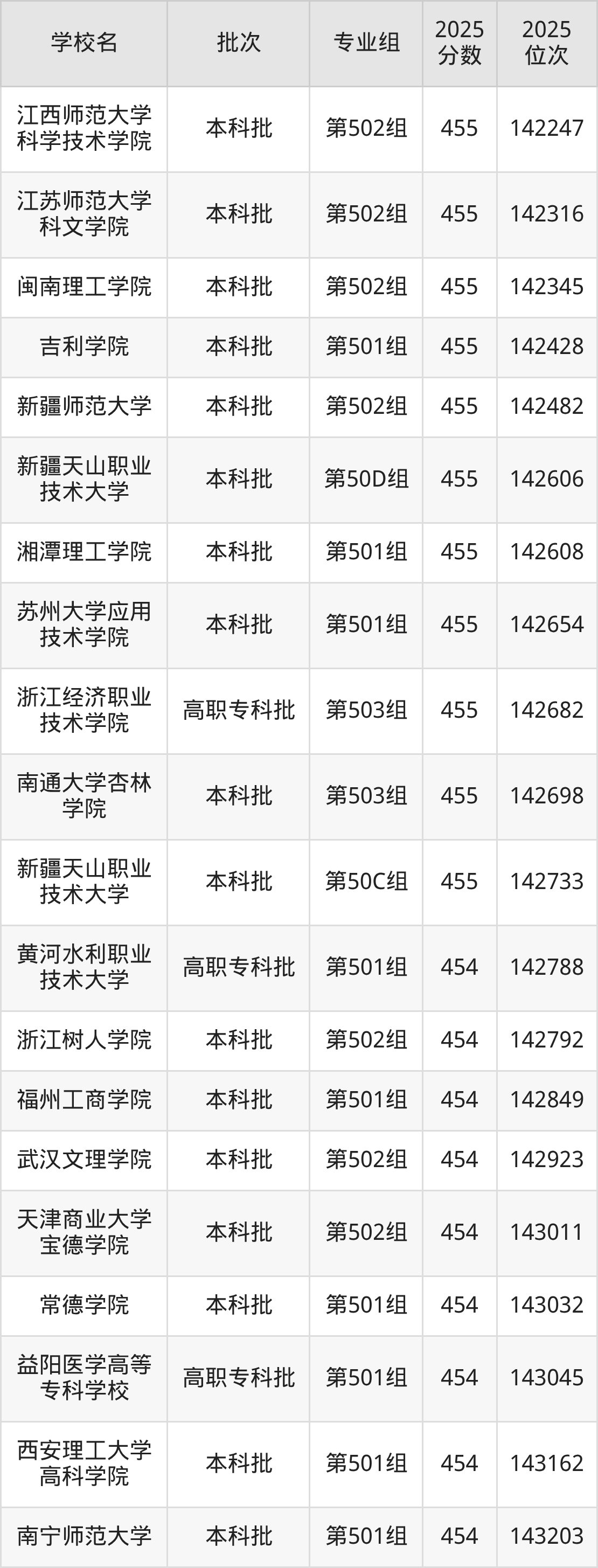 2025年江西高考物理类455分(141544名~142774名)能上的大学有新疆师范大学第502组、潍坊学院第502组、河南城建学院第501组、新疆天山职业技术大学第50C组等。