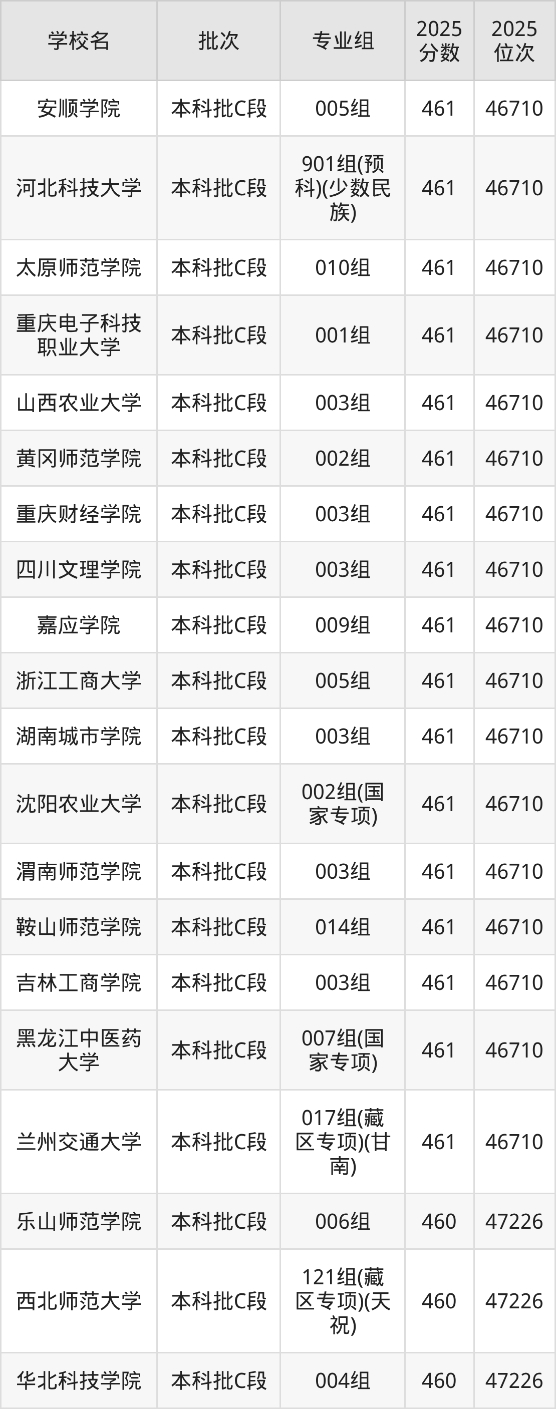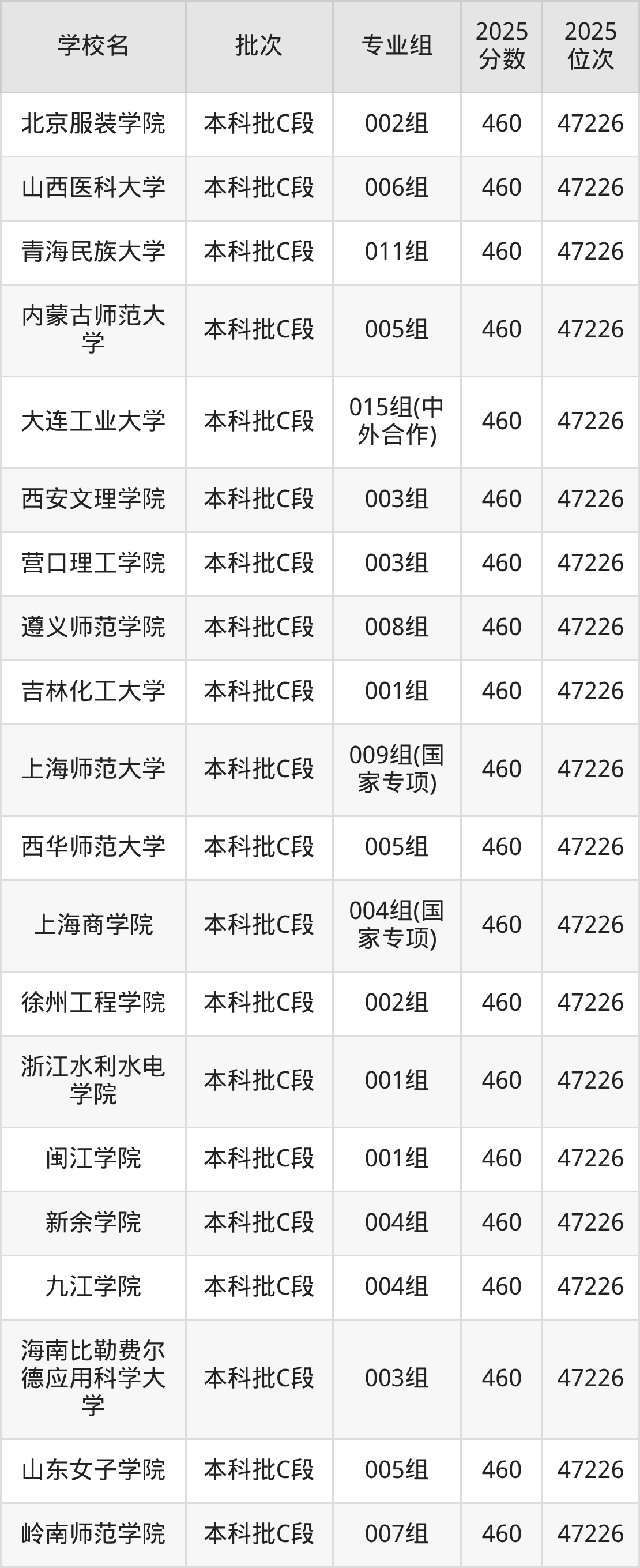2025年甘肃高考物理类460分(46711名~47226名)能上的大学有北京服装学院002组、华北科技学院004组、山西医科大学006组、内蒙古师范大学005组等。