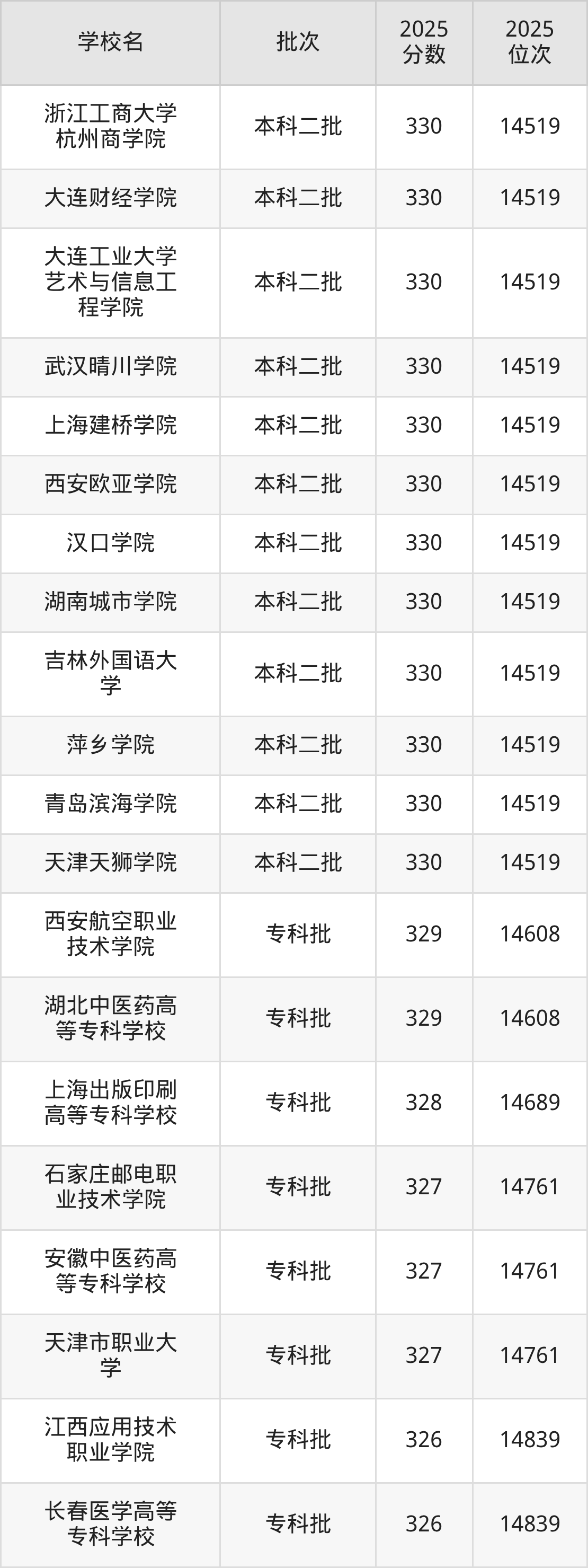 2025年新疆高考文科327分(14690名~14761名)能上的大学有天津市职业大学、安徽中医药高等专科学校、石家庄邮电职业技术学院。