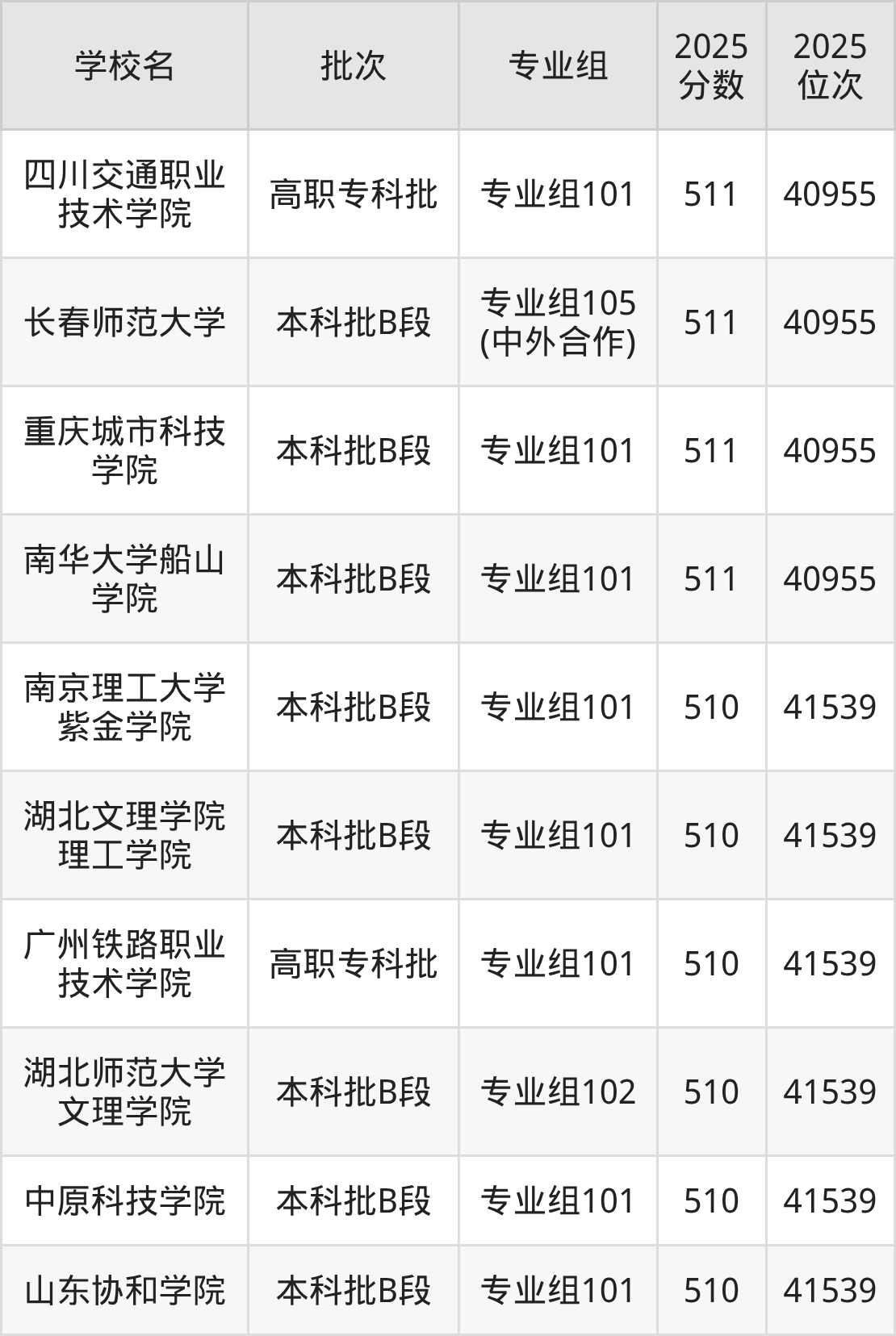 2025年四川高考历史类510分(40956名~41539名)能上的大学有山东协和学院专业组101、中原科技学院专业组101、湖北文理学院理工学院专业组101、湖北师范大学文理学院专业组102等。
