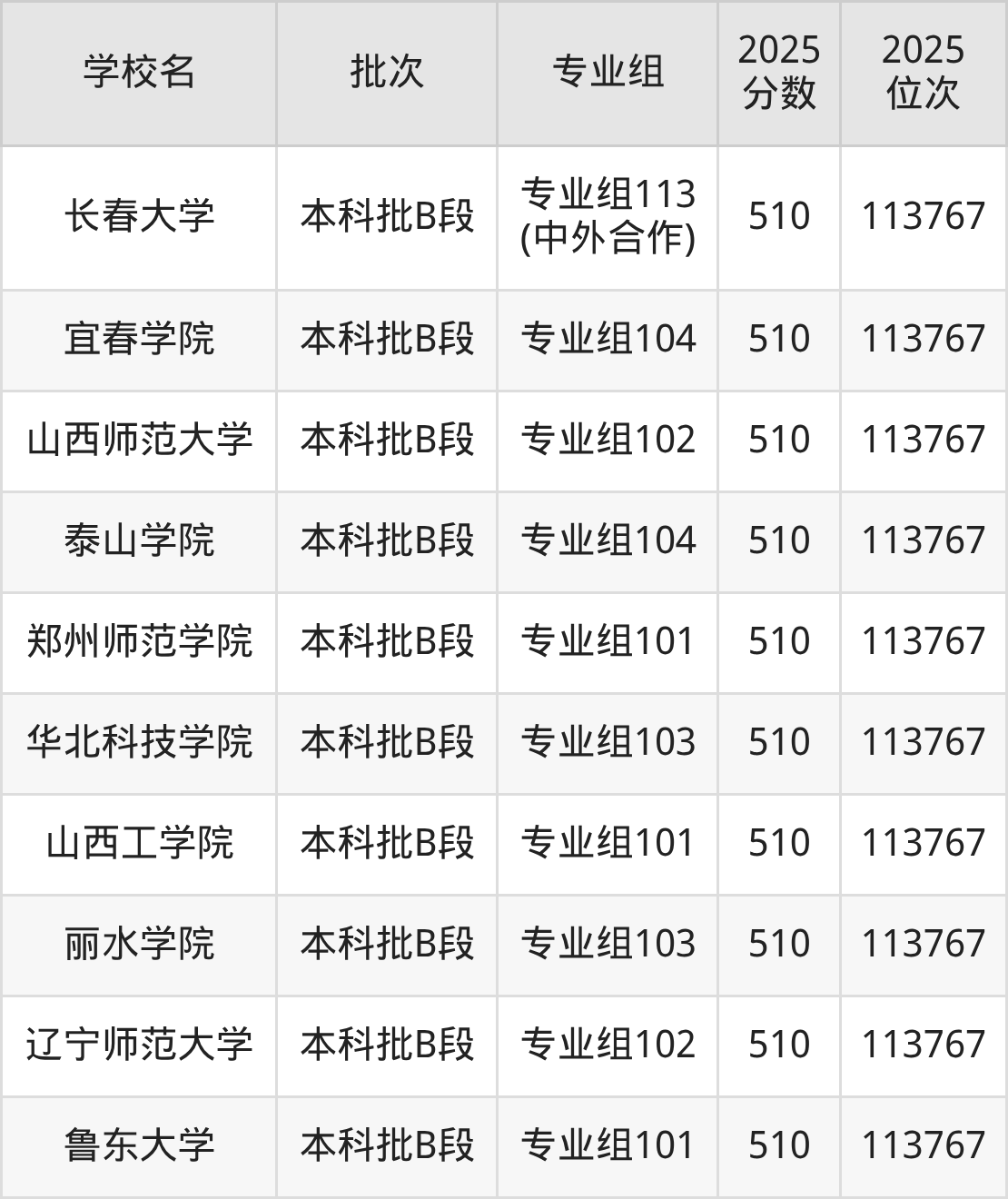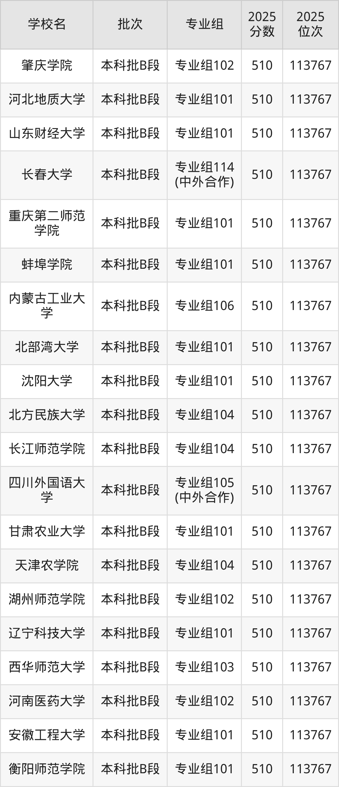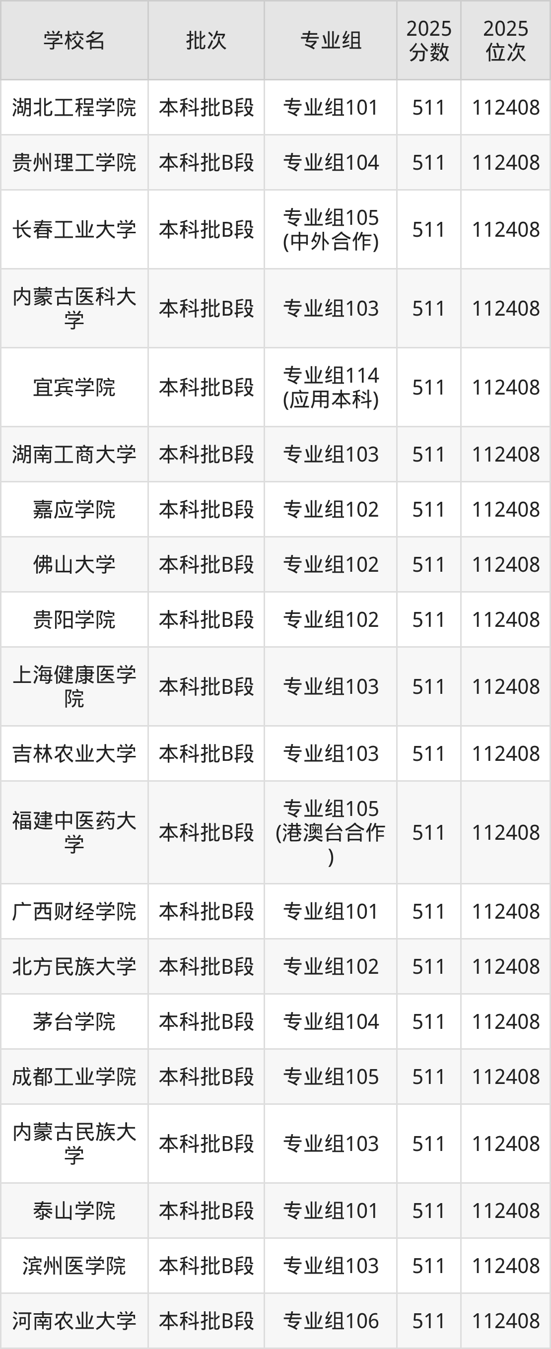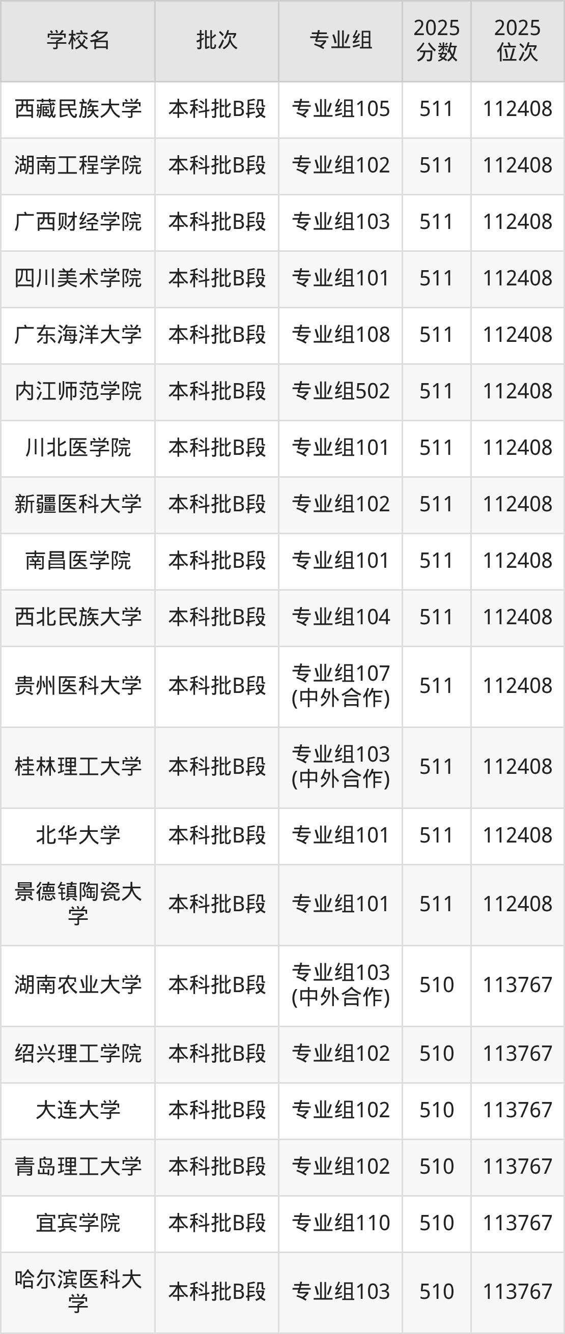 另外录取位次低于该区间(较稳妥)的有浙江科技大学专业组102(民族班)(115134名)、甘肃中医药大学专业组105(115134名)等;录取位次高于该区间(可冲)的有北华大学专业组101(112408名)、桂林理工大学专业组103(中外合作)(112408名)等。