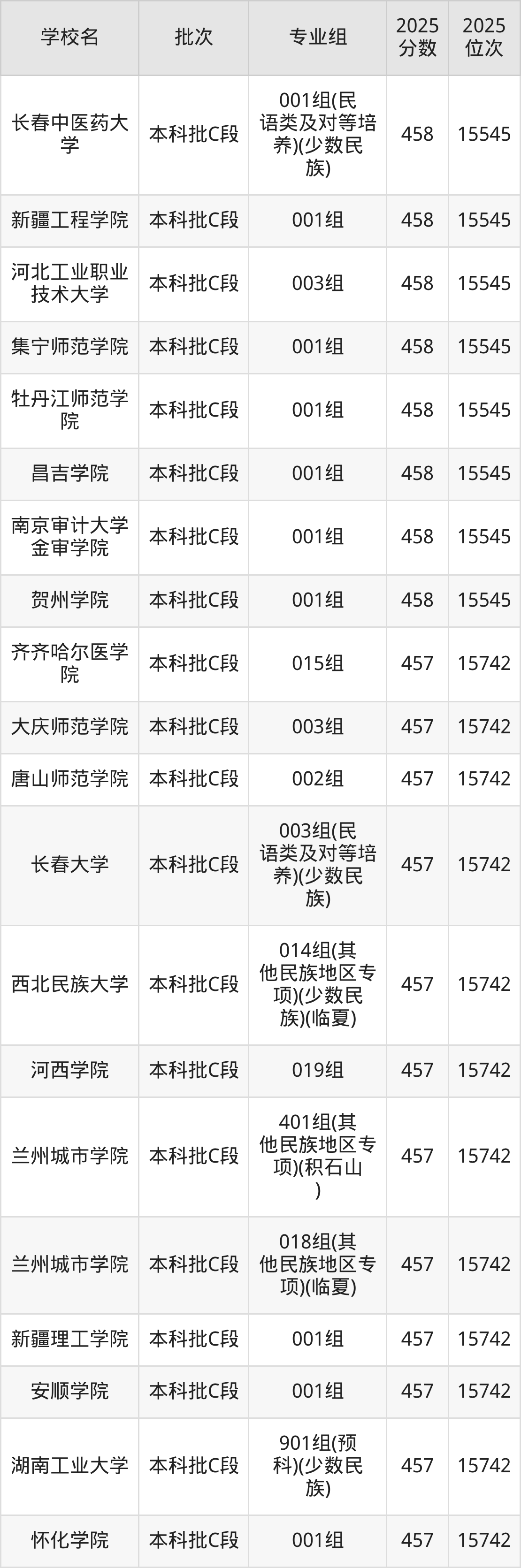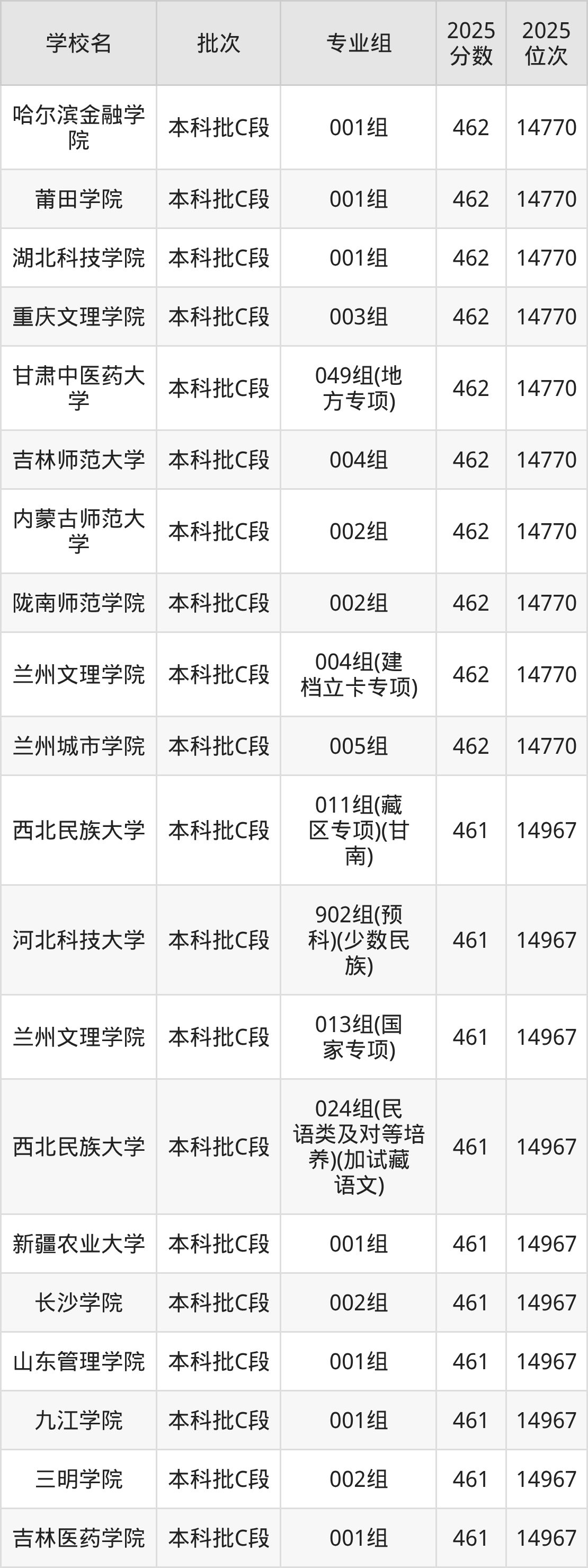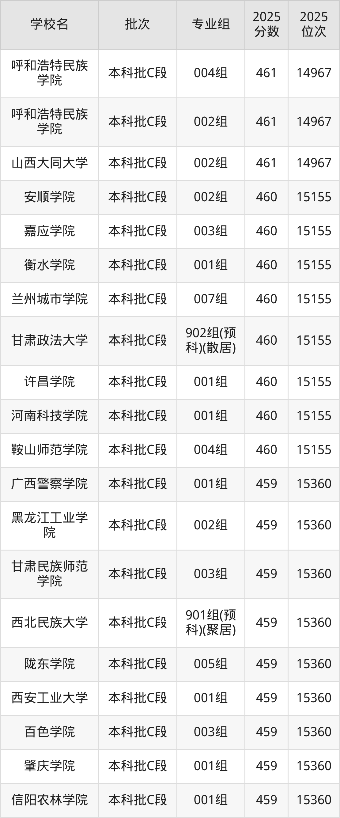 2025年甘肃高考历史类459分(15156名~15360名)能上的大学有黑龙江工业学院002组、信阳农林学院001组、肇庆学院001组、百色学院003组等。