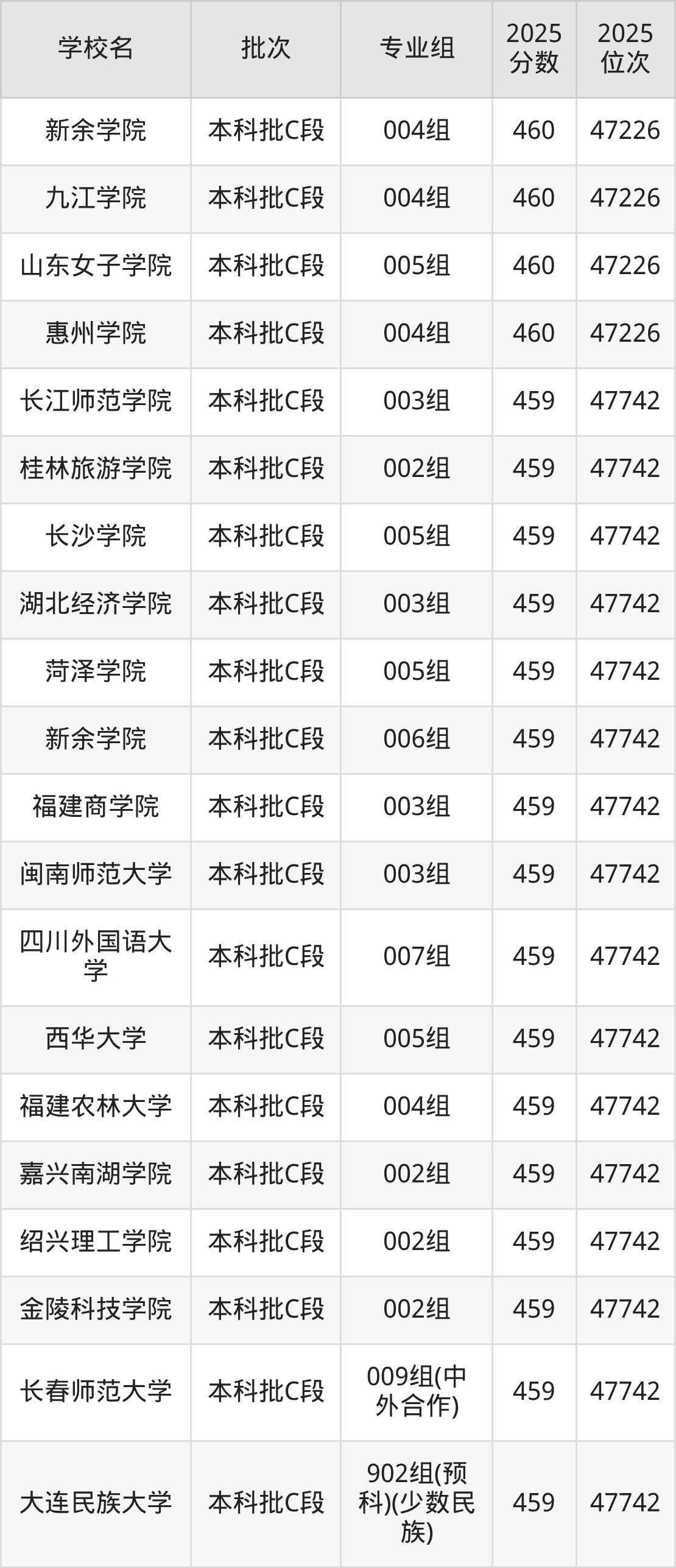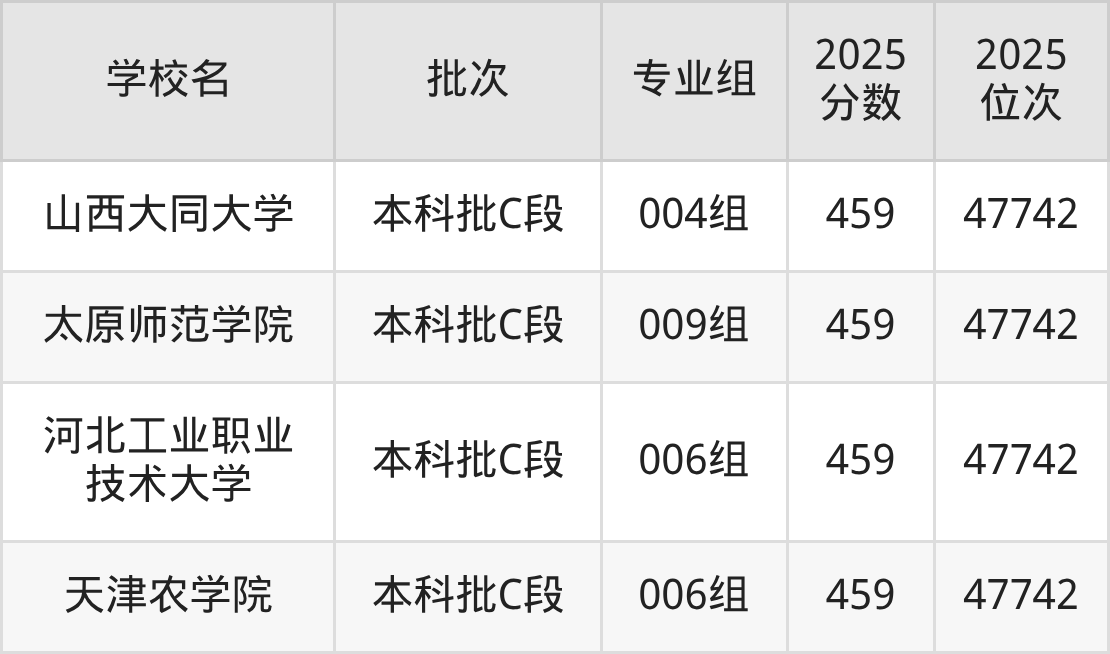 2025年甘肃高考物理类459分(47227名~47742名)能上的大学有天津农学院006组、河北工业职业技术大学006组、太原师范学院009组、山西大同大学004组等。