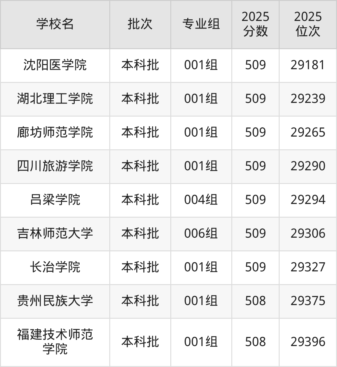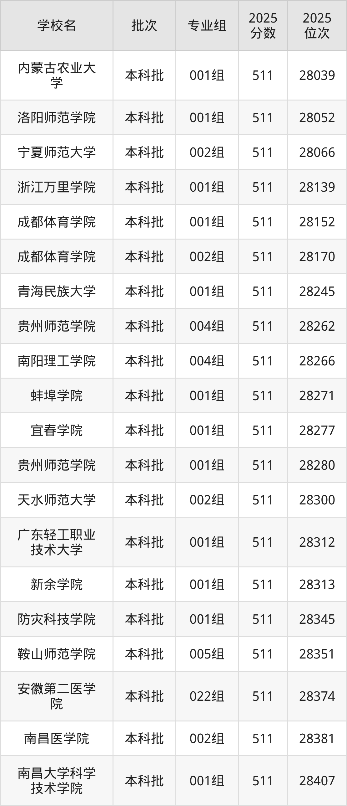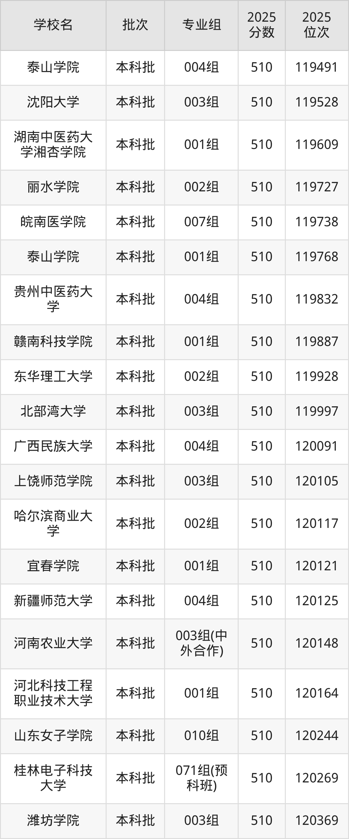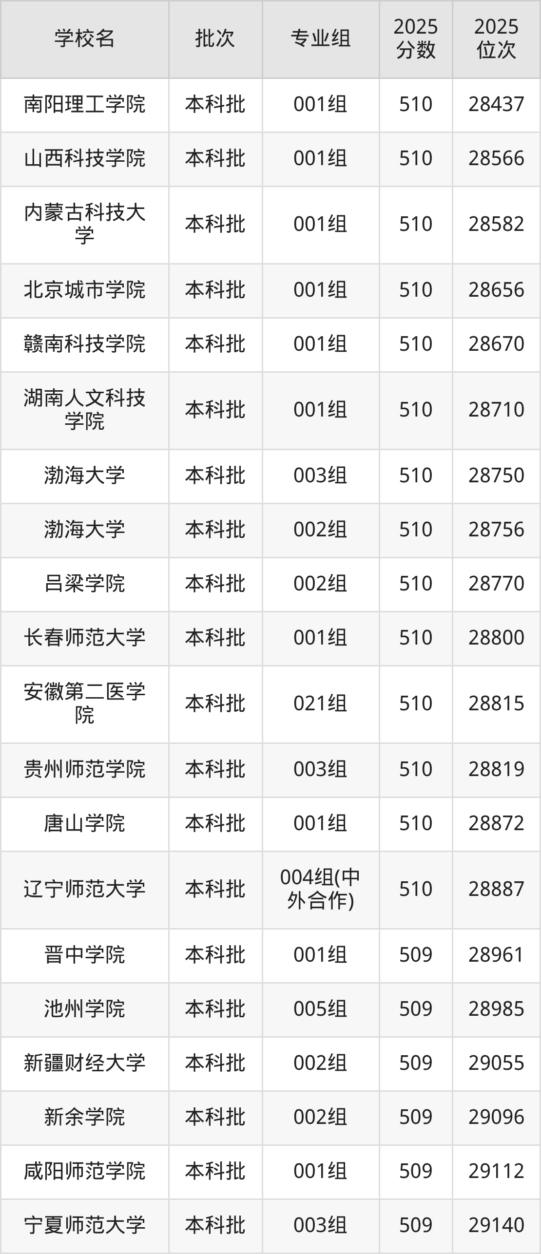 2025年安徽高考历史类510分(28435名~28906名)能上的大学有北京城市学院001组、渤海大学002组、渤海大学003组、长春师范大学001组等。