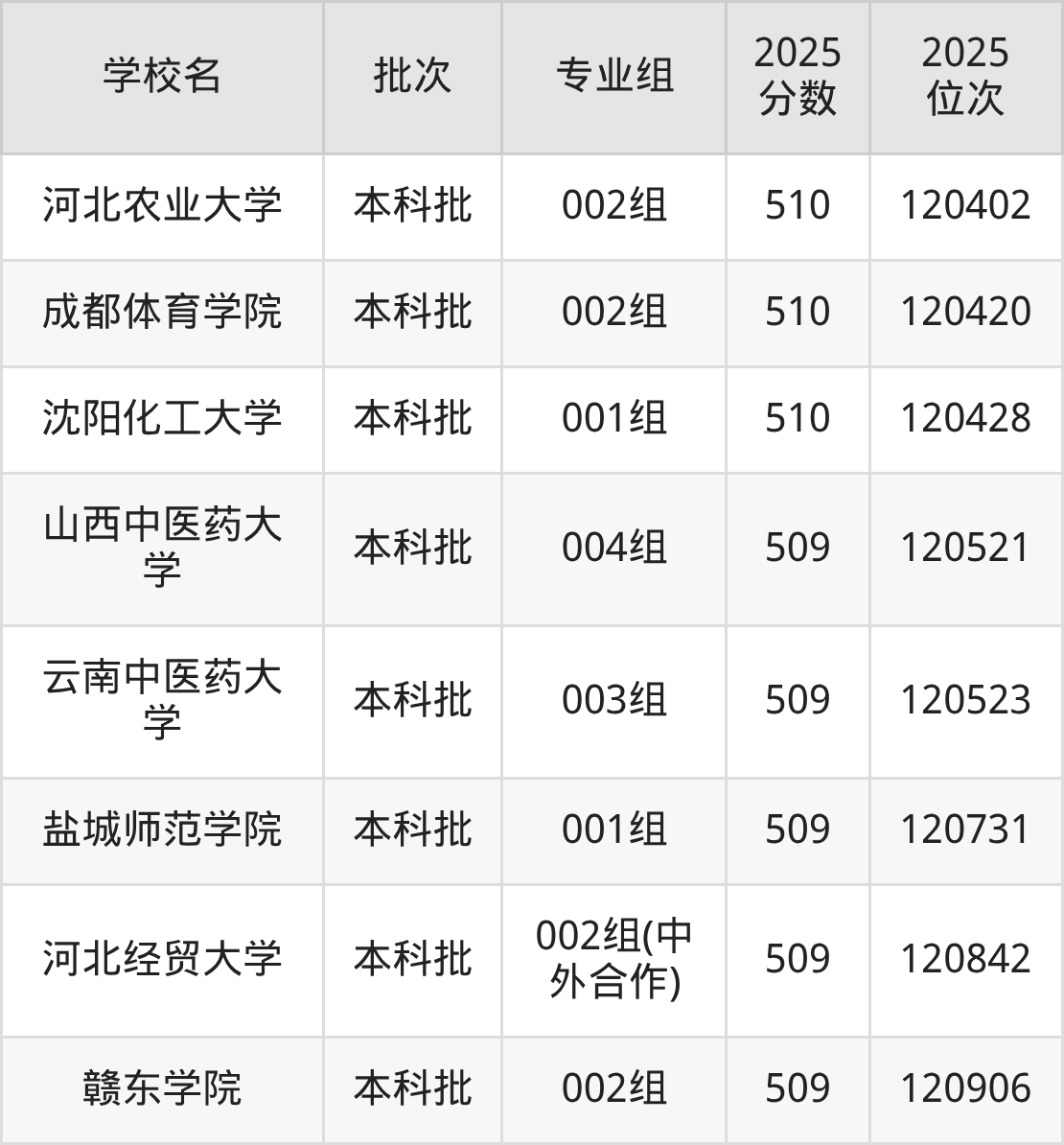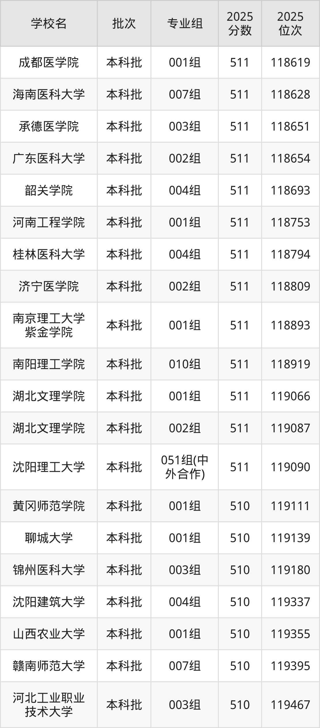 另外录取位次低于该区间(较稳妥)的有山西中医药大学004组(120521名)、云南中医药大学003组(120523名)等;录取位次高于该区间(可冲)的有沈阳理工大学051组(中外合作)(119090名)、湖北文理学院002组(119087名)等。