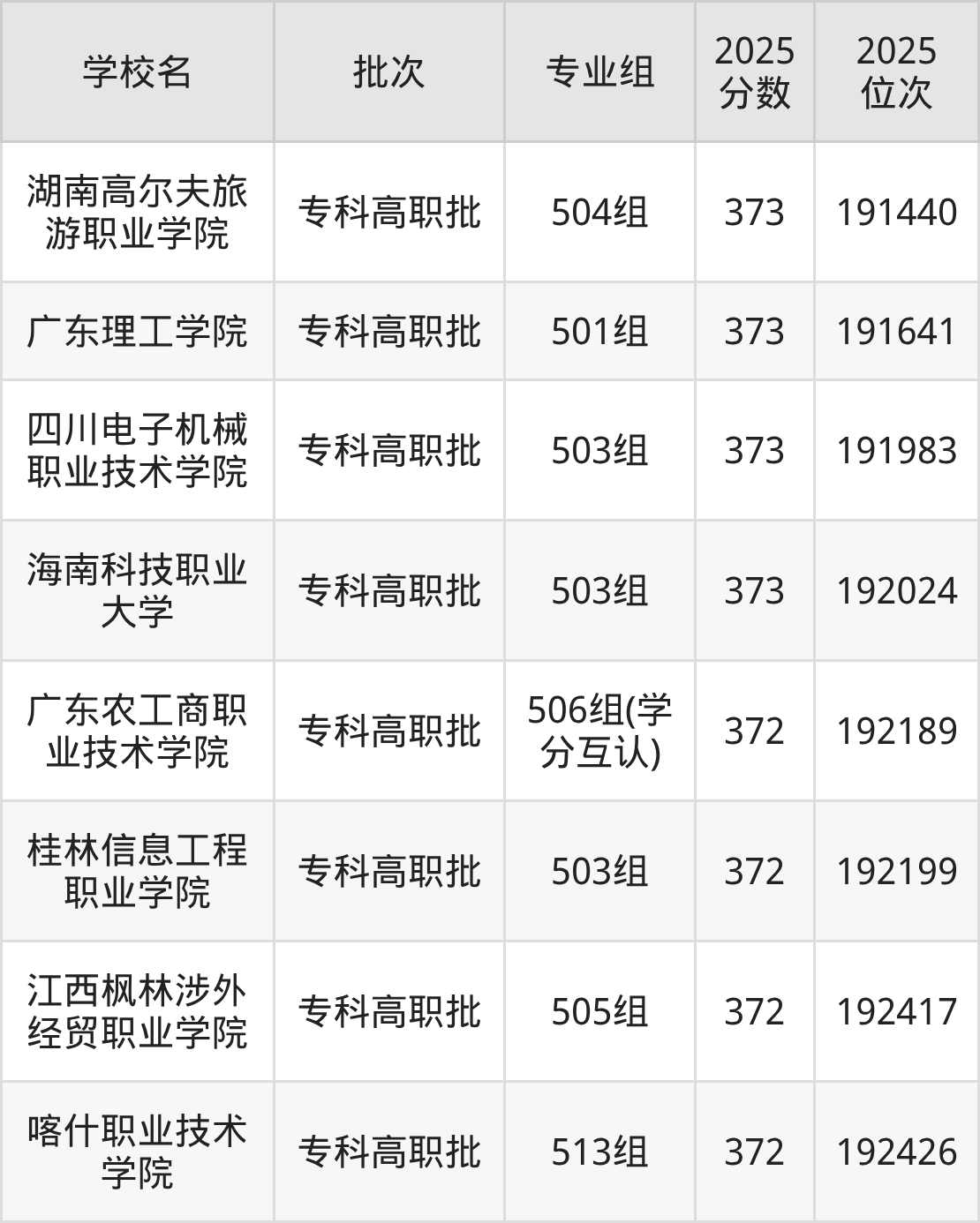2025年广东高考历史类373分(190997名~192063名)能上的大学有广东理工学院501组、海南科技职业大学503组、湖南高尔夫旅游职业学院504组、四川电子机械职业技术学院503组。