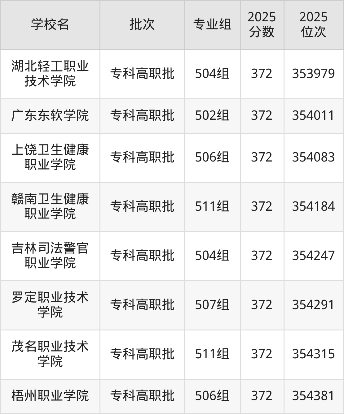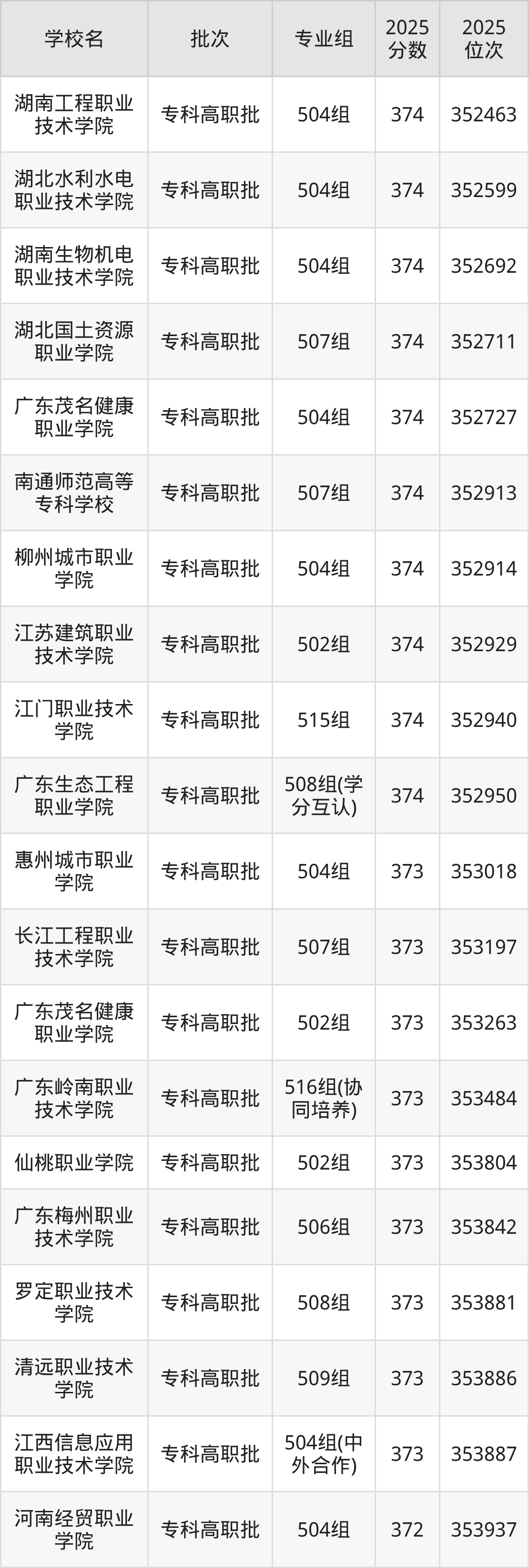 2025年广东高考物理类373分(352949名~353893名)能上的大学有仙桃职业学院502组、广东岭南职业技术学院516组(协同培养)、罗定职业技术学院508组、江西信息应用职业技术学院504组(中外合作)等。