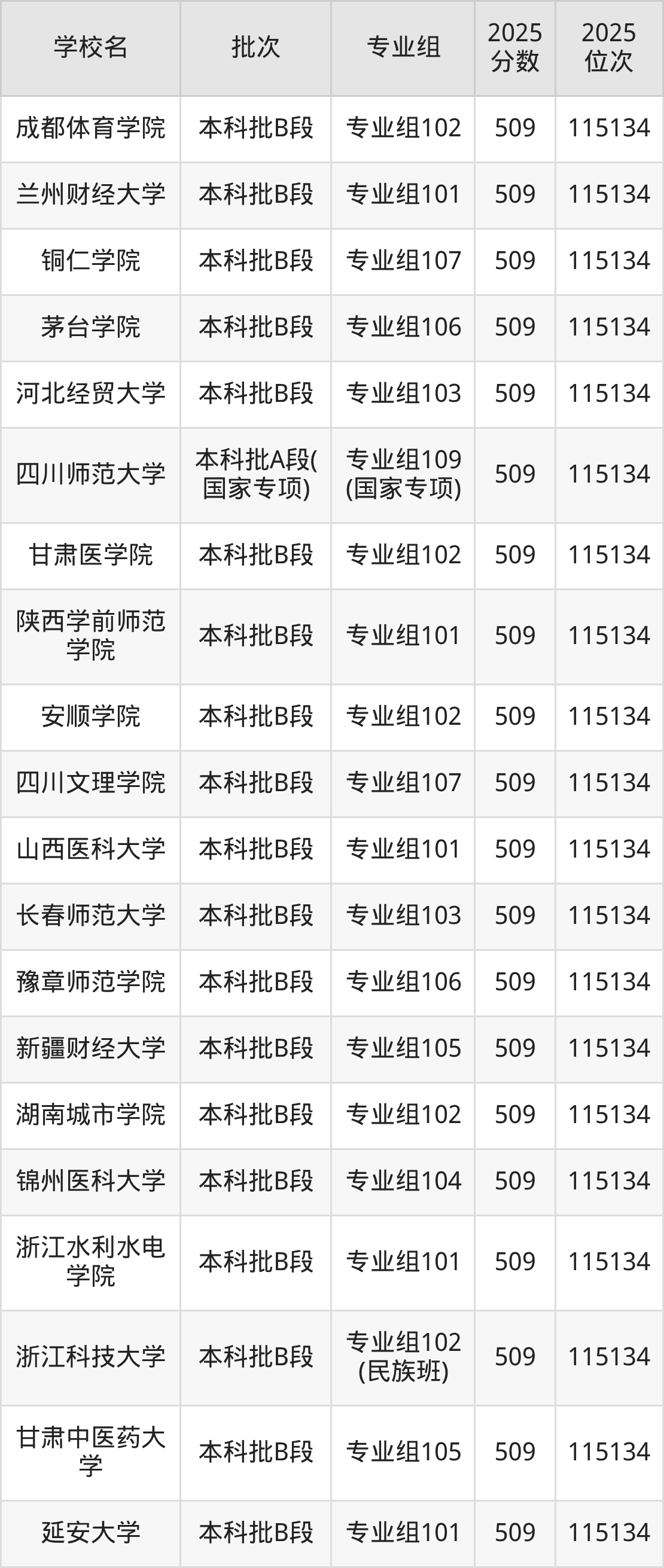 2025年四川高考物理类509分(113768名~115134名)能上的大学有浙江水利水电学院专业组101、锦州医科大学专业组104、湖南城市学院专业组102、新疆财经大学专业组105等。