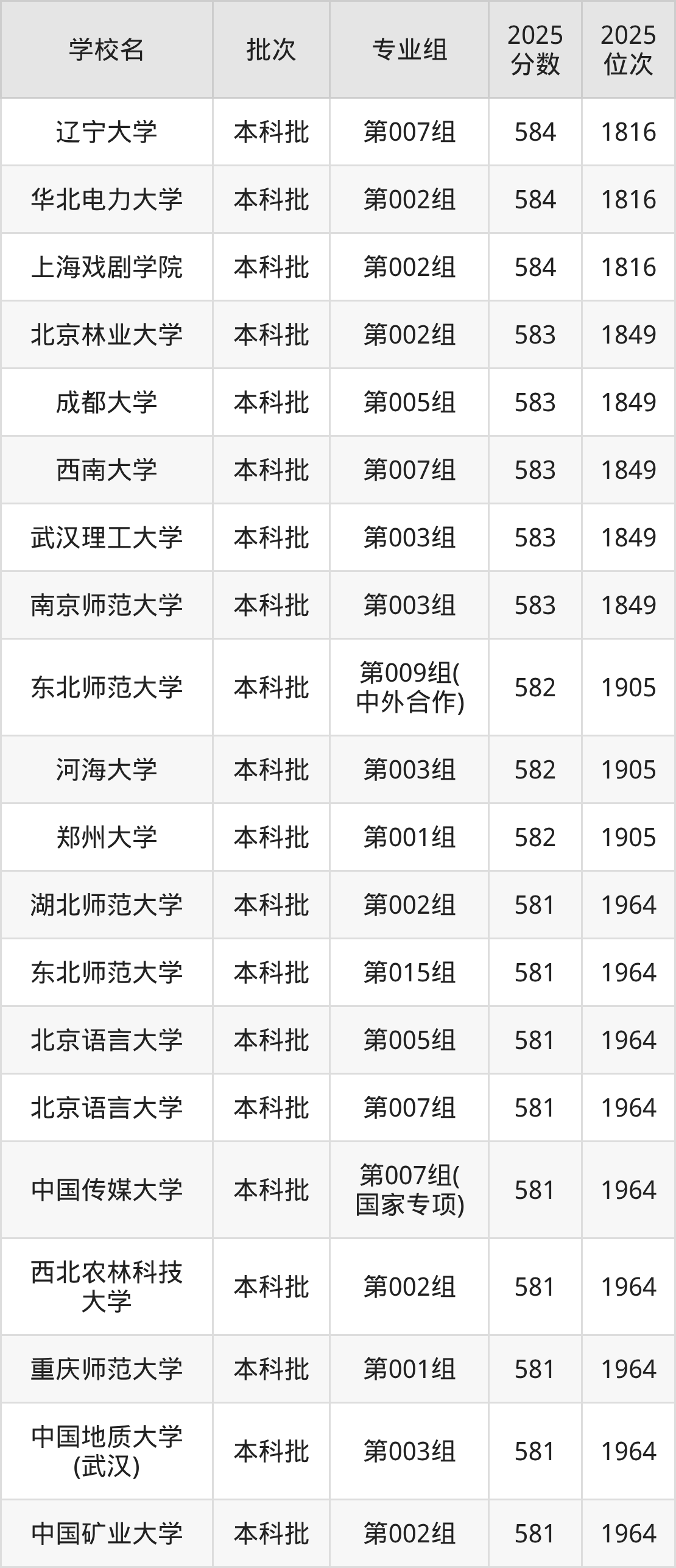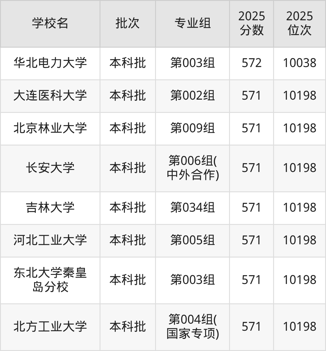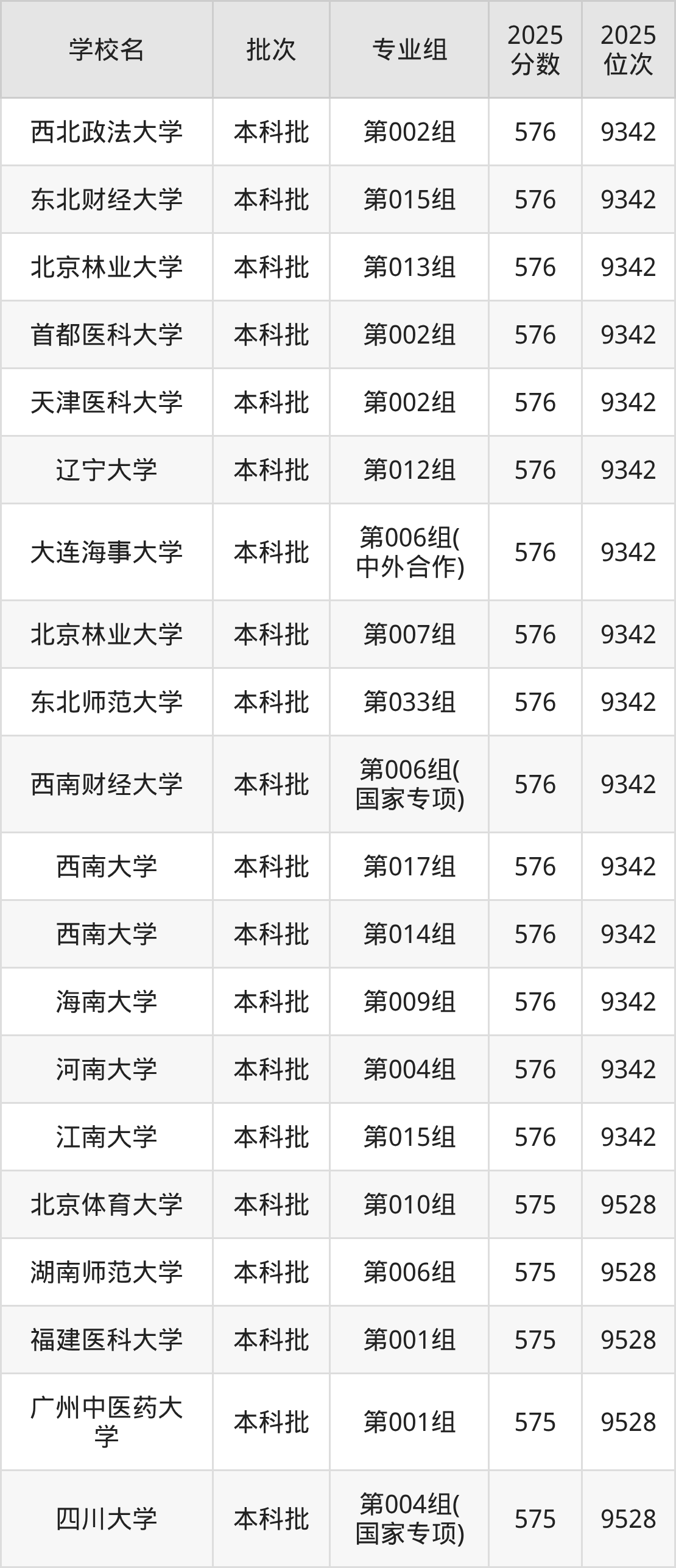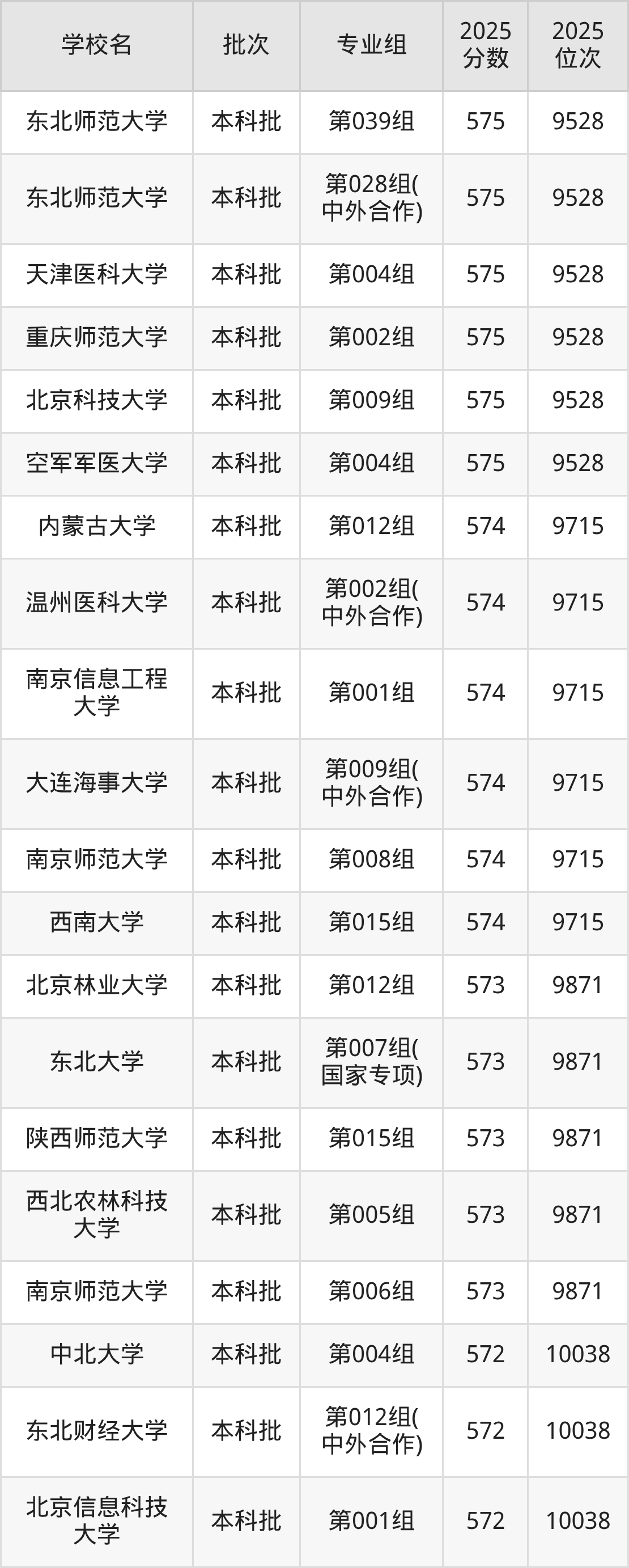 2025年吉林高考物理类573分(9716名~9871名)能上的大学有北京林业大学第012组、东北大学第007组(国家专项)、南京师范大学第006组、西北农林科技大学第005组等。