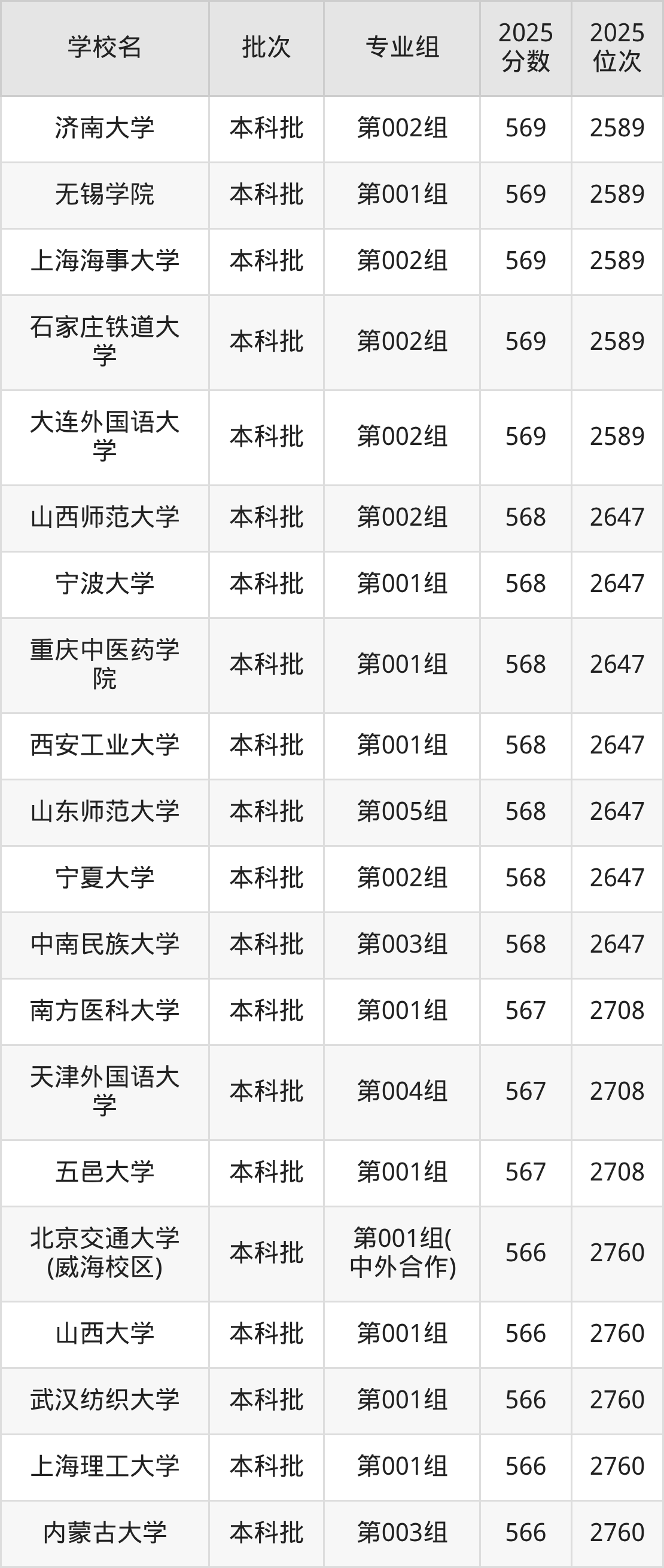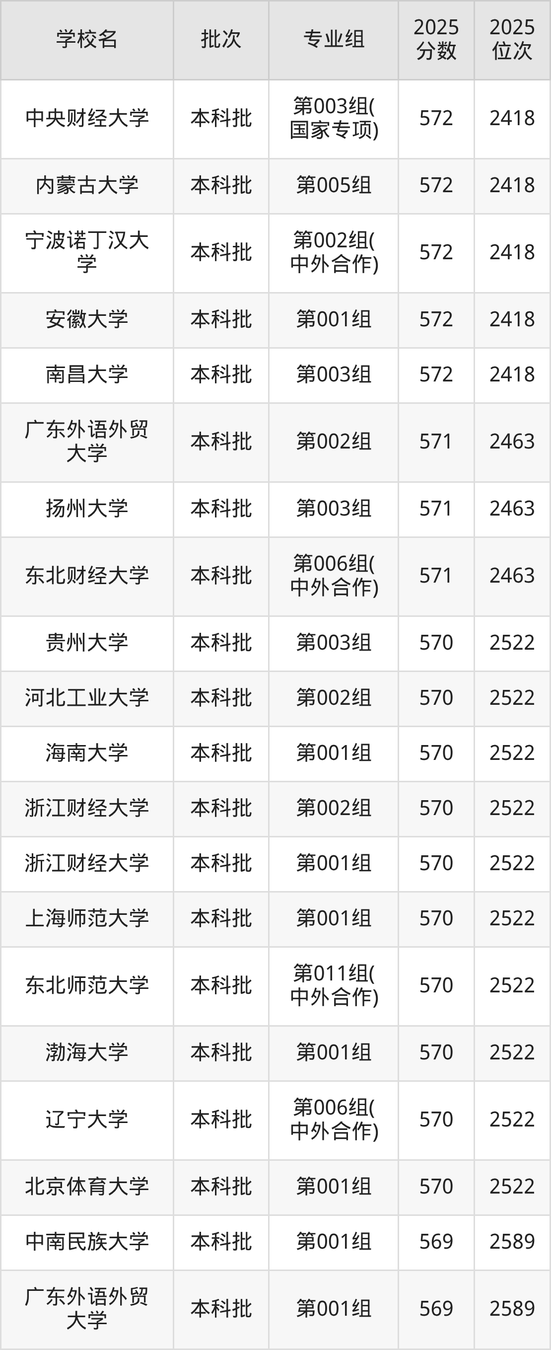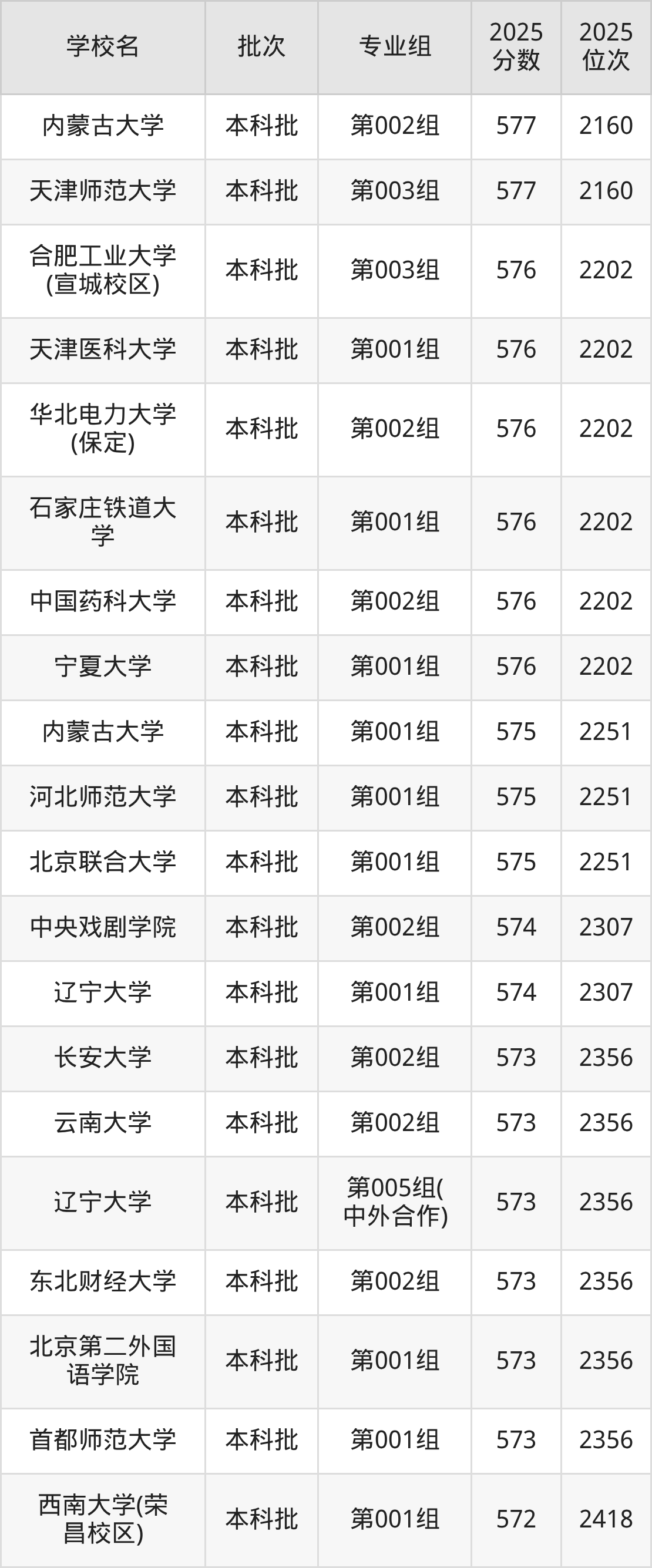 2025年吉林高考历史类573分(2308名~2356名)能上的大学有首都师范大学第001组、北京第二外国语学院第001组、辽宁大学第005组(中外合作)、东北财经大学第002组等。
