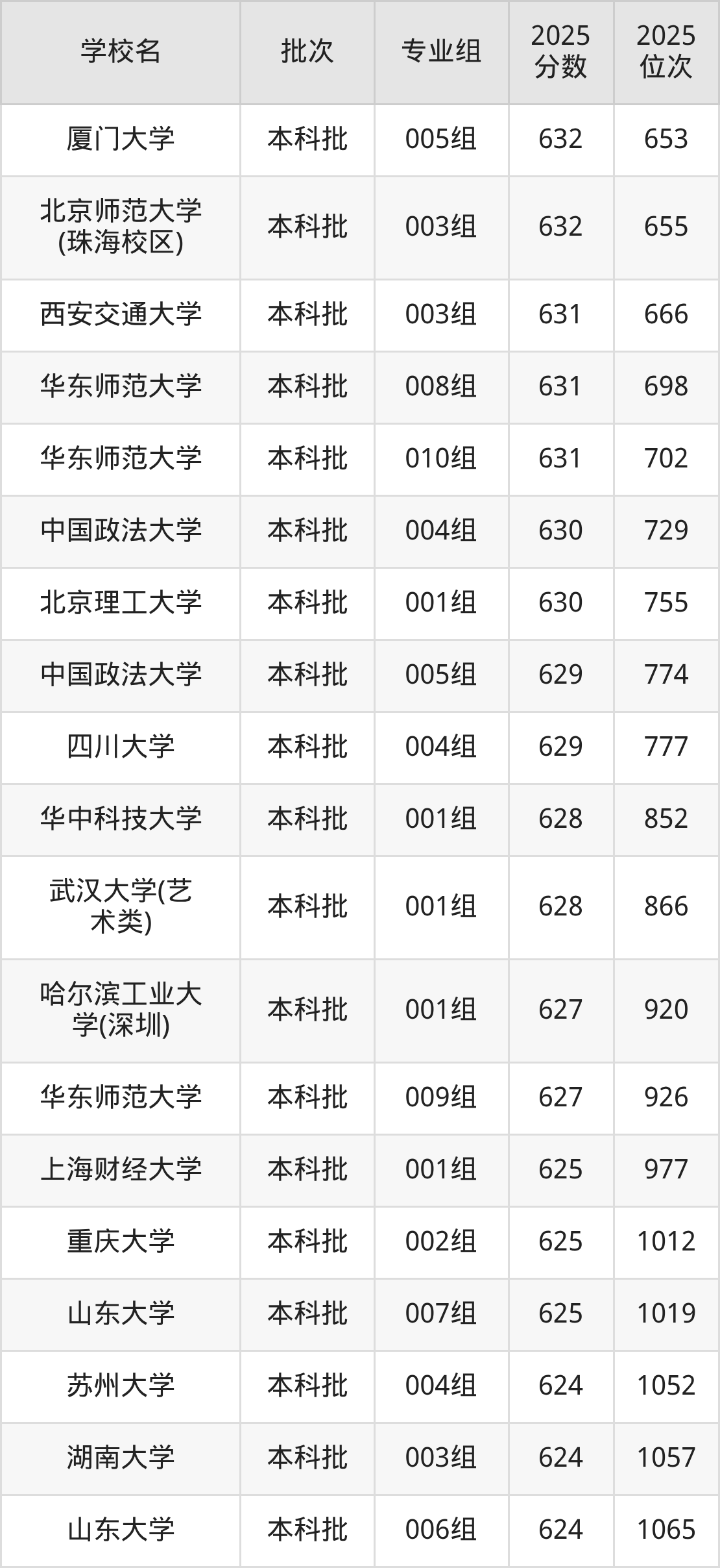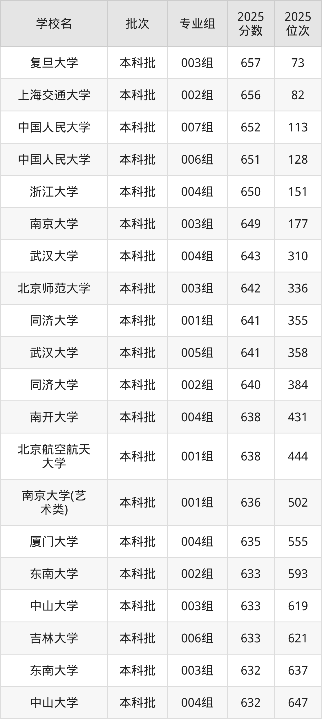 2025年安徽高考历史类634分(556名~587名)录取位次低于该区间(较稳妥)的有东南大学002组(593名)、中山大学003组(619名)等;录取位次高于该区间(可冲)的有厦门大学004组(555名)、南京大学(艺术类)001组(502名)等。