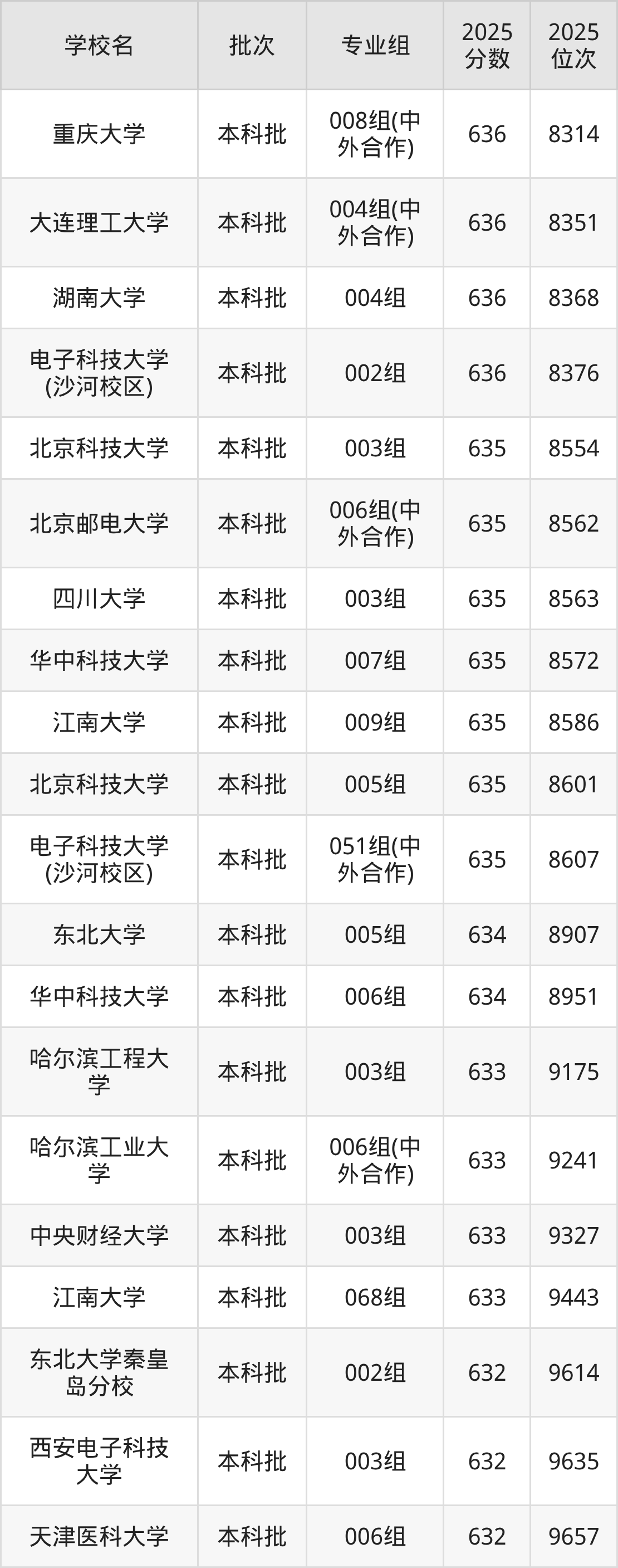 另外录取位次低于该区间(较稳妥)的有哈尔滨工程大学003组(9175名)、哈尔滨工业大学006组(中外合作)(9241名)等;录取位次高于该区间(可冲)的有电子科技大学(沙河校区)051组(中外合作)(8607名)、北京科技大学005组(8601名)等。