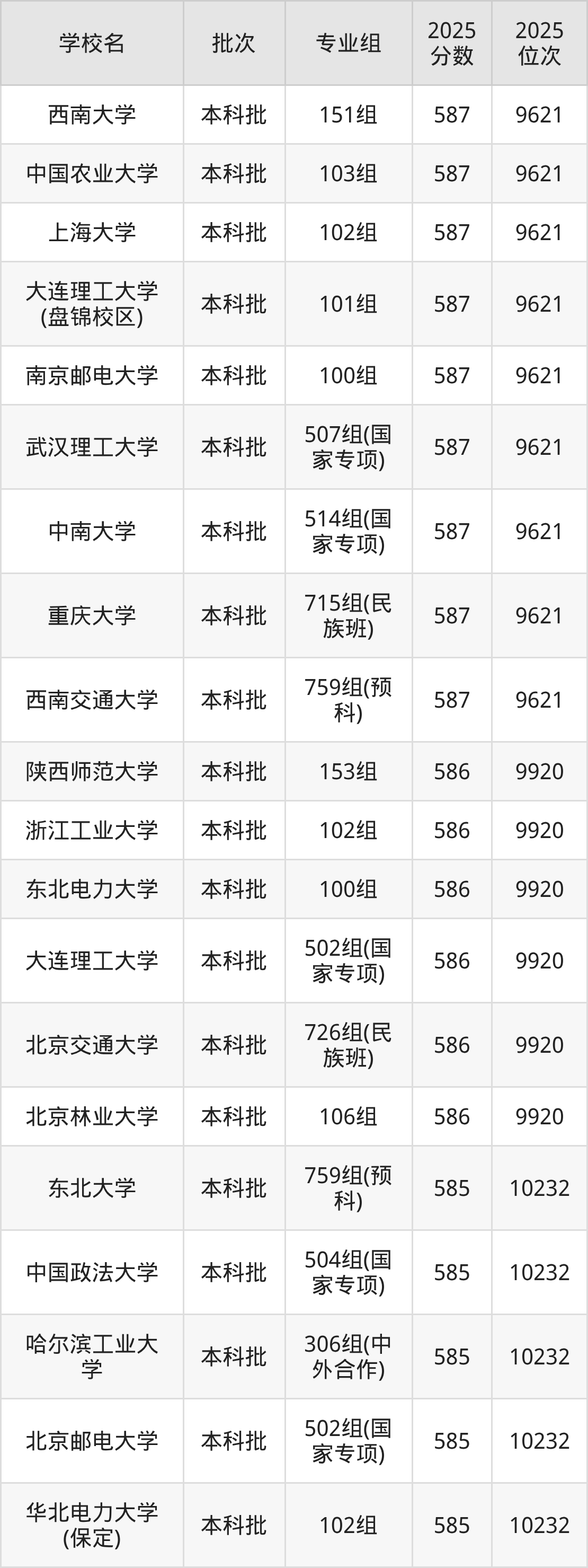 2025年广西高考物理类585分(9921名~10232名)能上的大学有北京化工大学102组、北京邮电大学502组(国家专项)、北京外国语大学759组(预科)、对外经济贸易大学504组(国家专项)等。