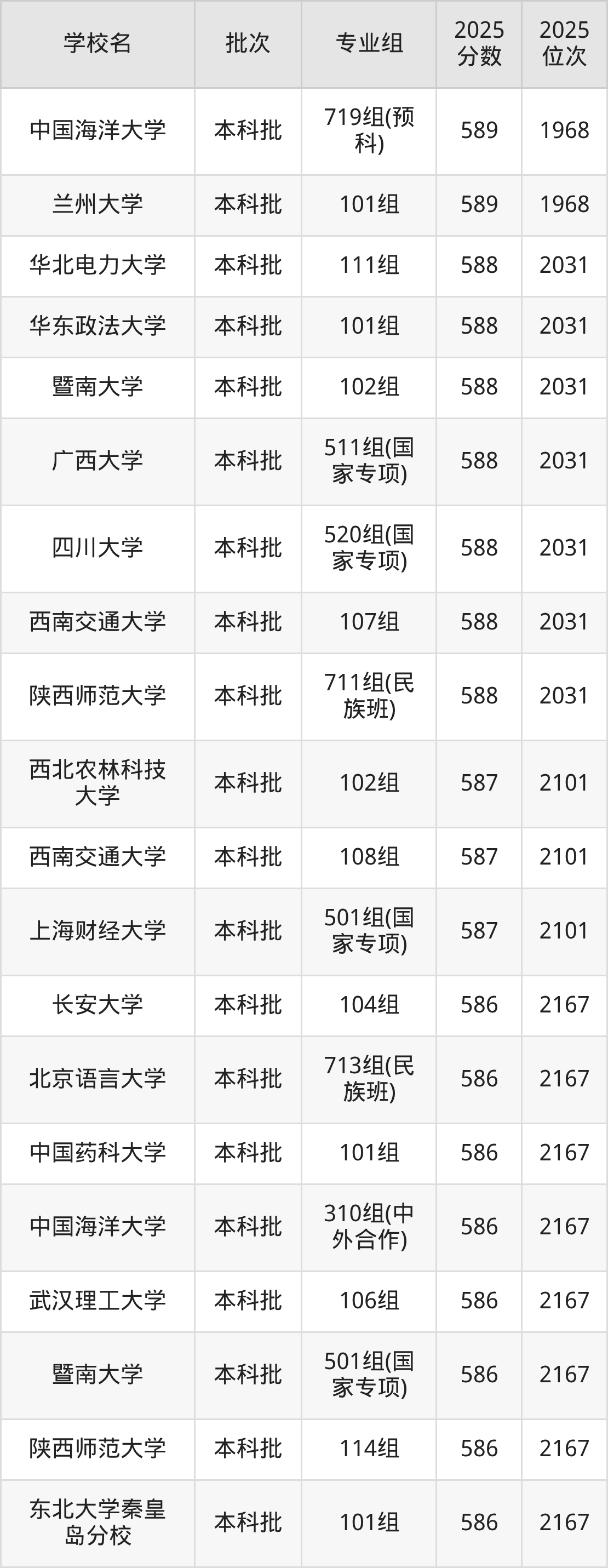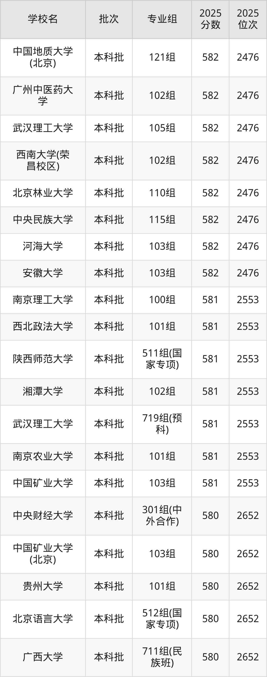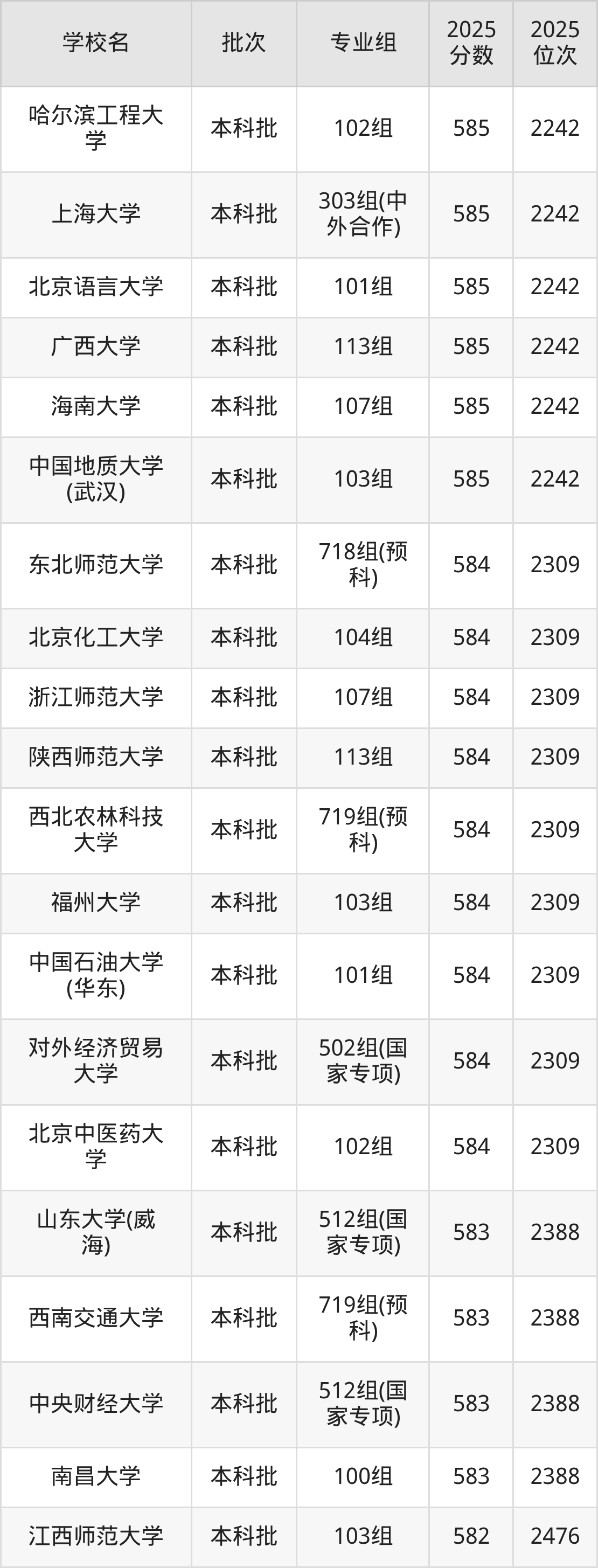 2025年广西高考历史类585分(2168名~2242名)能上的大学有北京语言大学101组、哈尔滨工程大学102组、上海大学303组(中外合作)、中国地质大学(武汉)103组等。
