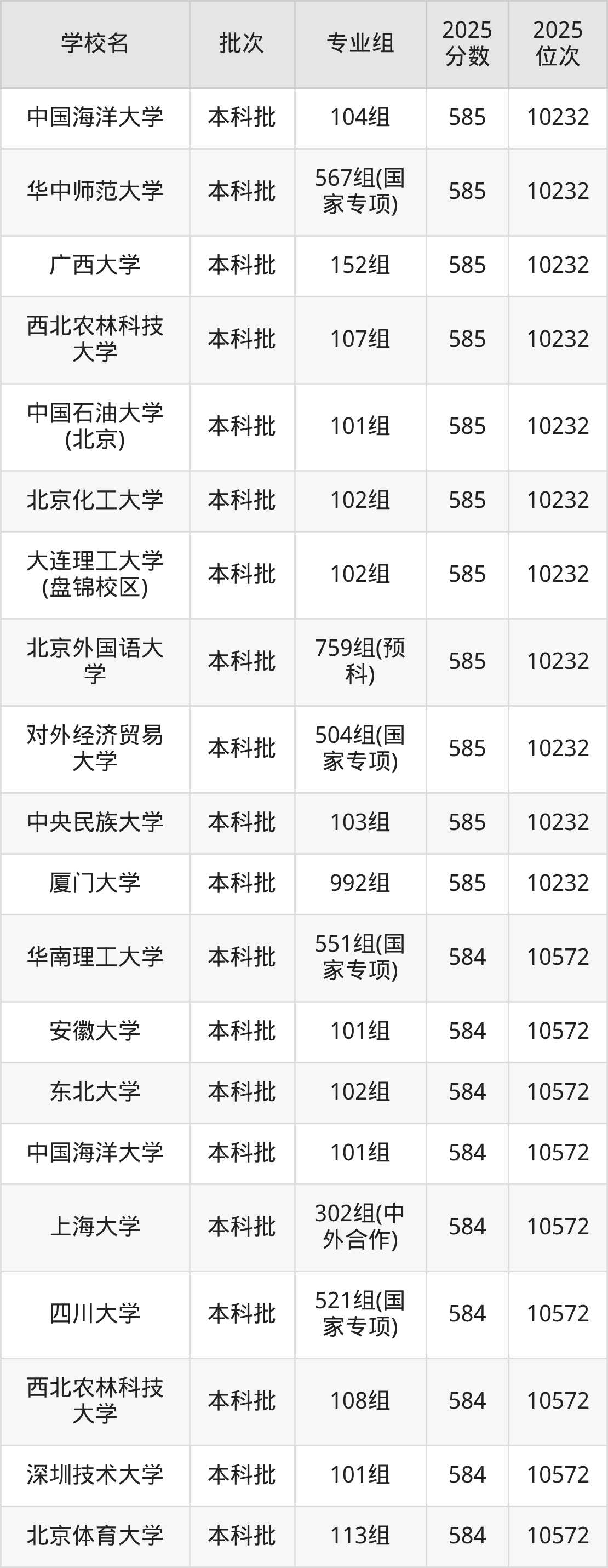 广西高考585分:历史类排名2242位、物理类排名10232位。该分数位次对应能上的大学历史类有北京语言大学101组、哈尔滨工程大学102组;物理类有北京化工大学102组、北京邮电大学502组(国家专项),更多名单如下文所示,2026届考生可参考。