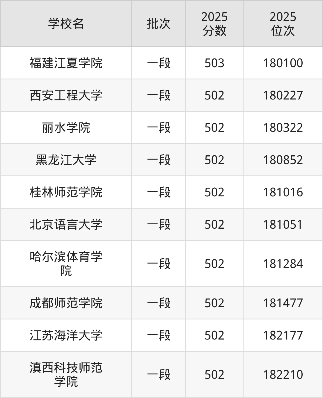 2025年山东高考502分(180147名~182602名)能上的大学有丽水学院、哈尔滨体育学院、滇西科技师范学院、桂林师范学院等。