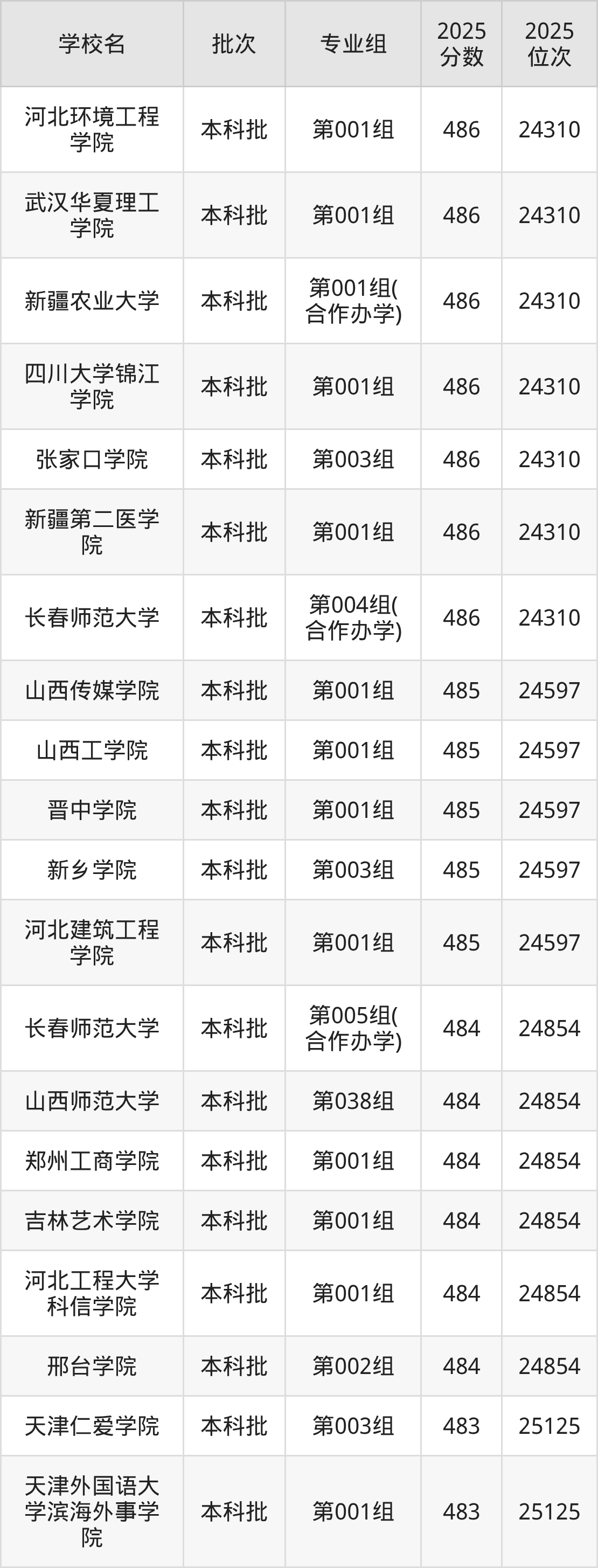 2025年山西高考历史类484分(24598名~24854名)能上的大学有邢台学院第002组、河北工程大学科信学院第001组、长春师范大学第005组(合作办学)、吉林艺术学院第001组等。
