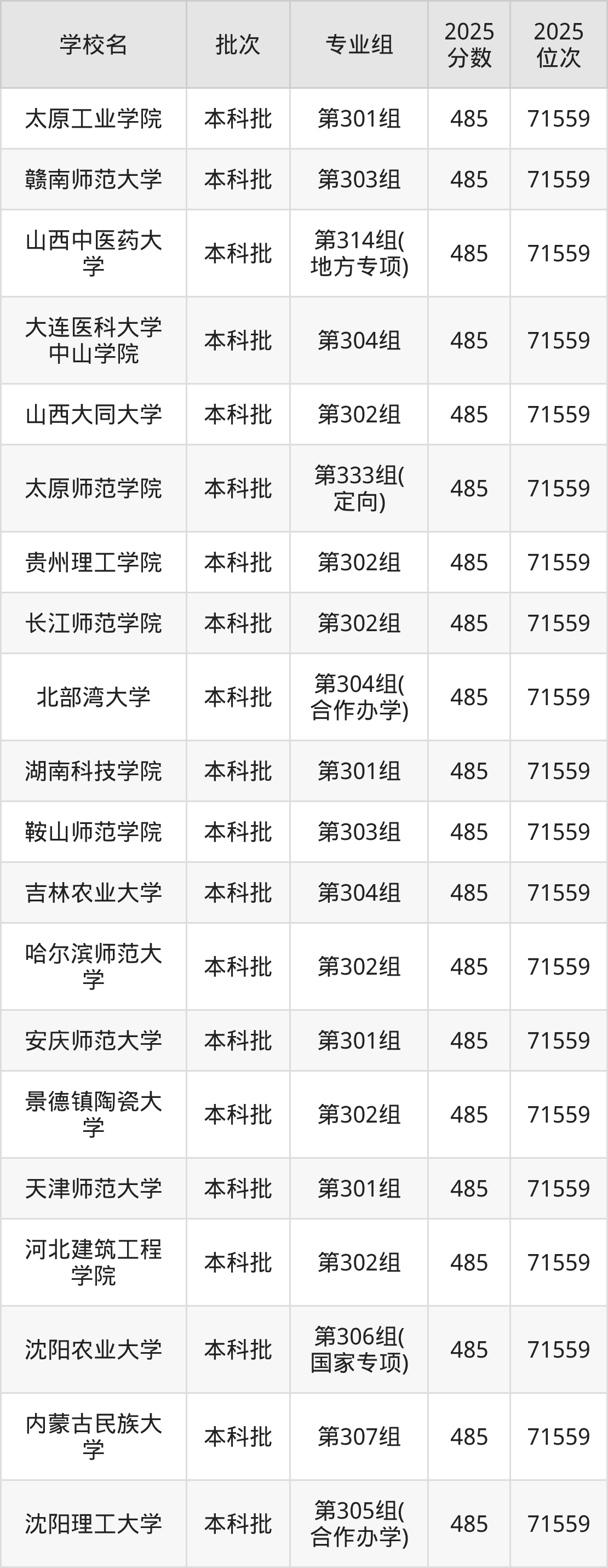 2025年山西高考物理类484分(71560名~72345名)能上的大学有石家庄铁道大学四方学院第303组、内蒙古民族大学第303组、中国医科大学第304组(合作办学)、沈阳大学第302组(合作办学)等。